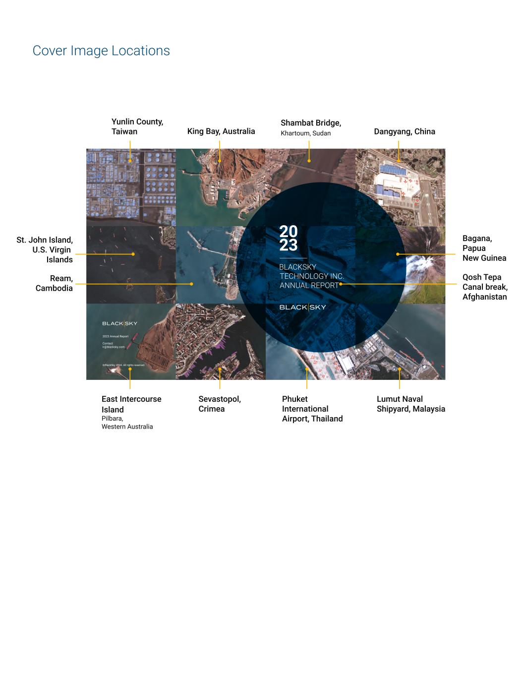 20 23 BLACKSKY TECHNOLOGY INC. ANNUAL REPORT 2023 Annual Report Contact ir@blacksky.com ©BlackSky 2024. All rights reserved. Yunlin County, Taiwan Cover Image Locations Ream, Cambodia East Intercourse Island Pilbara, Western Australia St. John Island, U.S. Virgin Islands Sevastopol, Crimea Phuket International Airport, Thailand Lumut Naval Shipyard, Malaysia Bagana, Papua New Guinea Qosh Tepa Canal break, Afghanistan Shambat Bridge, Khartoum, Sudan Dangyang, China King Bay, Australia
