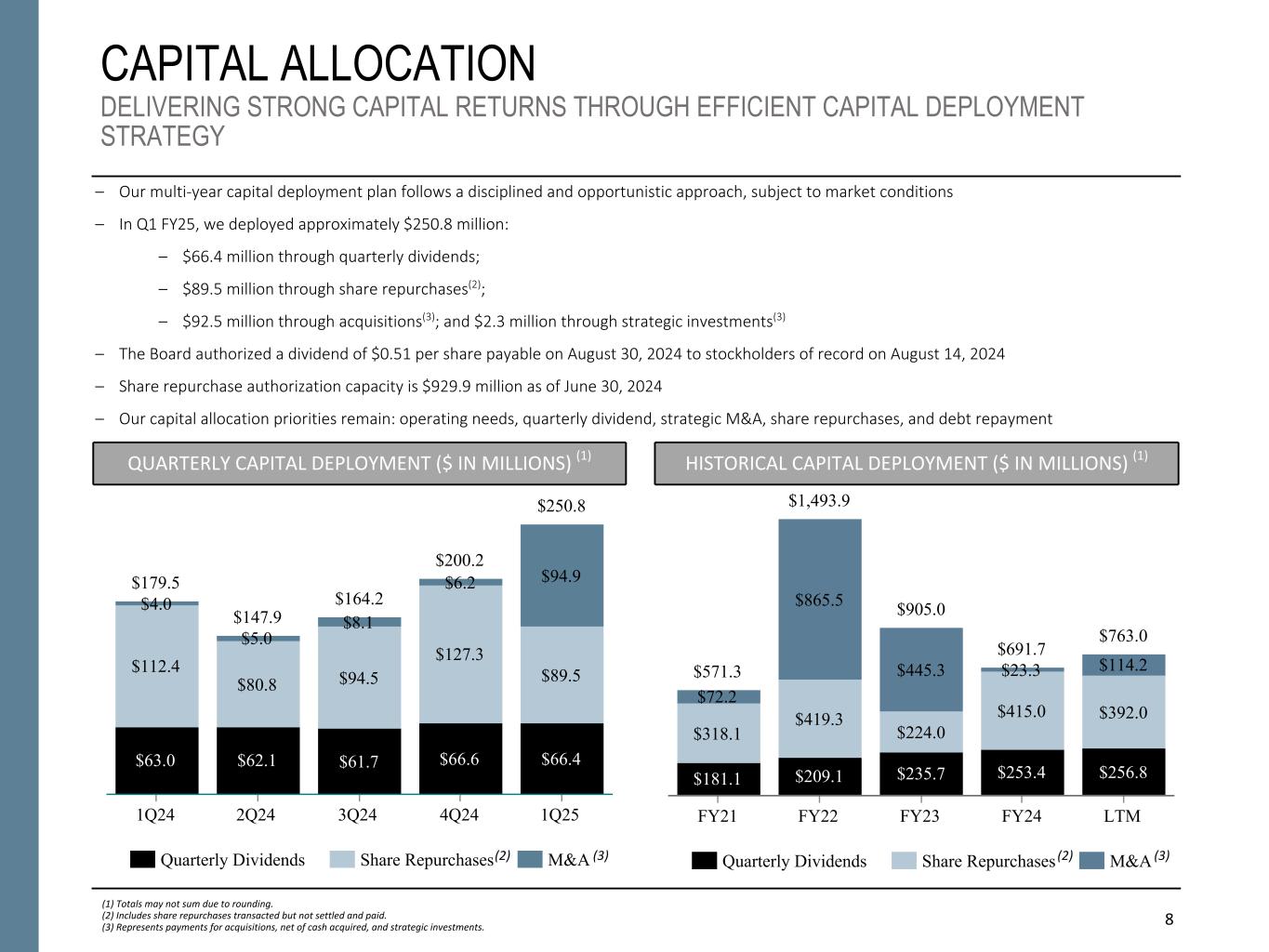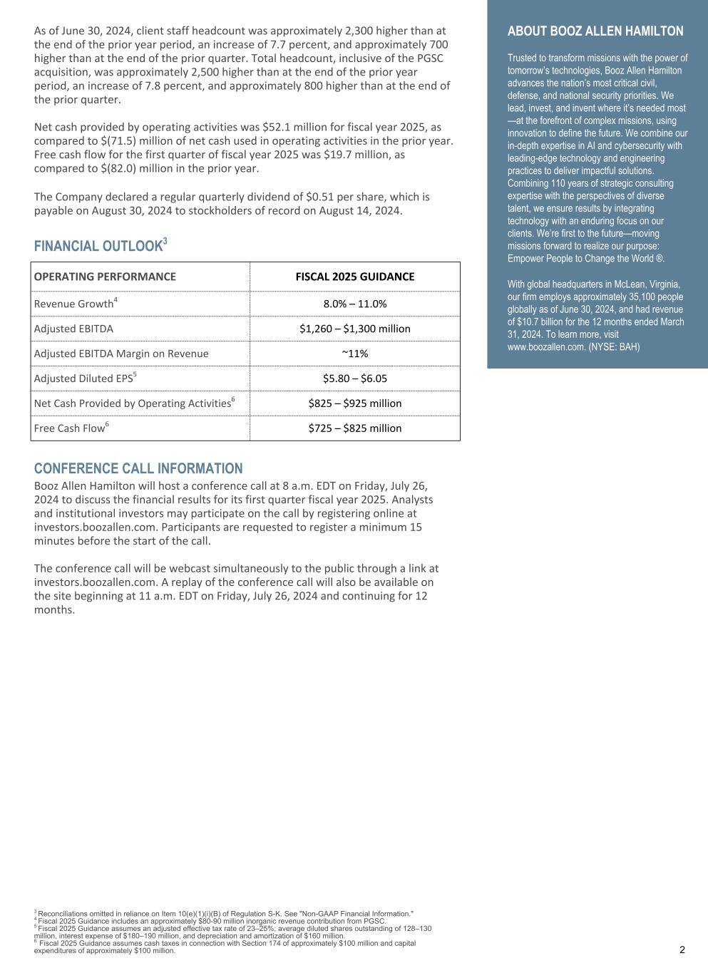FINANCIAL OUTLOOK3 CONFERENCE CALL INFORMATION Booz Allen Hamilton will host a conference call at 8 a.m. EDT on Friday, July 26, 2024 to discuss the financial results for its first quarter fiscal year 2025. Analysts and institutional investors may participate on the call by registering online at investors.boozallen.com. Participants are requested to register a minimum 15 minutes before the start of the call. The conference call will be webcast simultaneously to the public through a link at investors.boozallen.com. A replay of the conference call will also be available on the site beginning at 11 a.m. EDT on Friday, July 26, 2024 and continuing for 12 months. 3 Reconciliations omitted in reliance on Item 10(e)(1)(i)(B) of Regulation S-K. See "Non-GAAP Financial Information." 4 Fiscal 2025 Guidance includes an approximately $80-90 million inorganic revenue contribution from PGSC. 5 Fiscal 2025 Guidance assumes an adjusted effective tax rate of 23–25%; average diluted shares outstanding of 128–130 million, interest expense of $180–190 million, and depreciation and amortization of $160 million. 6 Fiscal 2025 Guidance assumes cash taxes in connection with Section 174 of approximately $100 million and capital expenditures of approximately $100 million. 2 As of June 30, 2024, client staff headcount was approximately 2,300 higher than at the end of the prior year period, an increase of 7.7 percent, and approximately 700 higher than at the end of the prior quarter. Total headcount, inclusive of the PGSC acquisition, was approximately 2,500 higher than at the end of the prior year period, an increase of 7.8 percent, and approximately 800 higher than at the end of the prior quarter. Net cash provided by operating activities was $52.1 million for fiscal year 2025, as compared to $(71.5) million of net cash used in operating activities in the prior year. Free cash flow for the first quarter of fiscal year 2025 was $19.7 million, as compared to $(82.0) million in the prior year. The Company declared a regular quarterly dividend of $0.51 per share, which is payable on August 30, 2024 to stockholders of record on August 14, 2024. ABOUT BOOZ ALLEN HAMILTON Trusted to transform missions with the power of tomorrow’s technologies, Booz Allen Hamilton advances the nation’s most critical civil, defense, and national security priorities. We lead, invest, and invent where it’s needed most —at the forefront of complex missions, using innovation to define the future. We combine our in-depth expertise in AI and cybersecurity with leading-edge technology and engineering practices to deliver impactful solutions. Combining 110 years of strategic consulting expertise with the perspectives of diverse talent, we ensure results by integrating technology with an enduring focus on our clients. We’re first to the future—moving missions forward to realize our purpose: Empower People to Change the World ®. With global headquarters in McLean, Virginia, our firm employs approximately 35,100 people globally as of June 30, 2024, and had revenue of $10.7 billion for the 12 months ended March 31, 2024. To learn more, visit www.boozallen.com. (NYSE: BAH) OPERATING PERFORMANCE FISCAL 2025 GUIDANCE Revenue Growth4 8.0% – 11.0% Adjusted EBITDA $1,260 – $1,300 million Adjusted EBITDA Margin on Revenue ~11% Adjusted Diluted EPS5 $5.80 – $6.05 Net Cash Provided by Operating Activities6 $825 – $925 million Free Cash Flow6 $725 – $825 million