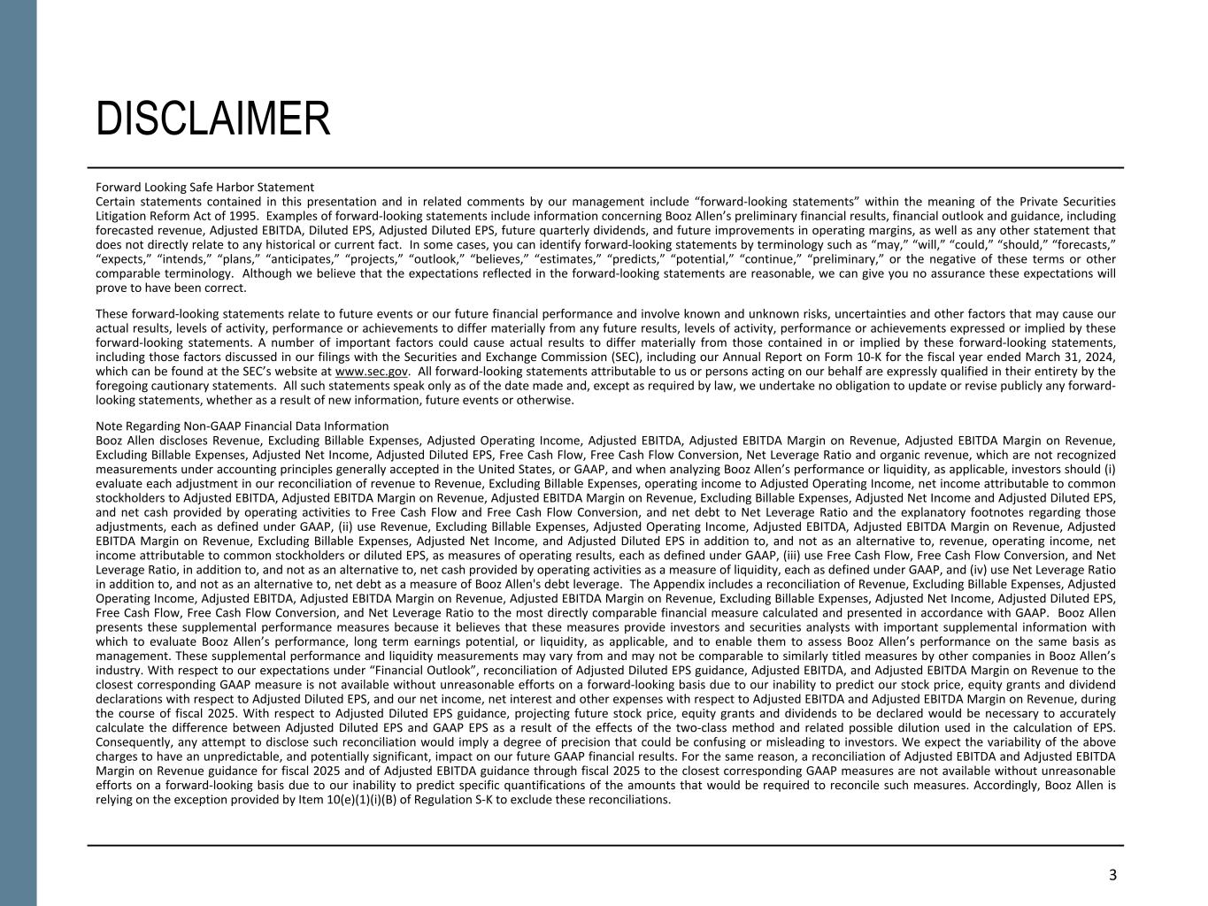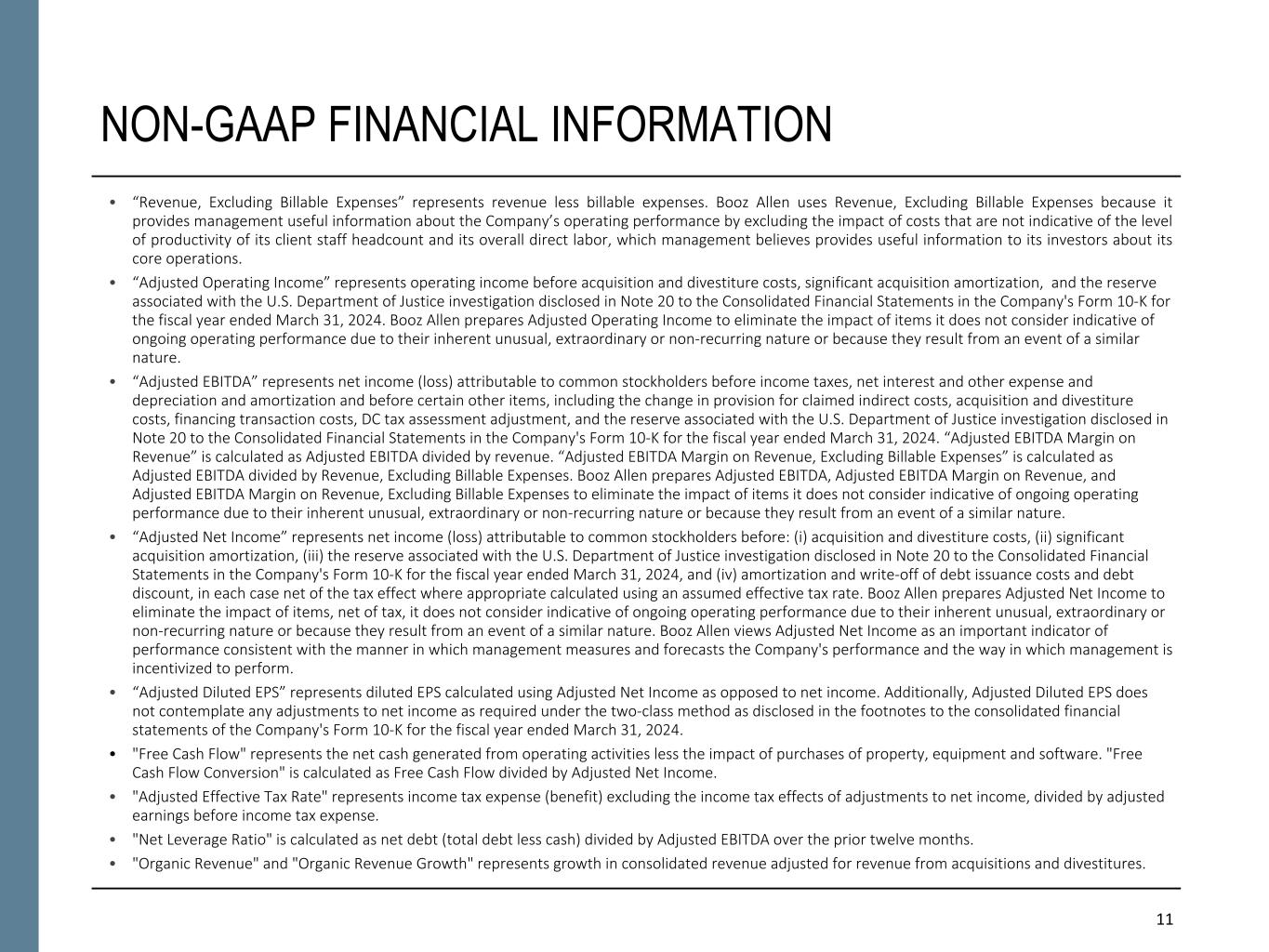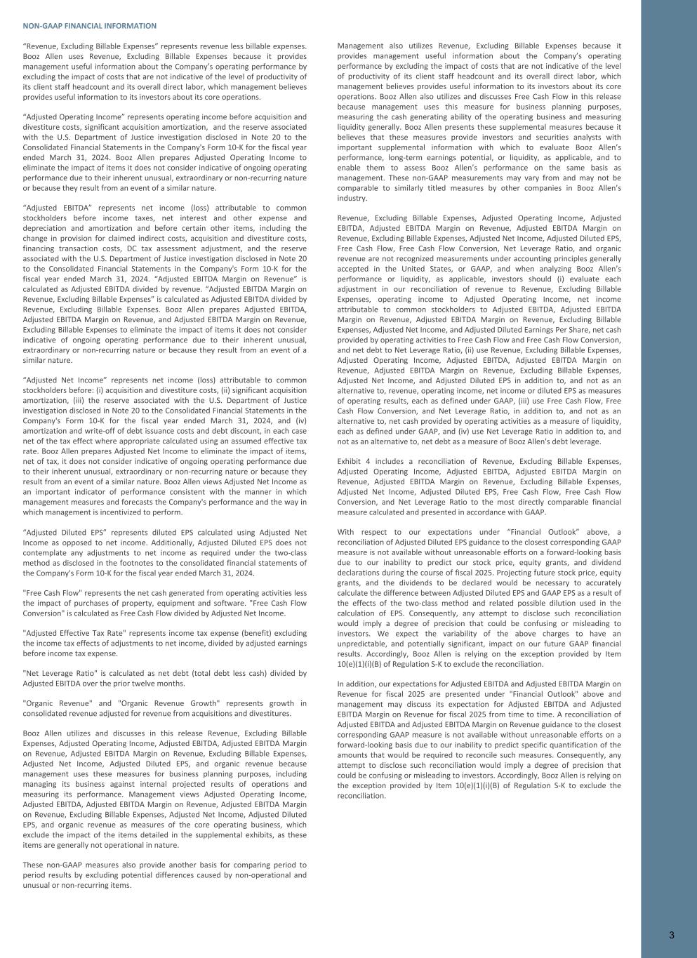 NON-GAAP FINANCIAL INFORMATION “Revenue, Excluding Billable Expenses” represents revenue less billable expenses. Booz Allen uses Revenue, Excluding Billable Expenses because it provides management useful information about the Company’s operating performance by excluding the impact of costs that are not indicative of the level of productivity of its client staff headcount and its overall direct labor, which management believes provides useful information to its investors about its core operations. “Adjusted Operating Income” represents operating income before acquisition and divestiture costs, significant acquisition amortization, and the reserve associated with the U.S. Department of Justice investigation disclosed in Note 20 to the Consolidated Financial Statements in the Company's Form 10-K for the fiscal year ended March 31, 2024. Booz Allen prepares Adjusted Operating Income to eliminate the impact of items it does not consider indicative of ongoing operating performance due to their inherent unusual, extraordinary or non-recurring nature or because they result from an event of a similar nature. “Adjusted EBITDA” represents net income (loss) attributable to common stockholders before income taxes, net interest and other expense and depreciation and amortization and before certain other items, including the change in provision for claimed indirect costs, acquisition and divestiture costs, financing transaction costs, DC tax assessment adjustment, and the reserve associated with the U.S. Department of Justice investigation disclosed in Note 20 to the Consolidated Financial Statements in the Company's Form 10-K for the fiscal year ended March 31, 2024. “Adjusted EBITDA Margin on Revenue” is calculated as Adjusted EBITDA divided by revenue. “Adjusted EBITDA Margin on Revenue, Excluding Billable Expenses” is calculated as Adjusted EBITDA divided by Revenue, Excluding Billable Expenses. Booz Allen prepares Adjusted EBITDA, Adjusted EBITDA Margin on Revenue, and Adjusted EBITDA Margin on Revenue, Excluding Billable Expenses to eliminate the impact of items it does not consider indicative of ongoing operating performance due to their inherent unusual, extraordinary or non-recurring nature or because they result from an event of a similar nature. “Adjusted Net Income” represents net income (loss) attributable to common stockholders before: (i) acquisition and divestiture costs, (ii) significant acquisition amortization, (iii) the reserve associated with the U.S. Department of Justice investigation disclosed in Note 20 to the Consolidated Financial Statements in the Company's Form 10-K for the fiscal year ended March 31, 2024, and (iv) amortization and write-off of debt issuance costs and debt discount, in each case net of the tax effect where appropriate calculated using an assumed effective tax rate. Booz Allen prepares Adjusted Net Income to eliminate the impact of items, net of tax, it does not consider indicative of ongoing operating performance due to their inherent unusual, extraordinary or non-recurring nature or because they result from an event of a similar nature. Booz Allen views Adjusted Net Income as an important indicator of performance consistent with the manner in which management measures and forecasts the Company's performance and the way in which management is incentivized to perform. “Adjusted Diluted EPS” represents diluted EPS calculated using Adjusted Net Income as opposed to net income. Additionally, Adjusted Diluted EPS does not contemplate any adjustments to net income as required under the two-class method as disclosed in the footnotes to the consolidated financial statements of the Company's Form 10-K for the fiscal year ended March 31, 2024. "Free Cash Flow" represents the net cash generated from operating activities less the impact of purchases of property, equipment and software. "Free Cash Flow Conversion" is calculated as Free Cash Flow divided by Adjusted Net Income. "Adjusted Effective Tax Rate" represents income tax expense (benefit) excluding the income tax effects of adjustments to net income, divided by adjusted earnings before income tax expense. "Net Leverage Ratio" is calculated as net debt (total debt less cash) divided by Adjusted EBITDA over the prior twelve months. "Organic Revenue" and "Organic Revenue Growth" represents growth in consolidated revenue adjusted for revenue from acquisitions and divestitures. Booz Allen utilizes and discusses in this release Revenue, Excluding Billable Expenses, Adjusted Operating Income, Adjusted EBITDA, Adjusted EBITDA Margin on Revenue, Adjusted EBITDA Margin on Revenue, Excluding Billable Expenses, Adjusted Net Income, Adjusted Diluted EPS, and organic revenue because management uses these measures for business planning purposes, including managing its business against internal projected results of operations and measuring its performance. Management views Adjusted Operating Income, Adjusted EBITDA, Adjusted EBITDA Margin on Revenue, Adjusted EBITDA Margin on Revenue, Excluding Billable Expenses, Adjusted Net Income, Adjusted Diluted EPS, and organic revenue as measures of the core operating business, which exclude the impact of the items detailed in the supplemental exhibits, as these items are generally not operational in nature. These non-GAAP measures also provide another basis for comparing period to period results by excluding potential differences caused by non-operational and unusual or non-recurring items. Management also utilizes Revenue, Excluding Billable Expenses because it provides management useful information about the Company’s operating performance by excluding the impact of costs that are not indicative of the level of productivity of its client staff headcount and its overall direct labor, which management believes provides useful information to its investors about its core operations. Booz Allen also utilizes and discusses Free Cash Flow in this release becau