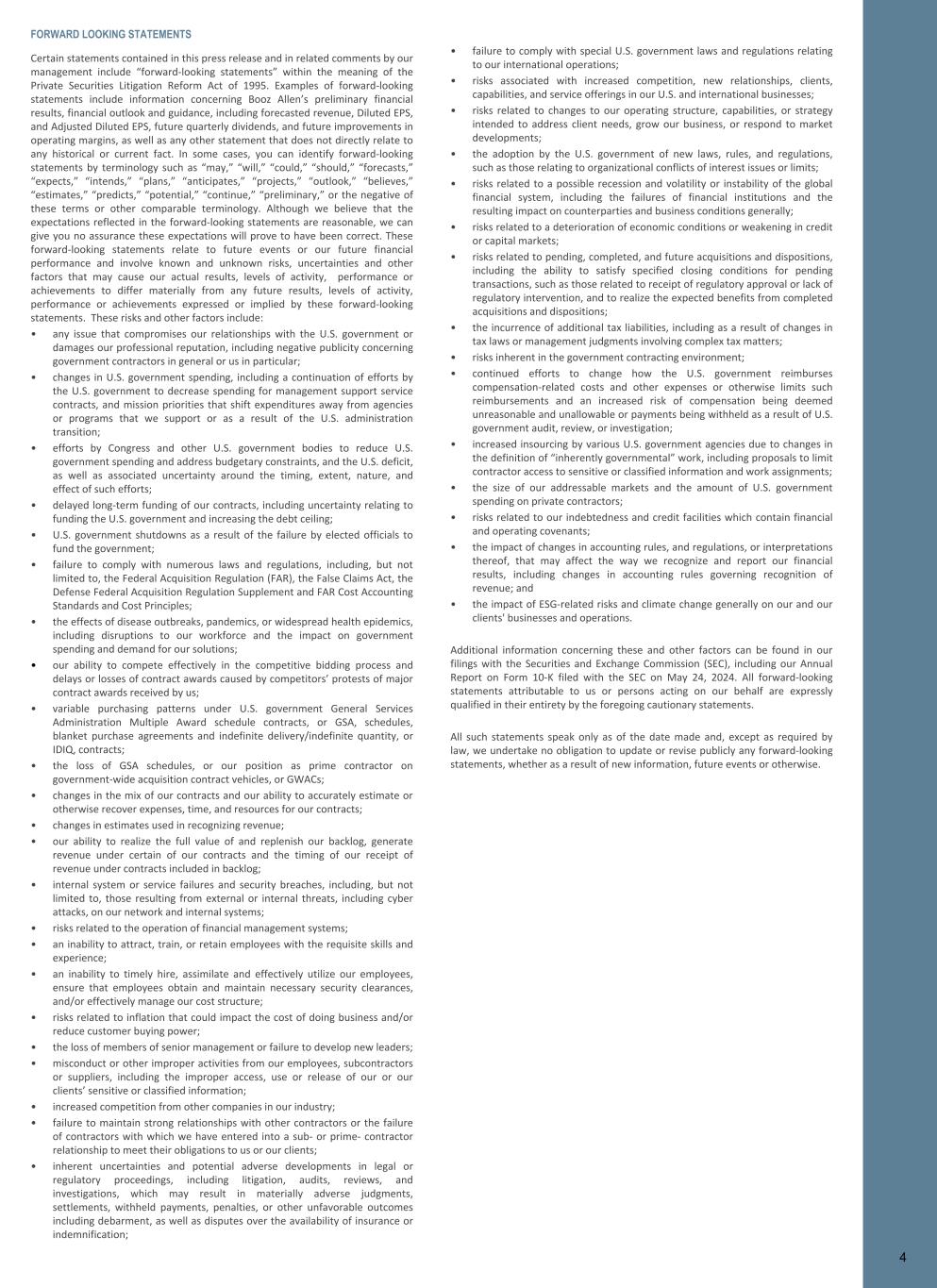 FORWARD LOOKING STATEMENTS Certain statements contained in this press release and in related comments by our management include “forward-looking statements” within the meaning of the Private Securities Litigation Reform Act of 1995. Examples of forward-looking statements include information concerning Booz Allen’s preliminary financial results, financial outlook and guidance, including forecasted revenue, Diluted EPS, and Adjusted Diluted EPS, future quarterly dividends, and future improvements in operating margins, as well as any other statement that does not directly relate to any historical or current fact. In some cases, you can identify forward-looking statements by terminology such as “may,” “will,” “could,” “should,” “forecasts,” “expects,” “intends,” “plans,” “anticipates,” “projects,” “outlook,” “believes,” “estimates,” “predicts,” “potential,” “continue,” “preliminary,” or the negative of these terms or other comparable terminology. Although we believe that the expectations reflected in the forward-looking statements are reasonable, we can give you no assurance these expectations will prove to have been correct. These forward-looking statements relate to future events or our future financial performance and involve known and unknown risks, uncertainties and other factors that may cause our actual results, levels of activity, performance or achievements to differ materially from any future results, levels of activity, performance or achievements expressed or implied by these forward-looking statements. These risks and other factors include: • any issue that compromises our relationships with the U.S. government or damages our professional reputation, including negative publicity concerning government contractors in general or us in particular; • changes in U.S. government spending, including a continuation of efforts by the U.S. government to decrease spending for management support service contracts, and mission priorities that shift expenditures away from agencies or programs that we support or as a result of the U.S. administration transition; • efforts by Congress and other U.S. government bodies to reduce U.S. government spending and address budgetary constraints, and the U.S. deficit, as well as associated uncertainty around the timing, extent, nature, and effect of such efforts; • delayed long-term funding of our contracts, including uncertainty relating to funding the U.S. government and increasing the debt ceiling; • U.S. government shutdowns as a result of the failure by elected officials to fund the government; • failure to comply with numerous laws and regulations, including, but not limited to, the Federal Acquisition Regulation (FAR), the False Claims Act, the Defense Federal Acquisition Regulation Supplement and FAR Cost Accounting Standards and Cost Principles; • the effects of disease outbreaks, pandemics, or widespread health epidemics, including disruptions to our workforce and the impact on government spending and demand for our solutions; • our ability to compete effectively in the competitive bidding process and delays or losses of contract awards caused by competitors’ protests of major contract awards received by us; • variable purchasing patterns under U.S. government General Services Administration Multiple Award schedule contracts, or GSA, schedules, blanket purchase agreements and indefinite delivery/indefinite quantity, or IDIQ, contracts; • the loss of GSA schedules, or our position as prime contractor on government-wide acquisition contract vehicles, or GWACs; • changes in the mix of our contracts and our ability to accurately estimate or otherwise recover expenses, time, and resources for our contracts; • changes in estimates used in recognizing revenue; • our ability to realize the full value of and replenish our backlog, generate revenue under certain of our contracts and the timing of our receipt of revenue under contracts included in backlog; • internal system or service failures and security breaches, including, but not limited to, those resulting from external or internal threats, including cyber attacks, on our network and internal systems; • risks related to the operation of financial management systems; • an inability to attract, train, or retain employees with the requisite skills and experience; • an inability to timely hire, assimilate and effectively utilize our employees, ensure that employees obtain and maintain necessary security clearances, and/or effectively manage our cost structure; • risks related to inflation that could impact the cost of doing business and/or reduce customer buying power; • the loss of members of senior management or failure to develop new leaders; • misconduct or other improper activities from our employees, subcontractors or suppliers, including the improper access, use or release of our or our clients’ sensitive or classified information; • increased competition from other companies in our industry; • failure to maintain strong relationships with other contractors or the failure of contractors with which we have entered into a sub- or prime- contractor relationship to meet their obligations to us or our clients; • inherent uncertainties and potential adverse developments in legal or regulatory proceedings, including litigation, audits, reviews, and investigations, which may result in materially adverse judgments, settlements, withheld payments, penalties, or other unfavorable outcomes including debarment, as well as disputes over the availability of insurance or indemnification; • failure to comply with special U.S. government laws and regulations relating to our international operations; • risks associated with increased competition, new relationships, clients, capabilities, and service offerings in our U.S. and international businesses; • risks related to changes to our opera