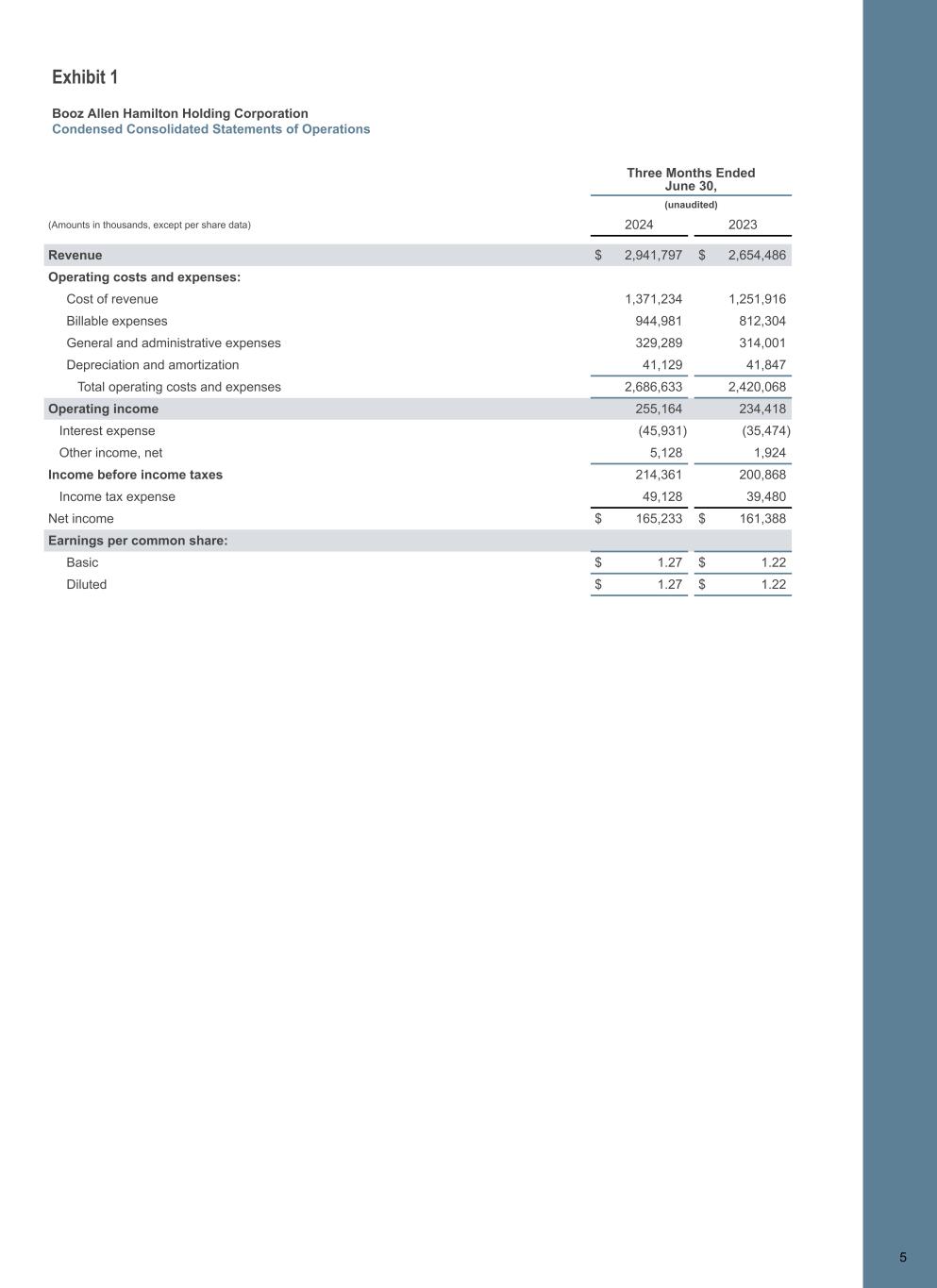 Exhibit 1 Booz Allen Hamilton Holding Corporation Condensed Consolidated Statements of Operations 5 Three Months Ended June 30, (unaudited) (Amounts in thousands, except per share data) 2024 2023 Revenue $ 2,941,797 $ 2,654,486 Operating costs and expenses: Cost of revenue 1,371,234 1,251,916 Billable expenses 944,981 812,304 General and administrative expenses 329,289 314,001 Depreciation and amortization 41,129 41,847 Total operating costs and expenses 2,686,633 2,420,068 Operating income 255,164 234,418 Interest expense (45,931) (35,474) Other income, net 5,128 1,924 Income before income taxes 214,361 200,868 Income tax expense 49,128 39,480 Net income $ 165,233 $ 161,388 Earnings per common share: Basic $ 1.27 $ 1.22 Diluted $ 1.27 $ 1.22 5