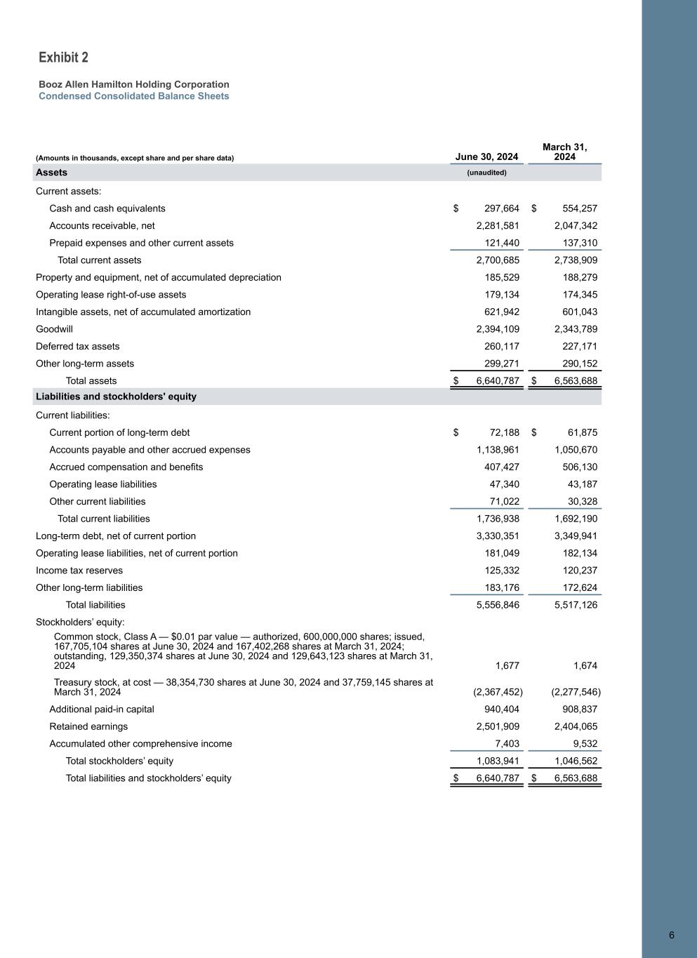 Exhibit 2 Booz Allen Hamilton Holding Corporation Condensed Consolidated Balance Sheets (Amounts in thousands, except share and per share data) June 30, 2024 March 31, 2024 Assets (unaudited) Current assets: Cash and cash equivalents $ 297,664 $ 554,257 Accounts receivable, net 2,281,581 2,047,342 Prepaid expenses and other current assets 121,440 137,310 Total current assets 2,700,685 2,738,909 Property and equipment, net of accumulated depreciation 185,529 188,279 Operating lease right-of-use assets 179,134 174,345 Intangible assets, net of accumulated amortization 621,942 601,043 Goodwill 2,394,109 2,343,789 Deferred tax assets 260,117 227,171 Other long-term assets 299,271 290,152 Total assets $ 6,640,787 $ 6,563,688 Liabilities and stockholders' equity Current liabilities: Current portion of long-term debt $ 72,188 $ 61,875 Accounts payable and other accrued expenses 1,138,961 1,050,670 Accrued compensation and benefits 407,427 506,130 Operating lease liabilities 47,340 43,187 Other current liabilities 71,022 30,328 Total current liabilities 1,736,938 1,692,190 Long-term debt, net of current portion 3,330,351 3,349,941 Operating lease liabilities, net of current portion 181,049 182,134 Income tax reserves 125,332 120,237 Other long-term liabilities 183,176 172,624 Total liabilities 5,556,846 5,517,126 Stockholders’ equity: Common stock, Class A — $0.01 par value — authorized, 600,000,000 shares; issued, 167,705,104 shares at June 30, 2024 and 167,402,268 shares at March 31, 2024; outstanding, 129,350,374 shares at June 30, 2024 and 129,643,123 shares at March 31, 2024 1,677 1,674 Treasury stock, at cost — 38,354,730 shares at June 30, 2024 and 37,759,145 shares at March 31, 2024 (2,367,452) (2,277,546) Additional paid-in capital 940,404 908,837 Retained earnings 2,501,909 2,404,065 Accumulated other comprehensive income 7,403 9,532 Total stockholders’ equity 1,083,941 1,046,562 Total liabilities and stockholders’ equity $ 6,640,787 $ 6,563,688 66