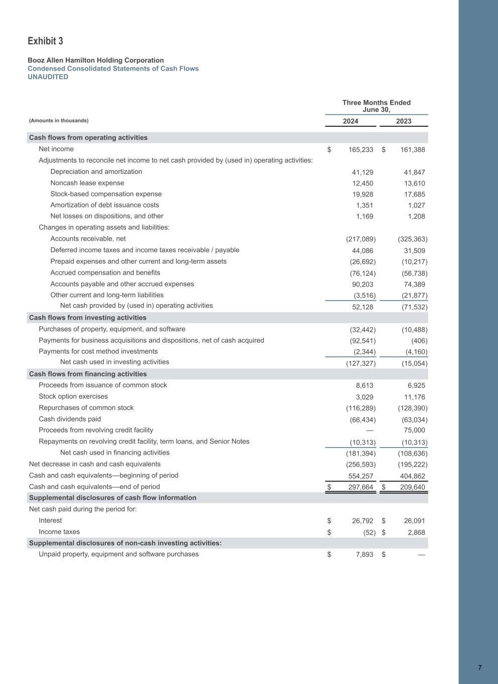 Exhibit 3 Booz Allen Hamilton Holding Corporation Condensed Consolidated Statements of Cash Flows UNAUDITED 7 Three Months Ended June 30, (Amounts in thousands) 2024 2023 Cash flows from operating activities Net income $ 165,233 $ 161,388 Adjustments to reconcile net income to net cash provided by (used in) operating activities: Depreciation and amortization 41,129 41,847 Noncash lease expense 12,450 13,610 Stock-based compensation expense 19,928 17,685 Amortization of debt issuance costs 1,351 1,027 Net losses on dispositions, and other 1,169 1,208 Changes in operating assets and liabilities: Accounts receivable, net (217,089) (325,363) Deferred income taxes and income taxes receivable / payable 44,086 31,509 Prepaid expenses and other current and long-term assets (26,692) (10,217) Accrued compensation and benefits (76,124) (56,738) Accounts payable and other accrued expenses 90,203 74,389 Other current and long-term liabilities (3,516) (21,877) Net cash provided by (used in) operating activities 52,128 (71,532) Cash flows from investing activities Purchases of property, equipment, and software (32,442) (10,488) Payments for business acquisitions and dispositions, net of cash acquired (92,541) (406) Payments for cost method investments (2,344) (4,160) Net cash used in investing activities (127,327) (15,054) Cash flows from financing activities Proceeds from issuance of common stock 8,613 6,925 Stock option exercises 3,029 11,176 Repurchases of common stock (116,289) (128,390) Cash dividends paid (66,434) (63,034) Proceeds from revolving credit facility — 75,000 Repayments on revolving credit facility, term loans, and Senior Notes (10,313) (10,313) Net cash used in financing activities (181,394) (108,636) Net decrease in cash and cash equivalents (256,593) (195,222) Cash and cash equivalents––beginning of period 554,257 404,862 Cash and cash equivalents––end of period $ 297,664 $ 209,640 Supplemental disclosures of cash flow information Net cash paid during the period for: Interest $ 26,792 $ 26,091 Income taxes $ (52) $ 2,868 Supplemental disclosures of non-cash investing activities: Unpaid property, equipment and software purchases $ 7,893 $ — 7