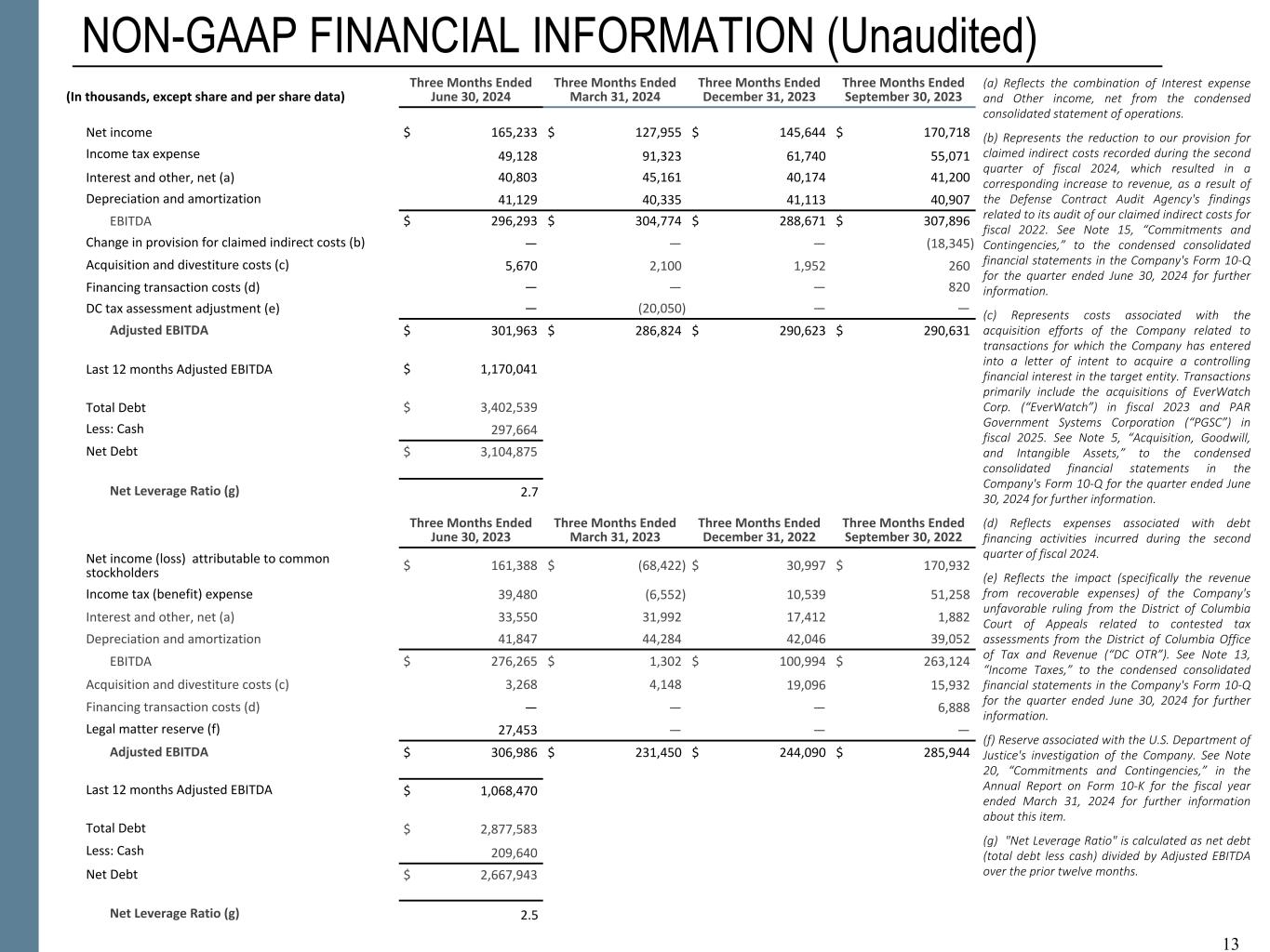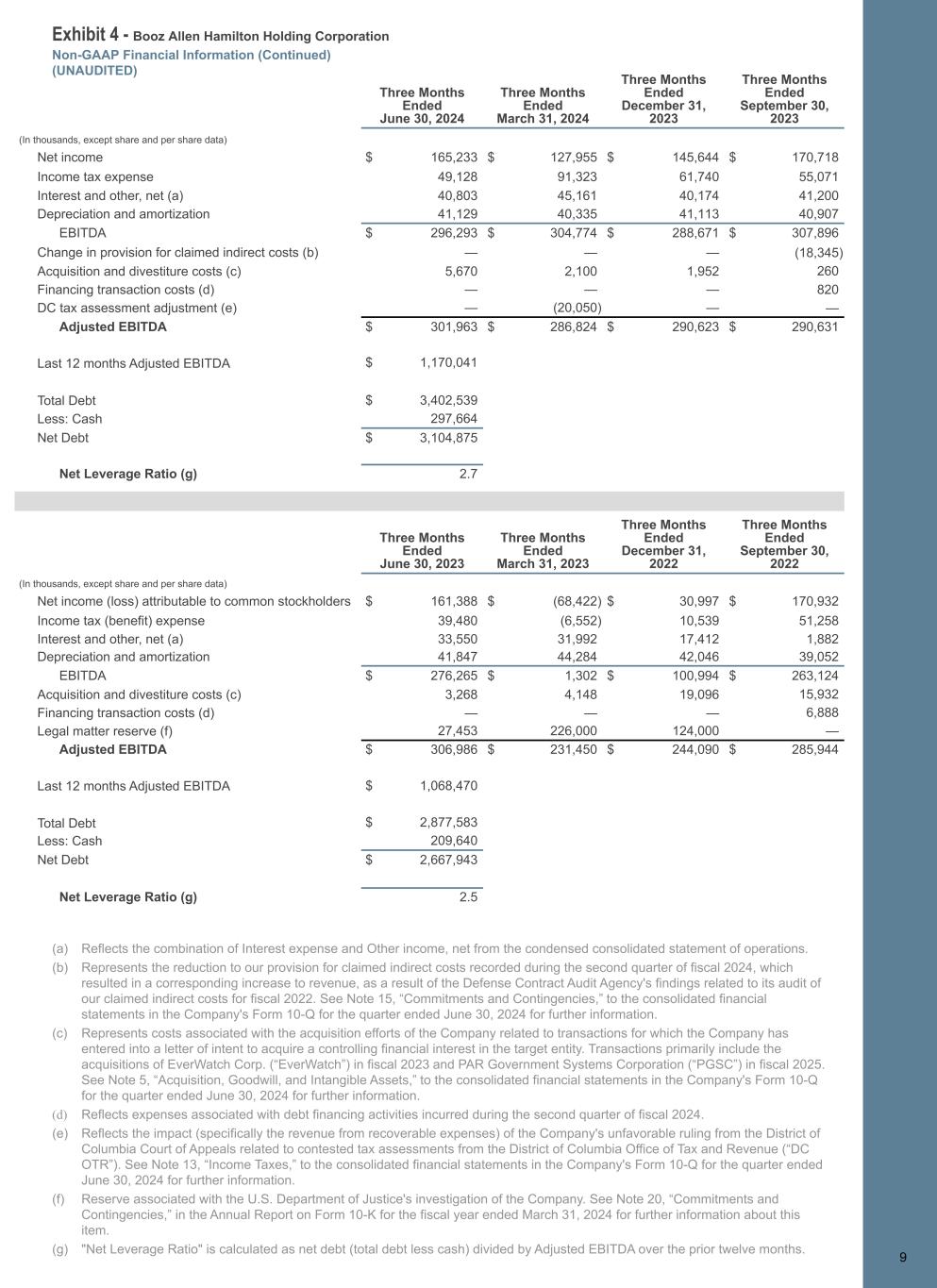 Exhibit 4 - Booz Allen Hamilton Holding Corporation Non-GAAP Financial Information (Continued) (UNAUDITED) 9 Three Months Ended June 30, 2024 Three Months Ended March 31, 2024 Three Months Ended December 31, 2023 Three Months Ended September 30, 2023 (In thousands, except share and per share data) Net income $ 165,233 $ 127,955 $ 145,644 $ 170,718 Income tax expense 49,128 91,323 61,740 55,071 Interest and other, net (a) 40,803 45,161 40,174 41,200 Depreciation and amortization 41,129 40,335 41,113 40,907 EBITDA $ 296,293 $ 304,774 $ 288,671 $ 307,896 Change in provision for claimed indirect costs (b) — — — (18,345) Acquisition and divestiture costs (c) 5,670 2,100 1,952 260 Financing transaction costs (d) — — — 820 DC tax assessment adjustment (e) — (20,050) — — Adjusted EBITDA $ 301,963 $ 286,824 $ 290,623 $ 290,631 Last 12 months Adjusted EBITDA $ 1,170,041 Total Debt $ 3,402,539 Less: Cash 297,664 Net Debt $ 3,104,875 Net Leverage Ratio (g) 2.7 Three Months Ended June 30, 2023 Three Months Ended March 31, 2023 Three Months Ended December 31, 2022 Three Months Ended September 30, 2022 (In thousands, except share and per share data) Net income (loss) attributable to common stockholders $ 161,388 $ (68,422) $ 30,997 $ 170,932 Income tax (benefit) expense 39,480 (6,552) 10,539 51,258 Interest and other, net (a) 33,550 31,992 17,412 1,882 Depreciation and amortization 41,847 44,284 42,046 39,052 EBITDA $ 276,265 $ 1,302 $ 100,994 $ 263,124 Acquisition and divestiture costs (c) 3,268 4,148 19,096 15,932 Financing transaction costs (d) — — — 6,888 Legal matter reserve (f) 27,453 226,000 124,000 — Adjusted EBITDA $ 306,986 $ 231,450 $ 244,090 $ 285,944 Last 12 months Adjusted EBITDA $ 1,068,470 Total Debt $ 2,877,583 Less: Cash 209,640 Net Debt $ 2,667,943 Net Leverage Ratio (g) 2.5 9 (a) Reflects the combination of Interest expense and Other income, net from the condensed consolidated statement of operations. (b) Represents the reduction to our provision for claimed indirect costs recorded during the second quarter of fiscal 2024, which resulted in a corresponding increase to revenue, as a result of the Defense Contract Audit Agency's findings related to its audit of our claimed indirect costs for fiscal 2022. See Note 15, “Commitments and Contingencies,” to the consolidated financial statements in the Company's Form 10-Q for the quarter ended June 30, 2024 for further information. (c) Represents costs associated with the acquisition efforts of the Company related to transactions for which the Company has entered into a letter of intent to acquire a controlling financial interest in the target entity. Transactions primarily include the acquisitions of EverWatch Corp. (“EverWatch”) in fiscal 2023 and PAR Government Systems Corporation (“PGSC”) in fiscal 2025. See Note 5, “Acquisition, Goodwill, and Intangible Assets,” to the consolidated financial statements in the Company's Form 10-Q for the quarter ended June 30, 2024 for further information. (d) Reflects expenses associated with debt financing activities incurred during the second quarter of fiscal 2024. (e) Reflects the impact (specifically the revenue from recoverable expenses) of the Company's unfavorable ruling from the District of Columbia Court of Appeals related to contested tax assessments from the District of Columbia Office of Tax and Revenue (“DC OTR”). See Note 13, “Income Taxes,” to the consolidated financial statements in the Company's Form 10-Q for the quarter ended June 30, 2024 for further information. (f) Reserve associated with the U.S. Department of Justice's investigation of the Company. See Note 20, “Commitments and Contingencies,” in the Annual Report on Form 10-K for the fiscal year ended March 31, 2024 for further information about this item. (g) "Net Leverage Ratio" is calculated as net debt (total debt less cash) divided by Adjusted EBITDA over the prior twelve months.