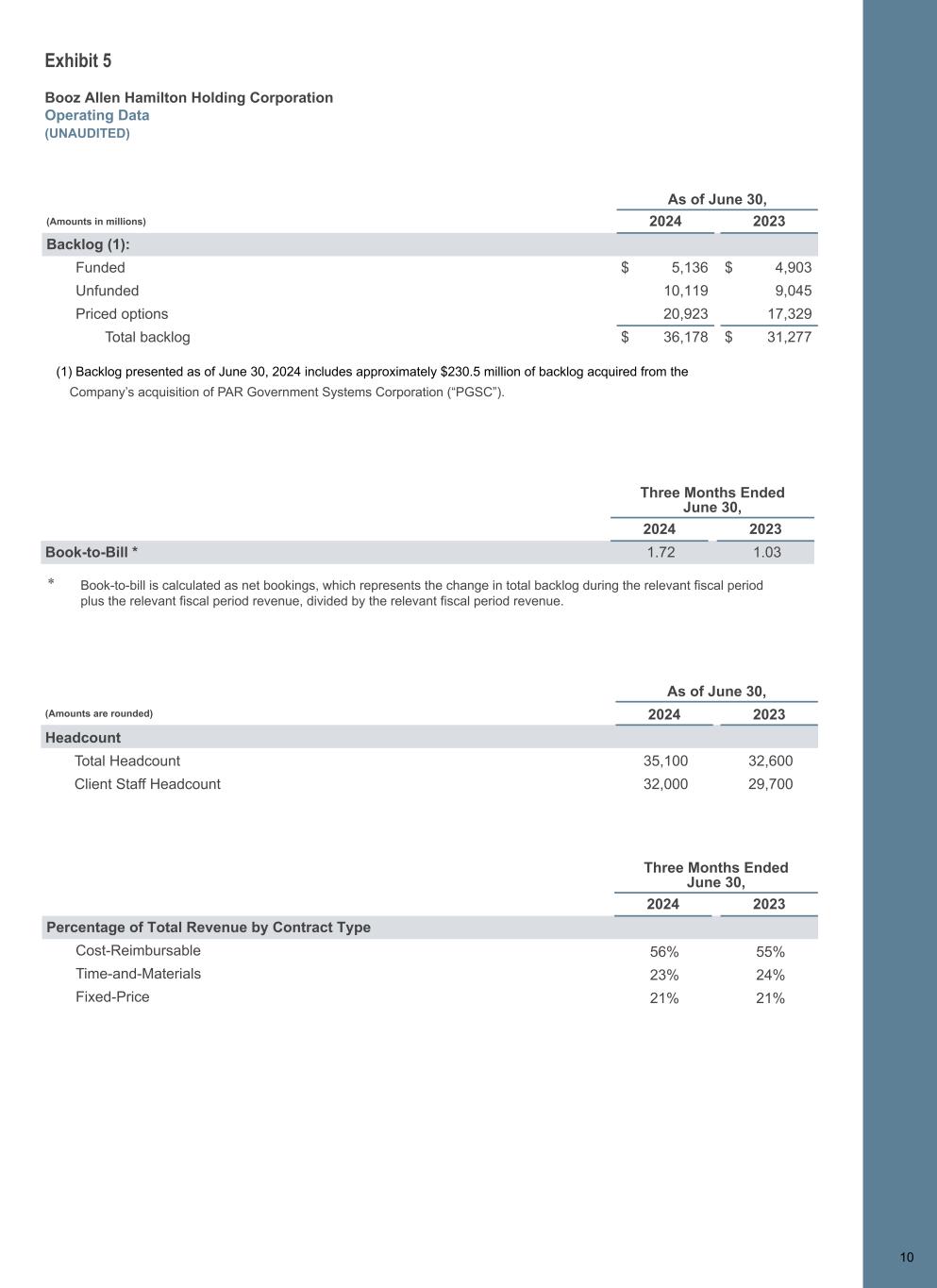 1 0 Exhibit 5 Booz Allen Hamilton Holding Corporation Operating Data (UNAUDITED) As of June 30, (Amounts in millions) 2024 2023 Backlog (1): Funded $ 5,136 $ 4,903 Unfunded 10,119 9,045 Priced options 20,923 17,329 Total backlog $ 36,178 $ 31,277 (1) Backlog presented as of June 30, 2024 includes approximately $230.5 million of backlog acquired from the Company’s acquisition of PAR Government Systems Corporation (“PGSC”). Three Months Ended June 30, 2024 2023 Book-to-Bill * 1.72 1.03 * Book-to-bill is calculated as net bookings, which represents the change in total backlog during the relevant fiscal period plus the relevant fiscal period revenue, divided by the relevant fiscal period revenue. As of June 30, (Amounts are rounded) 2024 2023 Headcount Total Headcount 35,100 32,600 Client Staff Headcount 32,000 29,700 Three Months Ended June 30, 2024 2023 Percentage of Total Revenue by Contract Type Cost-Reimbursable 56% 55% Time-and-Materials 23% 24% Fixed-Price 21% 21% 10