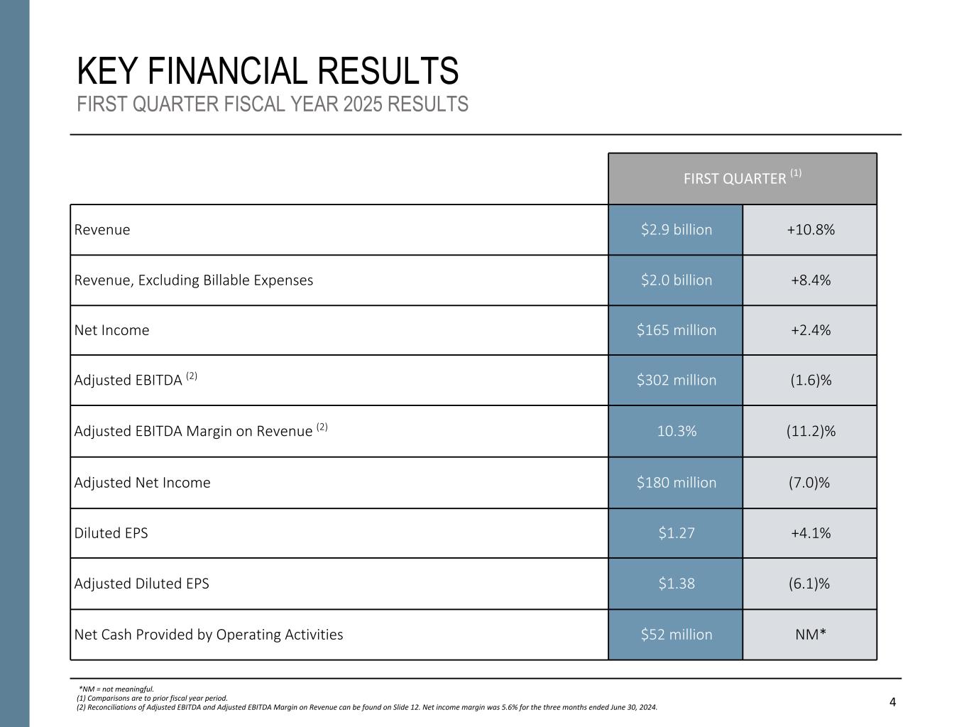Exhibit 4 - Booz Allen Hamilton Holding Corporation Non-GAAP Financial Information (UNAUDITED) 8 Three Months Ended June 30, (In thousands, except share and per share data) 2024 2023 Revenue, Excluding Billable Expenses Revenue $ 2,941,797 $ 2,654,486 Less: Billable expenses 944,981 812,304 Revenue, Excluding Billable Expenses $ 1,996,816 $ 1,842,182 Adjusted Operating Income Operating Income $ 255,164 $ 234,418 Acquisition and divestiture costs (a) 5,670 3,268 Significant acquisition amortization (b) 12,684 13,108 Legal matter reserve (c) — 27,453 Adjusted Operating Income $ 273,518 $ 278,247 EBITDA, Adjusted EBITDA, Adjusted EBITDA Margin on Revenue & Adjusted EBITDA Margin on Revenue, Excluding Billable Expenses Net income $ 165,233 $ 161,388 Income tax expense 49,128 39,480 Interest and other, net (d) 40,803 33,550 Depreciation and amortization 41,129 41,847 EBITDA $ 296,293 $ 276,265 Acquisition and divestiture costs (a) 5,670 3,268 Legal matter reserve (c) — 27,453 Adjusted EBITDA $ 301,963 $ 306,986 Net income margin 5.6 % 6.1 % Adjusted EBITDA Margin on Revenue 10.3 % 11.6 % Adjusted EBITDA Margin on Revenue, Excluding Billable Expenses 15.1 % 16.7 % Adjusted Net Income Net income $ 165,233 $ 161,388 Acquisition and divestiture costs (a) 5,670 3,268 Significant acquisition amortization (b) 12,684 13,108 Legal matter reserve (c) — 27,453 Amortization or write-off of debt issuance costs and debt discount 1,076 782 Adjustments for tax effect (e) (5,052) (12,942) Adjusted Net Income $ 179,611 $ 193,057 Adjusted Diluted Earnings Per Share Weighted-average number of diluted shares outstanding 129,917,263 131,530,633 Diluted earnings per share $ 1.27 $ 1.22 Adjusted Net Income Per Diluted Share (f) $ 1.38 $ 1.47 Free Cash Flow Net cash provided by (used in) operating activities $ 52,128 $ (71,532) Less: Purchases of property, equipment and software (32,442) (10,488) Free Cash Flow $ 19,686 $ (82,020) Operating cash flow conversion 32% (44)% Free cash flow conversion 11% (42)% 8 (a) Represents costs associated with the acquisition efforts of the Company related to transactions for which the Company has entered into a letter of intent to acquire a controlling financial interest in the target entity. Transactions primarily include the acquisitions of EverWatch Corp. (“EverWatch”) in fiscal 2023 and PAR Government Systems Corporation (“PGSC”) in fiscal 2025. See Note 5, “Acquisition, Goodwill, and Intangible Assets,” to the condensed consolidated financial statements in the Company's Form 10-Q for the fiscal quarter ended June 30, 2024 for further information. (b) Amortization expense associated with acquired intangibles from significant acquisitions. (c) Reserve associated with the U.S. Department of Justice's investigation of the Company. See Note 20, “Commitments and Contingencies,” in the Annual Report on Form 10-K for the fiscal year ended March 31, 2024 for further information about this item. (d) Reflects the combination of Interest expense and Other income, net from the condensed consolidated statement of operations. (e) Reflects the tax effect of adjustments at an assumed effective tax rate of 26%, which approximates the blended federal and state tax rates, and consistently excludes the impact of other tax credits and incentive benefits realized. The tax effect of certain discrete items is calculated specifically and may vary from the general 26% rate. (f) Excludes adjustments of approximately $0.8 million and $1.2 million of net earnings for the three months ended June 30, 2024 and June 30, 2023, respectively, associated with the application of the two-class method for computing diluted earnings per share.