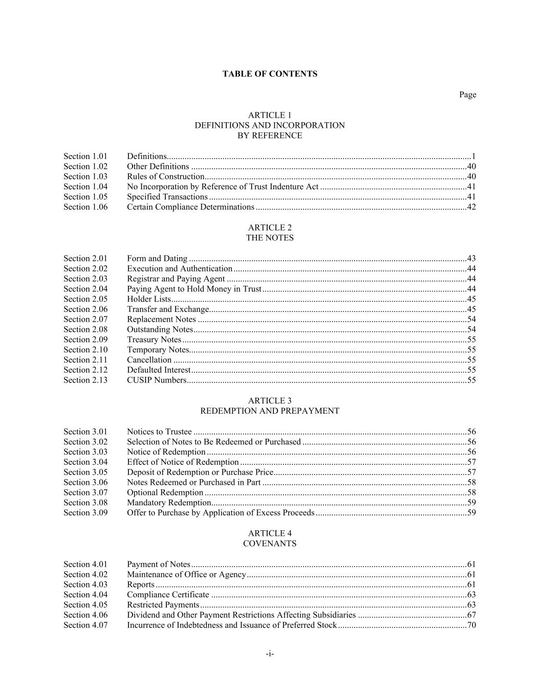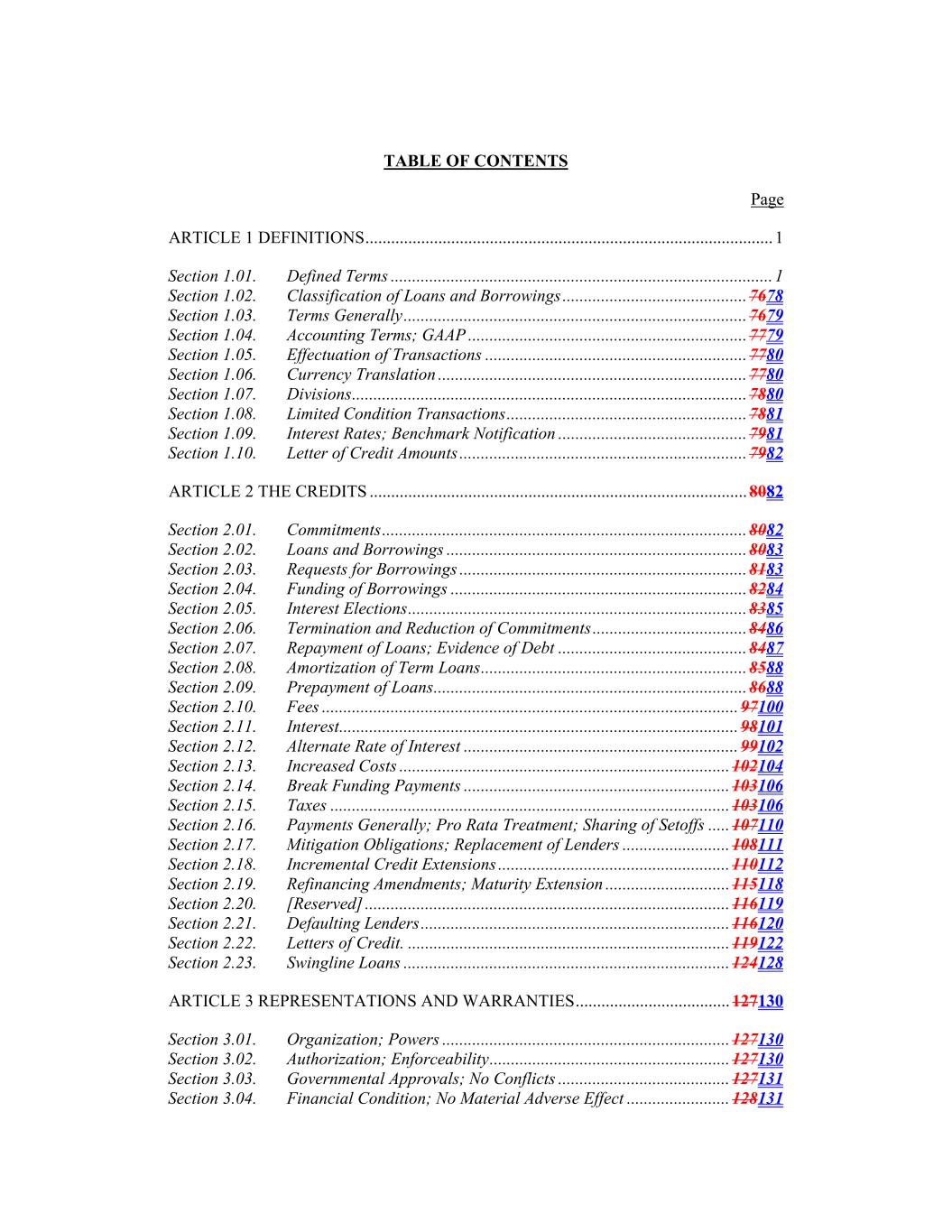 TABLE OF CONTENTS Page ARTICLE 1 DEFINITIONS ............................................................................................... 1 Section 1.01. Defined Terms ......................................................................................... 1 Section 1.02. Classification of Loans and Borrowings ........................................... 7678 Section 1.03. Terms Generally ................................................................................ 7679 Section 1.04. Accounting Terms; GAAP ................................................................. 7779 Section 1.05. Effectuation of Transactions ............................................................. 7780 Section 1.06. Currency Translation ........................................................................ 7780 Section 1.07. Divisions ............................................................................................ 7880 Section 1.08. Limited Condition Transactions ........................................................ 7881 Section 1.09. Interest Rates; Benchmark Notification ............................................ 7981 Section 1.10. Letter of Credit Amounts ................................................................... 7982 ARTICLE 2 THE CREDITS ........................................................................................ 8082 Section 2.01. Commitments ..................................................................................... 8082 Section 2.02. Loans and Borrowings ...................................................................... 8083 Section 2.03. Requests for Borrowings ................................................................... 8183 Section 2.04. Funding of Borrowings ..................................................................... 8284 Section 2.05. Interest Elections ............................................................................... 8385 Section 2.06. Termination and Reduction of Commitments .................................... 8486 Section 2.07. Repayment of Loans; Evidence of Debt ............................................ 8487 Section 2.08. Amortization of Term Loans .............................................................. 8588 Section 2.09. Prepayment of Loans ......................................................................... 8688 Section 2.10. Fees ................................................................................................. 97100 Section 2.11. Interest ............................................................................................. 98101 Section 2.12. Alternate Rate of Interest ................................................................ 99102 Section 2.13. Increased Costs ............................................................................. 102104 Section 2.14. Break Funding Payments .............................................................. 103106 Section 2.15. Taxes ............................................................................................. 103106 Section 2.16. Payments Generally; Pro Rata Treatment; Sharing of Setoffs ..... 107110 Section 2.17. Mitigation Obligations; Replacement of Lenders ......................... 108111 Section 2.18. Incremental Credit Extensions ...................................................... 110112 Section 2.19. Refinancing Amendments; Maturity Extension ............................. 115118 Section 2.20. [Reserved] ..................................................................................... 116119 Section 2.21. Defaulting Lenders ........................................................................ 116120 Section 2.22. Letters of Credit. ........................................................................... 119122 Section 2.23. Swingline Loans ............................................................................ 124128 ARTICLE 3 REPRESENTATIONS AND WARRANTIES .................................... 127130 Section 3.01. Organization; Powers ................................................................... 127130 Section 3.02. Authorization; Enforceability ........................................................ 127130 Section 3.03. Governmental Approvals; No Conflicts ........................................ 127131 Section 3.04. Financial Condition; No Material Adverse Effect ........................ 128131