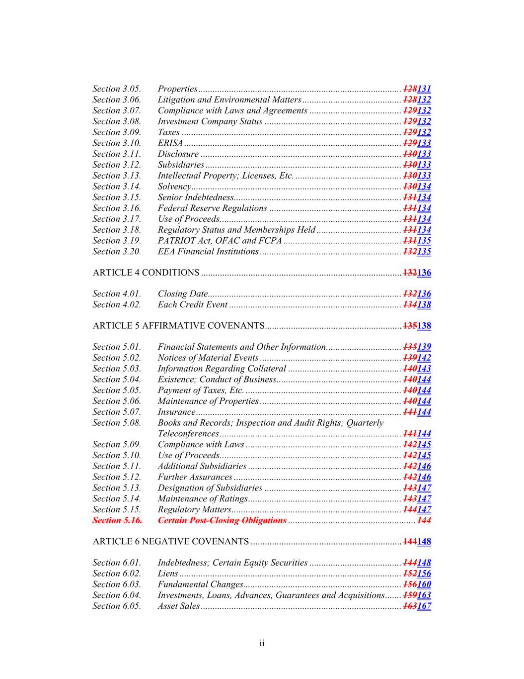 ii Section 3.05. Properties ...................................................................................... 128131 Section 3.06. Litigation and Environmental Matters .......................................... 128132 Section 3.07. Compliance with Laws and Agreements ....................................... 129132 Section 3.08. Investment Company Status .......................................................... 129132 Section 3.09. Taxes ............................................................................................. 129132 Section 3.10. ERISA ............................................................................................ 129133 Section 3.11. Disclosure ..................................................................................... 130133 Section 3.12. Subsidiaries ................................................................................... 130133 Section 3.13. Intellectual Property; Licenses, Etc. ............................................. 130133 Section 3.14. Solvency ......................................................................................... 130134 Section 3.15. Senior Indebtedness....................................................................... 131134 Section 3.16. Federal Reserve Regulations ........................................................ 131134 Section 3.17. Use of Proceeds ............................................................................. 131134 Section 3.18. Regulatory Status and Memberships Held .................................... 131134 Section 3.19. PATRIOT Act, OFAC and FCPA .................................................. 131135 Section 3.20. EEA Financial Institutions ............................................................ 132135 ARTICLE 4 CONDITIONS ..................................................................................... 132136 Section 4.01. Closing Date .................................................................................. 132136 Section 4.02. Each Credit Event ......................................................................... 134138 ARTICLE 5 AFFIRMATIVE COVENANTS.......................................................... 135138 Section 5.01. Financial Statements and Other Information ................................ 135139 Section 5.02. Notices of Material Events ............................................................ 139142 Section 5.03. Information Regarding Collateral ................................................ 140143 Section 5.04. Existence; Conduct of Business ..................................................... 140144 Section 5.05. Payment of Taxes, Etc. .................................................................. 140144 Section 5.06. Maintenance of Properties ............................................................ 140144 Section 5.07. Insurance ....................................................................................... 141144 Section 5.08. Books and Records; Inspection and Audit Rights; Quarterly Teleconferences ............................................................................. 141144 Section 5.09. Compliance with Laws .................................................................. 142145 Section 5.10. Use of Proceeds ............................................................................. 142145 Section 5.11. Additional Subsidiaries ................................................................. 142146 Section 5.12. Further Assurances ....................................................................... 142146 Section 5.13. Designation of Subsidiaries .......................................................... 143147 Section 5.14. Maintenance of Ratings ................................................................. 143147 Section 5.15. Regulatory Matters ........................................................................ 144147 Section 5.16. Certain Post-Closing Obligations ...................................................... 144 ARTICLE 6 NEGATIVE COVENANTS ................................................................ 144148 Section 6.01. Indebtedness; Certain Equity Securities ....................................... 144148 Section 6.02. Liens .............................................................................................. 152156 Section 6.03. Fundamental Changes ................................................................... 156160 Section 6.04. Investments, Loans, Advances, Guarantees and Acquisitions ....... 159163 Section 6.05. Asset Sales ..................................................................................... 163167