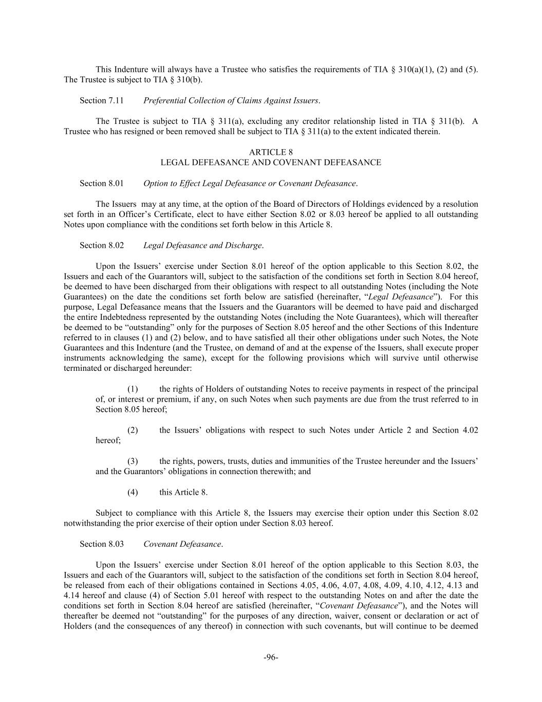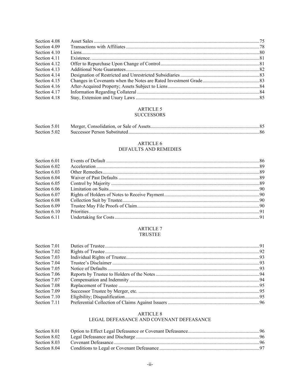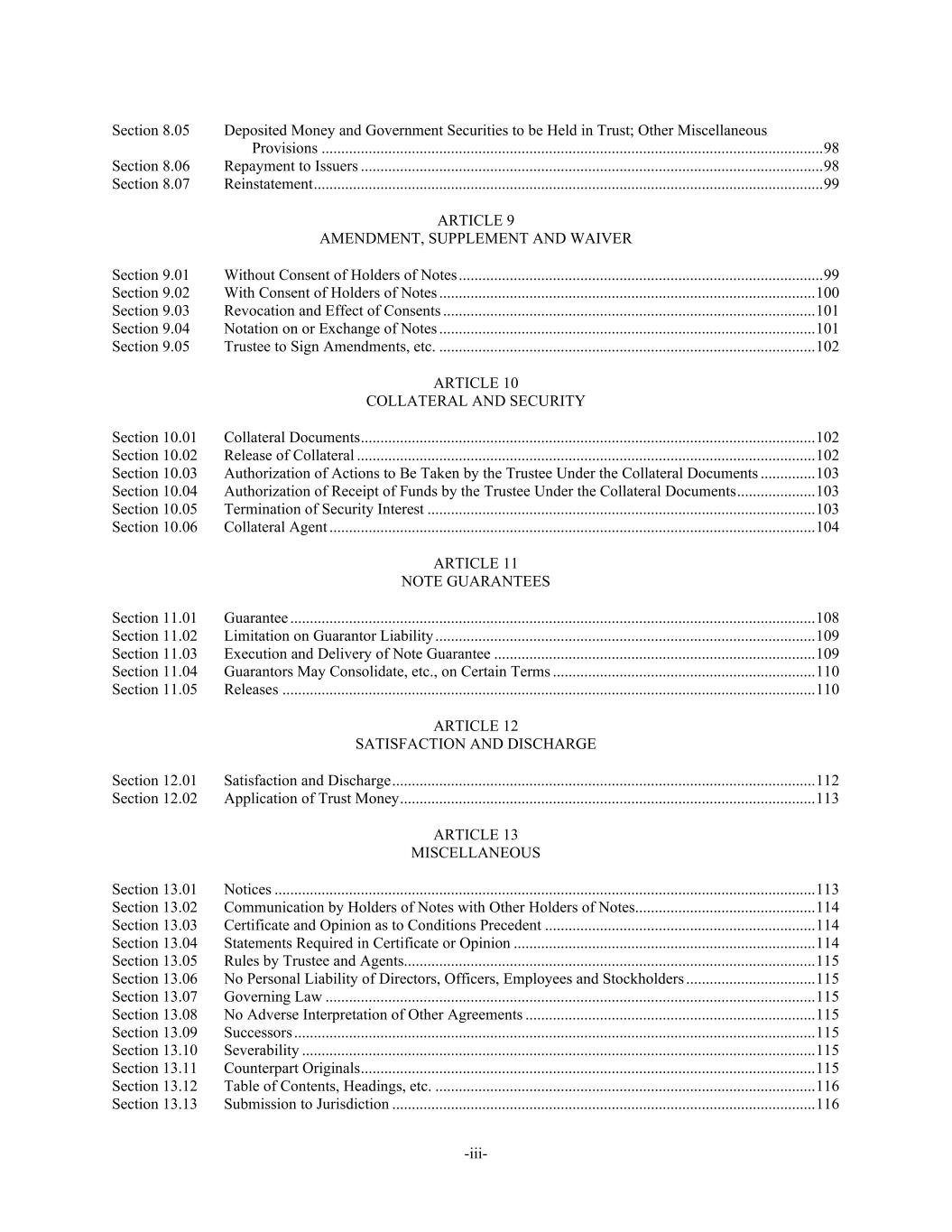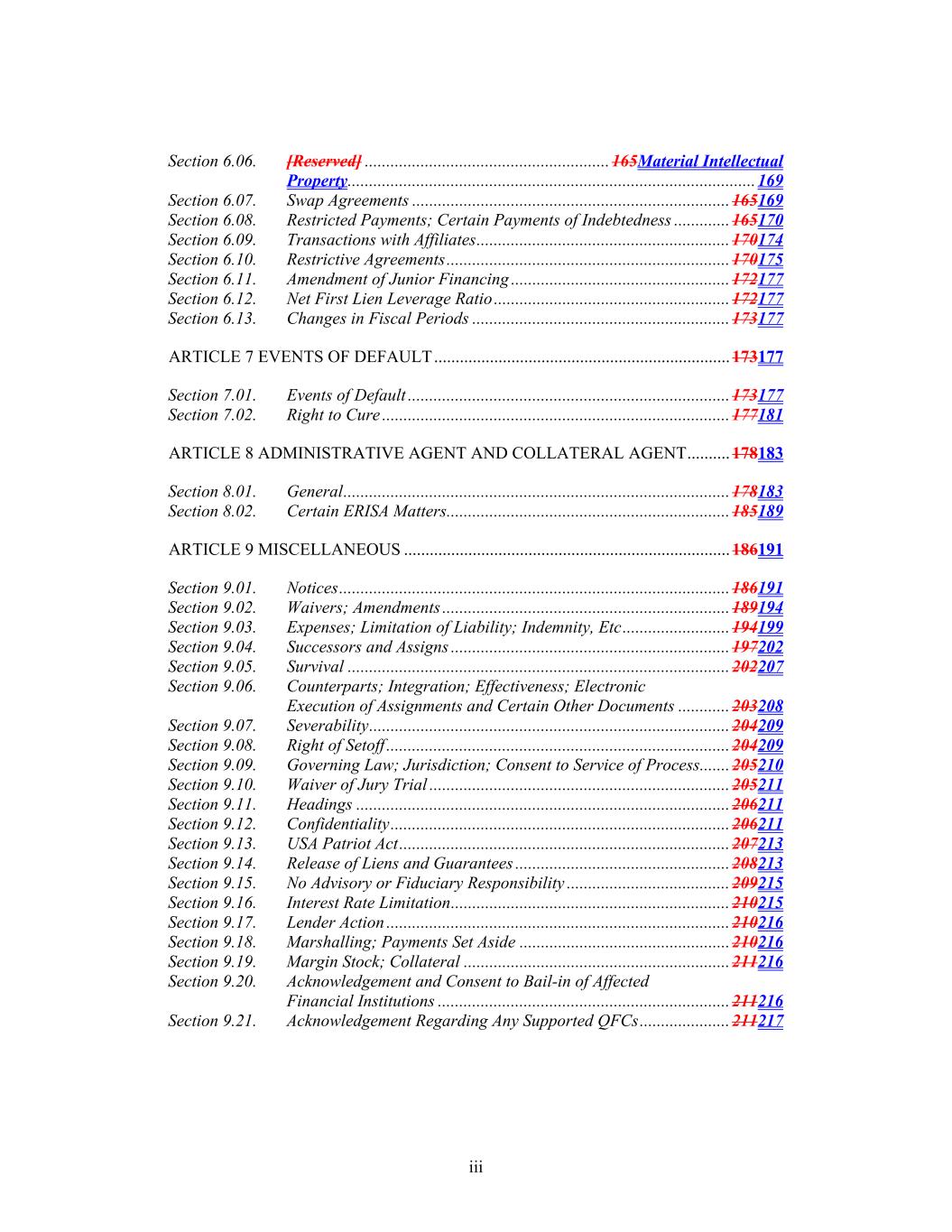 iii Section 6.06. [Reserved] ......................................................... 165Material Intellectual Property ............................................................................................... 169 Section 6.07. Swap Agreements .......................................................................... 165169 Section 6.08. Restricted Payments; Certain Payments of Indebtedness ............. 165170 Section 6.09. Transactions with Affiliates ........................................................... 170174 Section 6.10. Restrictive Agreements .................................................................. 170175 Section 6.11. Amendment of Junior Financing ................................................... 172177 Section 6.12. Net First Lien Leverage Ratio ....................................................... 172177 Section 6.13. Changes in Fiscal Periods ............................................................ 173177 ARTICLE 7 EVENTS OF DEFAULT ..................................................................... 173177 Section 7.01. Events of Default ........................................................................... 173177 Section 7.02. Right to Cure ................................................................................. 177181 ARTICLE 8 ADMINISTRATIVE AGENT AND COLLATERAL AGENT .......... 178183 Section 8.01. General .......................................................................................... 178183 Section 8.02. Certain ERISA Matters .................................................................. 185189 ARTICLE 9 MISCELLANEOUS ............................................................................ 186191 Section 9.01. Notices ........................................................................................... 186191 Section 9.02. Waivers; Amendments ................................................................... 189194 Section 9.03. Expenses; Limitation of Liability; Indemnity, Etc ......................... 194199 Section 9.04. Successors and Assigns ................................................................. 197202 Section 9.05. Survival ......................................................................................... 202207 Section 9.06. Counterparts; Integration; Effectiveness; Electronic Execution of Assignments and Certain Other Documents ............ 203208 Section 9.07. Severability .................................................................................... 204209 Section 9.08. Right of Setoff ................................................................................ 204209 Section 9.09. Governing Law; Jurisdiction; Consent to Service of Process ....... 205210 Section 9.10. Waiver of Jury Trial ...................................................................... 205211 Section 9.11. Headings ....................................................................................... 206211 Section 9.12. Confidentiality ............................................................................... 206211 Section 9.13. USA Patriot Act ............................................................................. 207213 Section 9.14. Release of Liens and Guarantees .................................................. 208213 Section 9.15. No Advisory or Fiduciary Responsibility ...................................... 209215 Section 9.16. Interest Rate Limitation ................................................................. 210215 Section 9.17. Lender Action ................................................................................ 210216 Section 9.18. Marshalling; Payments Set Aside ................................................. 210216 Section 9.19. Margin Stock; Collateral .............................................................. 211216 Section 9.20. Acknowledgement and Consent to Bail-in of Affected Financial Institutions .................................................................... 211216 Section 9.21. Acknowledgement Regarding Any Supported QFCs ..................... 211217