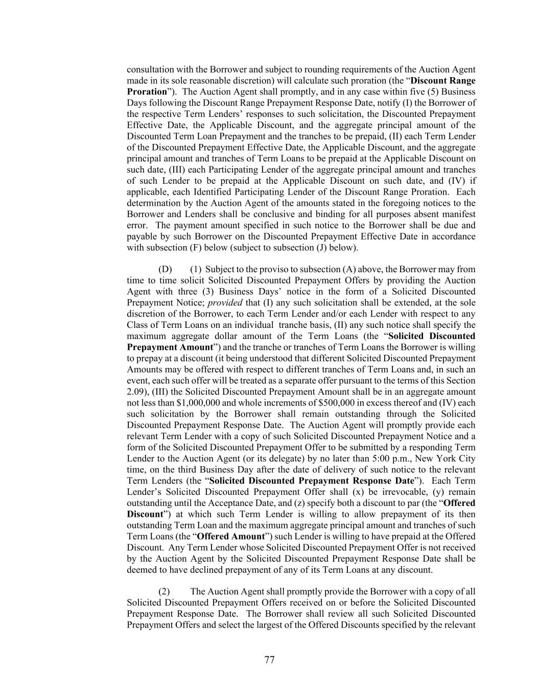 76 Term Loans and, in such an event, each such offer will be treated as a separate offer pursuant to the terms of this Section 2.09), (III) the Discount Range Prepayment Amount shall be in an aggregate amount not less than $1,000,000 and whole increments of $500,000 in excess thereof and (IV) each such solicitation by the Borrower shall remain outstanding through the Discount Range Prepayment Response Date. The Auction Agent will promptly provide each relevant Term Lender with a copy of such Discount Range Prepayment Notice and a form of the Discount Range Prepayment Offer to be submitted by a responding relevant Term Lender to the Auction Agent (or its delegate) by no later than 5:00 p.m., New York City time, on the third Business Day after the date of delivery of such notice to the relevant Term Lenders (the “Discount Range Prepayment Response Date”). Each relevant Term Lender’s Discount Range Prepayment Offer shall be irrevocable and shall specify a discount to par within the Discount Range (the “Submitted Discount”) at which such Term Lender is willing to allow prepayment of any or all of its then outstanding Term Loans of the applicable tranche or tranches and the maximum aggregate principal amount and tranches of such Lender’s Term Loans (the “Submitted Amount”) such Lender is willing to have prepaid at the Submitted Discount. Any Term Lender whose Discount Range Prepayment Offer is not received by the Auction Agent by the Discount Range Prepayment Response Date shall be deemed to have declined to accept a Discounted Term Loan Prepayment of any of its Term Loans at any discount to their par value within the Discount Range. (2) The Auction Agent shall review all Discount Range Prepayment Offers received on or before the applicable Discount Range Prepayment Response Date and shall determine (in consultation with the Borrower and subject to rounding requirements of the Auction Agent made in its sole reasonable discretion) the Applicable Discount and Term Loans to be prepaid at such Applicable Discount in accordance with this subsection (C). The Borrower agrees to accept on the Discount Range Prepayment Response Date all Discount Range Prepayment Offers received by the Auction Agent by the Discount Range Prepayment Response Date, in the order from the Submitted Discount that is the largest discount to par to the Submitted Discount that is the smallest discount to par, up to and including the Submitted Discount that is the smallest discount to par within the Discount Range (such Submitted Discount that is the smallest discount to par within the Discount Range being referred to as the “Applicable Discount”) which yields a Discounted Term Loan Prepayment in an aggregate principal amount equal to the lower of (I) the Discount Range Prepayment Amount and (II) the sum of all Submitted Amounts. Each Lender that has submitted a Discount Range Prepayment Offer to accept prepayment at a discount to par that is larger than or equal to the Applicable Discount shall be deemed to have irrevocably consented to prepayment of Term Loans equal to its Submitted Amount (subject to any required proration pursuant to the following subsection (3)) at the Applicable Discount (each such Lender, a “Participating Lender”). (3) If there is at least one Participating Lender, the Borrower will prepay the respective outstanding Term Loans of each Participating Lender in the aggregate principal amount and of the tranches specified in such Lender’s Discount Range Prepayment Offer at the Applicable Discount; provided that if the Submitted Amount by all Participating Lenders offered at a discount to par greater than the Applicable Discount exceeds the Discount Range Prepayment Amount, prepayment of the principal amount of the relevant Term Loans for those Participating Lenders whose Submitted Discount is a discount to par greater than or equal to the Applicable Discount (the “Identified Participating Lenders”) shall be made pro-rata among the Identified Participating Lenders in accordance with the Submitted Amount of each such Identified Participating Lender and the Auction Agent (in