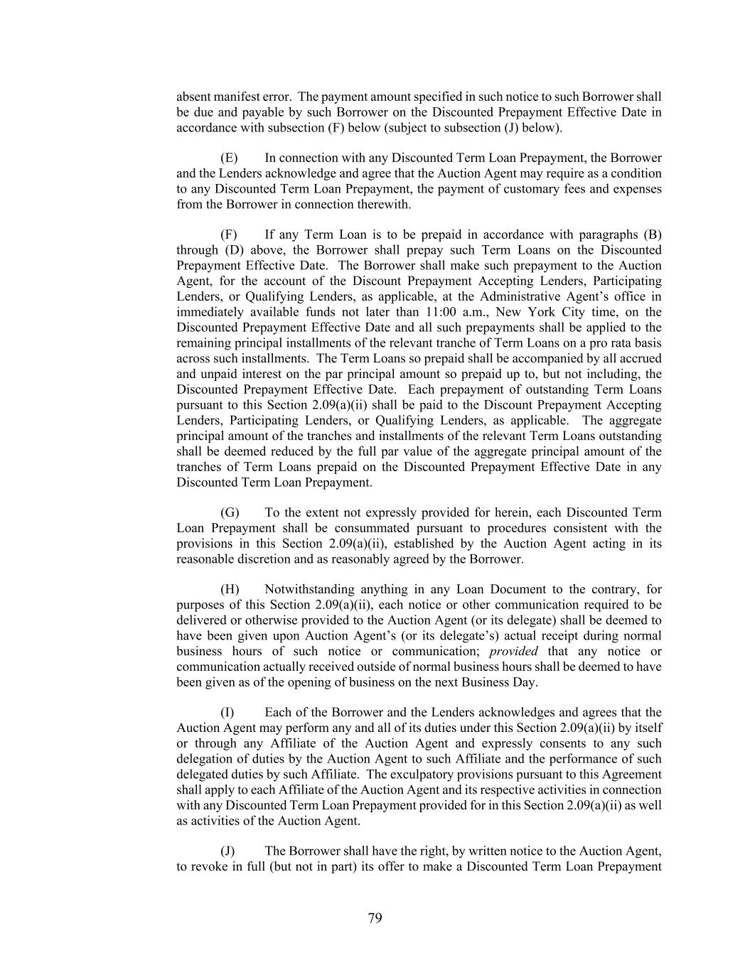 79 absent manifest error. The payment amount specified in such notice to such Borrower shall be due and payable by such Borrower on the Discounted Prepayment Effective Date in accordance with subsection (F) below (subject to subsection (J) below). (E) In connection with any Discounted Term Loan Prepayment, the Borrower and the Lenders acknowledge and agree that the Auction Agent may require as a condition to any Discounted Term Loan Prepayment, the payment of customary fees and expenses from the Borrower in connection therewith. (F) If any Term Loan is to be prepaid in accordance with paragraphs (B) through (D) above, the Borrower shall prepay such Term Loans on the Discounted Prepayment Effective Date. The Borrower shall make such prepayment to the Auction Agent, for the account of the Discount Prepayment Accepting Lenders, Participating Lenders, or Qualifying Lenders, as applicable, at the Administrative Agent’s office in immediately available funds not later than 11:00 a.m., New York City time, on the Discounted Prepayment Effective Date and all such prepayments shall be applied to the remaining principal installments of the relevant tranche of Term Loans on a pro rata basis across such installments. The Term Loans so prepaid shall be accompanied by all accrued and unpaid interest on the par principal amount so prepaid up to, but not including, the Discounted Prepayment Effective Date. Each prepayment of outstanding Term Loans pursuant to this Section 2.09(a)(ii) shall be paid to the Discount Prepayment Accepting Lenders, Participating Lenders, or Qualifying Lenders, as applicable. The aggregate principal amount of the tranches and installments of the relevant Term Loans outstanding shall be deemed reduced by the full par value of the aggregate principal amount of the tranches of Term Loans prepaid on the Discounted Prepayment Effective Date in any Discounted Term Loan Prepayment. (G) To the extent not expressly provided for herein, each Discounted Term Loan Prepayment shall be consummated pursuant to procedures consistent with the provisions in this Section 2.09(a)(ii), established by the Auction Agent acting in its reasonable discretion and as reasonably agreed by the Borrower. (H) Notwithstanding anything in any Loan Document to the contrary, for purposes of this Section 2.09(a)(ii), each notice or other communication required to be delivered or otherwise provided to the Auction Agent (or its delegate) shall be deemed to have been given upon Auction Agent’s (or its delegate’s) actual receipt during normal business hours of such notice or communication; provided that any notice or communication actually received outside of normal business hours shall be deemed to have been given as of the opening of business on the next Business Day. (I) Each of the Borrower and the Lenders acknowledges and agrees that the Auction Agent may perform any and all of its duties under this Section 2.09(a)(ii) by itself or through any Affiliate of the Auction Agent and expressly consents to any such delegation of duties by the Auction Agent to such Affiliate and the performance of such delegated duties by such Affiliate. The exculpatory provisions pursuant to this Agreement shall apply to each Affiliate of the Auction Agent and its respective activities in connection with any Discounted Term Loan Prepayment provided for in this Section 2.09(a)(ii) as well as activities of the Auction Agent. (J) The Borrower shall have the right, by written notice to the Auction Agent, to revoke in full (but not in part) its offer to make a Discounted Term Loan Prepayment