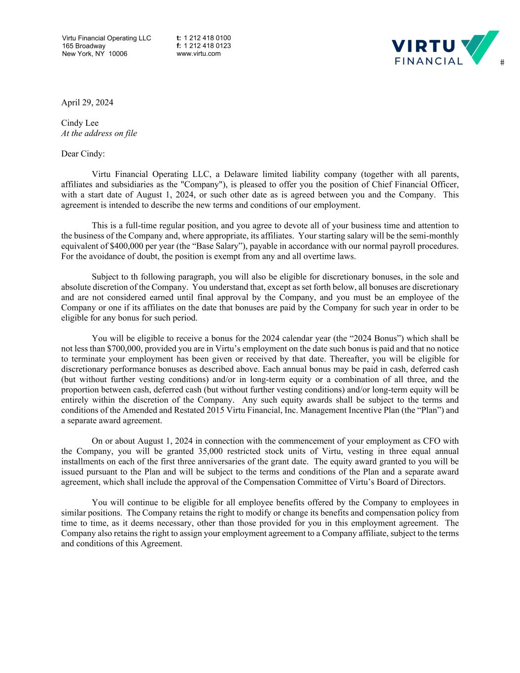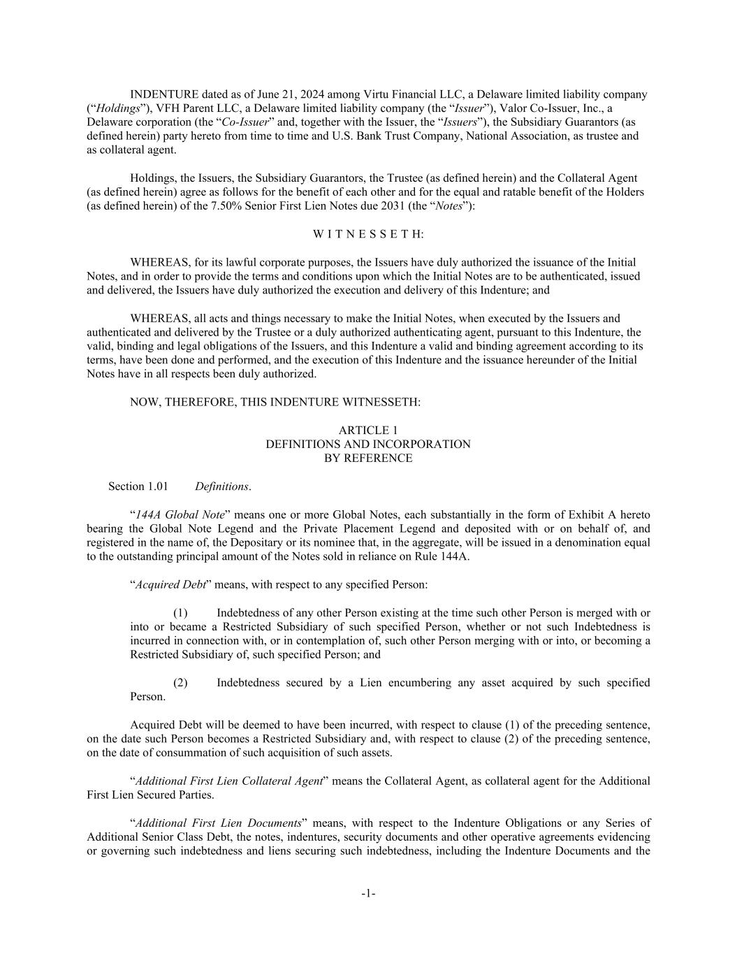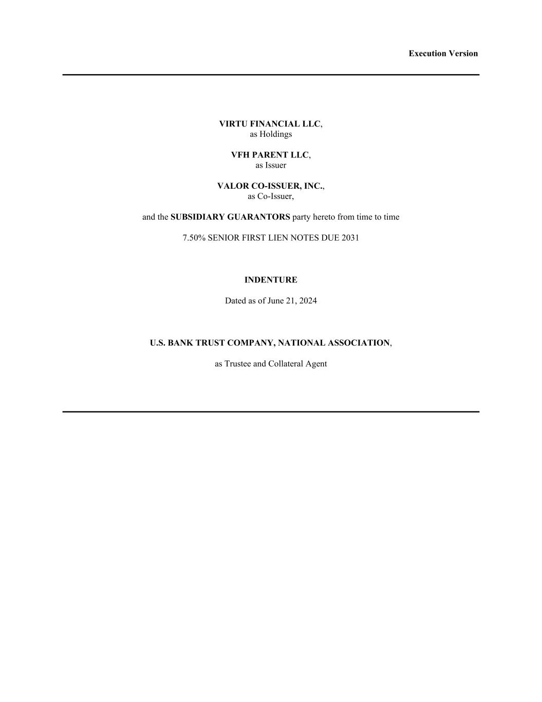 Execution Version AMENDMENT NO. 1, dated as of June 21, 2024 (this “Amendment”), to the Credit Agreement, dated as of January 13, 2022 (as amended, restated, modified or otherwise supplemented from time to time, the “Credit Agreement”), by and among VIRTU FINANCIAL LLC, a Delaware limited liability company (“Holdings”), VFH PARENT LLC, a Delaware limited liability company (the “Borrower”), the LENDERS party thereto from time to time and JPMORGAN CHASE BANK, N.A., as administrative agent (the “Administrative Agent”). Capitalized terms used but not defined herein shall have the meanings assigned to such terms in the Credit Agreement as amended by this Amendment. WHEREAS, the Borrower wishes to (i) establish a new Class of Term Loans (the “Term B-1 Loans”), the proceeds of which will be used, together with the proceeds of certain other secured indebtedness, to refinance all of the Initial Term Loans outstanding under the Credit Agreement immediately prior to the Amendment No. 1 Effective Date (as defined below), (ii) establish Other Revolving Commitments and Incremental Revolving Commitments (the “2024 Revolving Commitments” and together with the Term B-1 Loans, the “2024 Facilities”) in an aggregate principal amount of $300,000,000 that will replace the Revolving Commitments outstanding under the Credit Agreement immediately prior to the Amendment No. 1 Effective Date in full (the transactions described in the foregoing clauses (i) and (ii), the “Refinancing”) and (iii) make certain other amendments to the Credit Agreement in connection therewith; WHEREAS, the Required Lenders and the Term B-1 Lender (as defined below) have agreed to the amendments contemplated above; WHEREAS, JPMorgan Chase Bank, N.A. (in such capacity, the “Term B-1 Lender”) has agreed to provide the Term B-1 Commitment (as defined in Exhibit A) and each institution listed on Schedule I hereto (each a “2024 Revolving Lender”) has agreed to provide a 2024 Revolving Commitment in the amount set forth opposite its name on Schedule I; WHEREAS, each of JPMorgan Chase Bank, N.A., Goldman Sachs Bank USA, RBC Capital Markets,1 BofA Securities, Inc., Barclays Bank PLC, Jefferies Finance LLC and CIBC World Markets Corp. have been appointed as joint lead arrangers and joint bookrunners for the Amendment and the 2024 Facilities; NOW, THEREFORE, in consideration of the premises contained herein and for other good and valuable consideration, the receipt and sufficiency of which are hereby acknowledged, the parties hereto, intending to be legally bound hereby, agree as follows: SECTION 1. Amendment of the Credit Agreement. The Credit Agreement is, effective as of the Amendment No. 1 Effective Date, hereby amended to delete the stricken text (indicated textually in the same manner as the following example: stricken text) and to add the double-underlined text (indicated textually in the same manner as the following example: double- 1 RBC Capital Markets is a brand name for the capital markets business of Royal Bank of Canada and its affiliates.