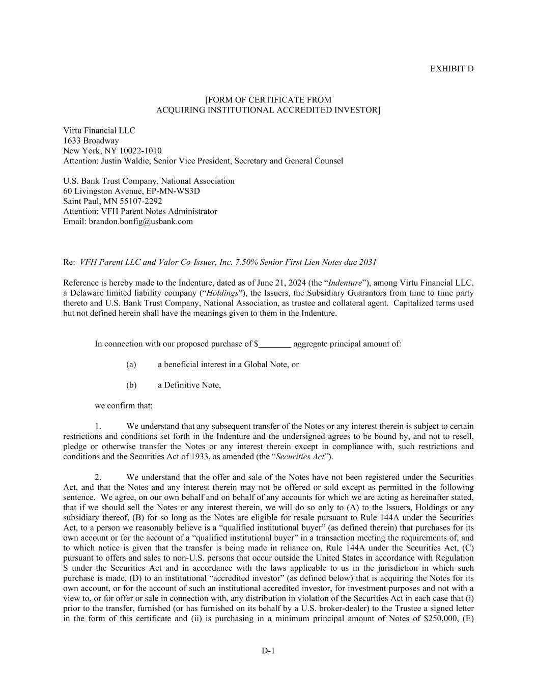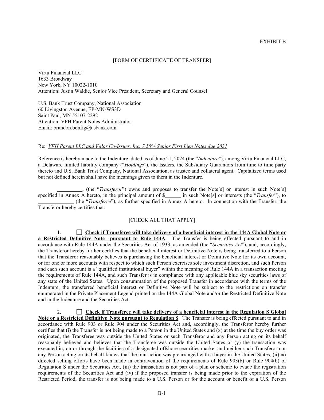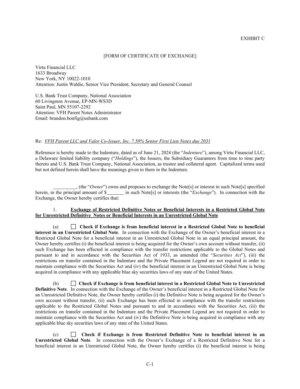 Execution Version AMENDMENT NO. 1, dated as of June 21, 2024 (this “Amendment”), to the Credit Agreement, dated as of January 13, 2022 (as amended, restated, modified or otherwise supplemented from time to time, the “Credit Agreement”), by and among VIRTU FINANCIAL LLC, a Delaware limited liability company (“Holdings”), VFH PARENT LLC, a Delaware limited liability company (the “Borrower”), the LENDERS party thereto from time to time and JPMORGAN CHASE BANK, N.A., as administrative agent (the “Administrative Agent”). Capitalized terms used but not defined herein shall have the meanings assigned to such terms in the Credit Agreement as amended by this Amendment. WHEREAS, the Borrower wishes to (i) establish a new Class of Term Loans (the “Term B-1 Loans”), the proceeds of which will be used, together with the proceeds of certain other secured indebtedness, to refinance all of the Initial Term Loans outstanding under the Credit Agreement immediately prior to the Amendment No. 1 Effective Date (as defined below), (ii) establish Other Revolving Commitments and Incremental Revolving Commitments (the “2024 Revolving Commitments” and together with the Term B-1 Loans, the “2024 Facilities”) in an aggregate principal amount of $300,000,000 that will replace the Revolving Commitments outstanding under the Credit Agreement immediately prior to the Amendment No. 1 Effective Date in full (the transactions described in the foregoing clauses (i) and (ii), the “Refinancing”) and (iii) make certain other amendments to the Credit Agreement in connection therewith; WHEREAS, the Required Lenders and the Term B-1 Lender (as defined below) have agreed to the amendments contemplated above; WHEREAS, JPMorgan Chase Bank, N.A. (in such capacity, the “Term B-1 Lender”) has agreed to provide the Term B-1 Commitment (as defined in Exhibit A) and each institution listed on Schedule I hereto (each a “2024 Revolving Lender”) has agreed to provide a 2024 Revolving Commitment in the amount set forth opposite its name on Schedule I; WHEREAS, each of JPMorgan Chase Bank, N.A., Goldman Sachs Bank USA, RBC Capital Markets,1 BofA Securities, Inc., Barclays Bank PLC, Jefferies Finance LLC and CIBC World Markets Corp. have been appointed as joint lead arrangers and joint bookrunners for the Amendment and the 2024 Facilities; NOW, THEREFORE, in consideration of the premises contained herein and for other good and valuable consideration, the receipt and sufficiency of which are hereby acknowledged, the parties hereto, intending to be legally bound hereby, agree as follows: SECTION 1. Amendment of the Credit Agreement. The Credit Agreement is, effective as of the Amendment No. 1 Effective Date, hereby amended to delete the stricken text (indicated textually in the same manner as the following example: stricken text) and to add the double-underlined text (indicated textually in the same manner as the following example: double- 1 RBC Capital Markets is a brand name for the capital markets business of Royal Bank of Canada and its affiliates.