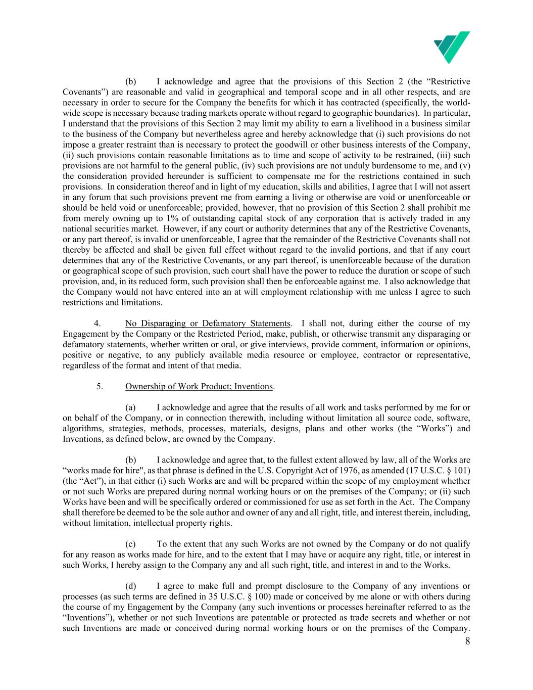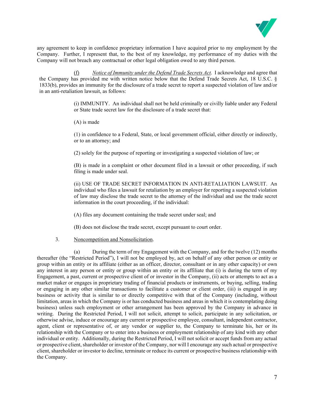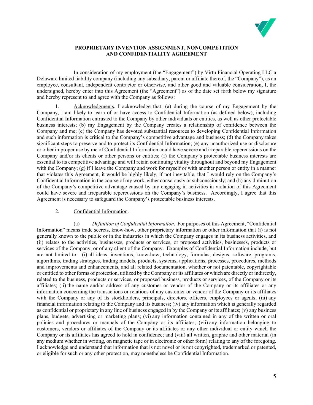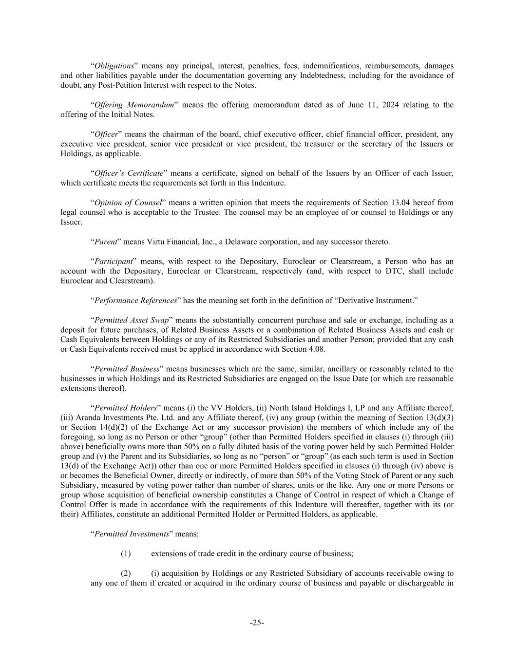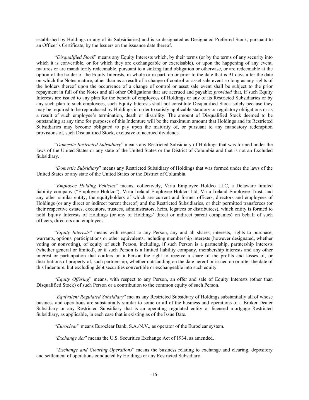 26 “Eligible Assignee” means (a) a Lender, (b) an Affiliate of a Lender, (c) an Approved Fund and (d) any other Person (other than Holdings, any Intermediate Parent, the Borrower or any of their subsidiaries, any VV Holder, any Affiliate of Vincent Viola (including any trust established for the benefit of his spouse or children) or any Disqualified Lender), other than, in each case, a natural person. “Employee Holding Vehicles” means, collectively, Virtu Employee Holdco LLC, a Delaware limited liability company, Virtu East MIP LLC, a Delaware limited liability company, and any other similar entity, the equityholders of which are current and former officers, directors and employees of Holdings (or any direct or indirect parent thereof), the Borrower and the Restricted Subsidiaries, or their permitted transferees (or their respective estates, executors, trustees, administrators, heirs, legatees or distributees), which entity is formed to hold Equity Interests of Holdings (or any of Holdings’ direct or indirect parent companies) on behalf of such officers, directors and employees. “Engagement Letter” means that certain Engagement Letter, dated January 3, 2022, by and among JPMorgan Chase Bank, N.A., Goldman Sachs Bank USA, Royal Bank of Canada, Barclays Bank PLC, Jefferies Finance LLC, BMO Capital Markets Corp., CIBC World Markets Corp. and Holdings. “Environmental Laws” means all applicable treaties, rules, regulations, codes, ordinances, judgments, orders, decrees, Governmental Approvals and other applicable Requirements of Law, and all applicable injunctions or binding agreements issued, promulgated or entered into by or with any Governmental Authority, in each instance relating to the protection of the environment, to preservation or reclamation of natural resources, to the Release or threatened Release of any Hazardous Materials or to the extent relating to exposure to Hazardous Materials, to health or safety matters. “Environmental Liability” means any liability, obligation, loss, claim, action, order or cost, contingent or otherwise (including any liability for damages, costs of medical monitoring, costs of environmental remediation or restoration, administrative oversight costs, consultants’ fees, fines, penalties and indemnities), of Holdings, any Intermediate Parent, the Borrower or any Subsidiary directly or indirectly resulting from or based upon (a) any actual or alleged violation of any Environmental Law or permit, license or approval issued thereunder, (b) Environmental Laws and the generation, use, handling, transportation, storage, treatment or disposal of any Hazardous Materials, (c) exposure to any Hazardous Materials, (d) the Release or threatened Release of any Hazardous Material or (e) any contract, agreement or other written consensual arrangement pursuant to which liability is assumed or imposed with respect to any of the foregoing. “Equity Interests” means shares of capital stock, partnership interests, membership interests in a limited liability company, beneficial interests in a trust or other equity ownership interests in a Person. “ERISA” means the Employee Retirement Income Security Act of 1974, as amended from time to time, and the rules and regulations promulgated thereunder. “ERISA Affiliate” means any trade or business (whether or not incorporated) that, together with the Borrower or any Subsidiary, is treated as a single employer under Section 414(b) or 414(c) of the Code or, solely for purposes of Section 302 of ERISA and Section 412 of the Code, is treated as a single employer under Section 414 of the Code. “ERISA Event” means (a) any “reportable event,” as defined in Section 4043 of ERISA or the regulations issued thereunder with respect to a Plan (other than an event for which the 30 day notice period is waived); (b) any failure by any Plan to satisfy the minimum funding standard (within the meaning of Section 412 of the Code or Section 302 of ERISA) applicable to such Plan, in each case whether or not waived; (c) the filing pursuant to Section 412(c) of the Code or Section 302(c) of ERISA of an application