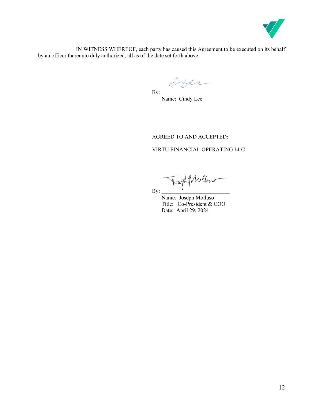 [Signature Page to Amendment No. 1] IN WITNESS WHEREOF, the parties hereto have caused this Amendment to be duly executed by their respective authorized officers as of the day and year first written above. VFH PARENT LLC, as Borrower By: /s/ Sean Galvin Name: Sean Galvin Title: Executive Vice President, Chief Financial Officer and Treasurer VIRTU FINANCIAL LLC, as Holdings By: /s/ Sean Galvin Name: Sean Galvin Title: Executive Vice President, Chief Financial Officer and Treasurer