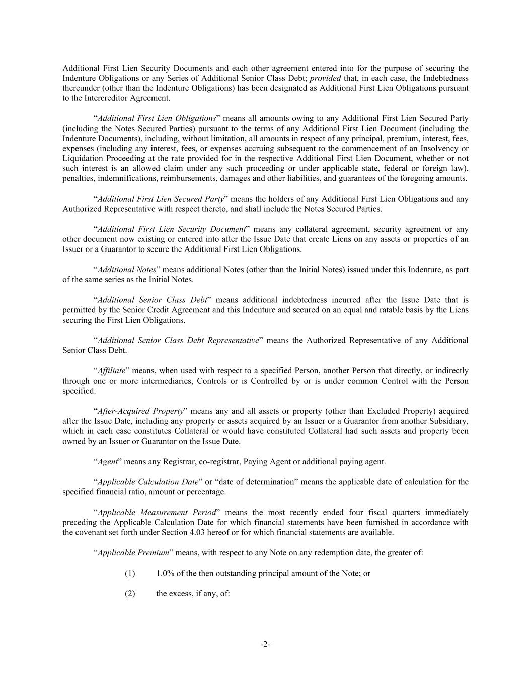 46 broker of recognized standing selected by it; provided, further, that if any of the aforesaid rates shall be less than zero, such rate shall be deemed to be zero for purposes of this Agreement. “NYFRB’s Website” means the website of the NYFRB at http://www.newyorkfed.org, or any successor source. “OFAC” has the meaning assigned to such term in Section 3.19(c). “Offered Amount” has the meaning assigned to such term in Section 2.09(a)(ii)(D)(1). “Offered Discount” has the meaning assigned to such term in Section 2.09(a)(ii)(D)(1). “OID” has the meaning assigned to such term in Section 2.18(a)(ii). “Organizational Documents” means, with respect to any Person, the charter, articles or certificate of organization or incorporation and bylaws or other organizational or governing documents of such Person. “Other First Lien Debt” shall mean obligations secured by Other First Liens. “Other First Liens” shall mean Liens on the Collateral that rank pari passu with the Liens thereon securing the Initial Term B-1 Loans (and other Loan Document Obligations that are secured by Liens on the Collateral that rank pari passu with the Liens thereon securing the Initial Term B-1 Loans) pursuant to the First Lien Intercreditor Agreement. “Other Revolving Commitments” means one or more Classes of revolving credit commitments hereunder or extended Revolving Commitments that result from a Refinancing Amendment. “Other Revolving Loans” means the Revolving Loans made pursuant to any Other Revolving Commitment. “Other Taxes” means any and all present or future recording, stamp, documentary, excise, transfer, sales, property, filing or similar Taxes, charges or levies arising from any payment made under any Loan Document or from the execution, delivery, performance, registration or enforcement of, from the receipt or perfection of a security interest under, or otherwise with respect to, any Loan Document. “Other Term Commitments” means one or more Classes of term loan commitments hereunder that result from a Refinancing Amendment. “Other Term Loans” means one or more Classes of Term Loans that result from a Refinancing Amendment. “Overnight Bank Funding Rate” means, for any day, the rate comprised of both overnight federal funds and overnight eurodollar transactions denominated in dollars by U.S.-managed banking offices of depository institutions, as such composite rate shall be determined by the NYFRB as set forth on the NYFRB’s Website from time to time, and published on the next succeeding Business Day by the NYFRB as an overnight bank funding rate. “Participant” has the meaning assigned to such term in Section 9.04(c)(i). “Participant Register” has the meaning assigned to such term in Section 9.04(c)(ii). “Participating Lender” has the meaning assigned to such term in Section 2.09(a)(ii)(C)(2).