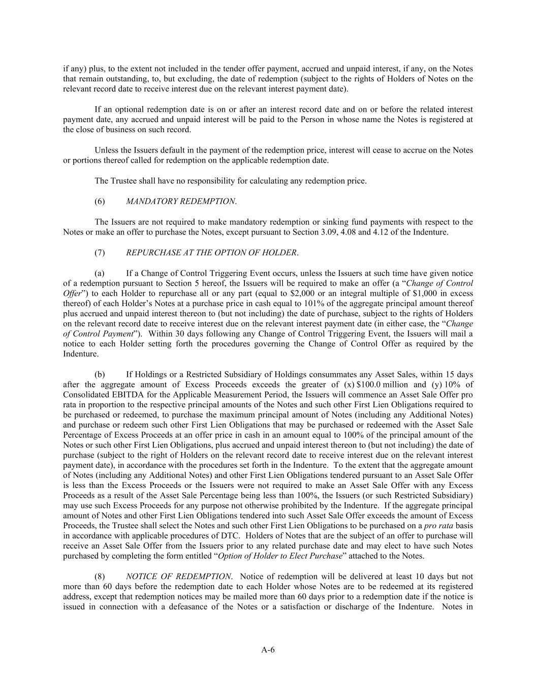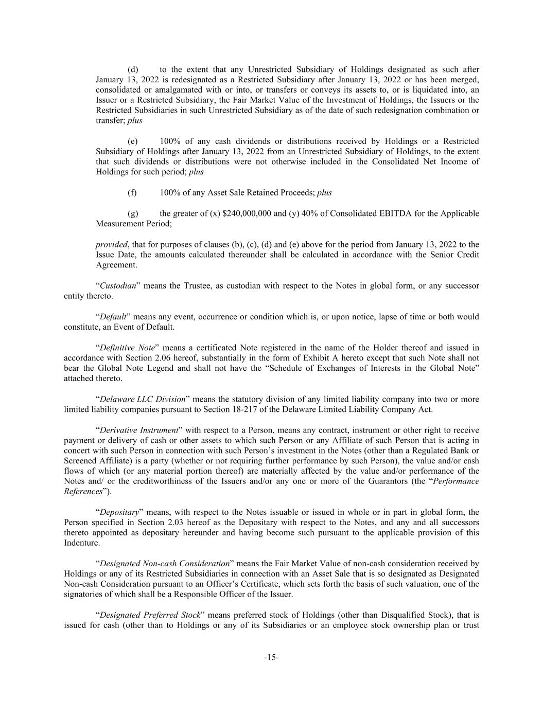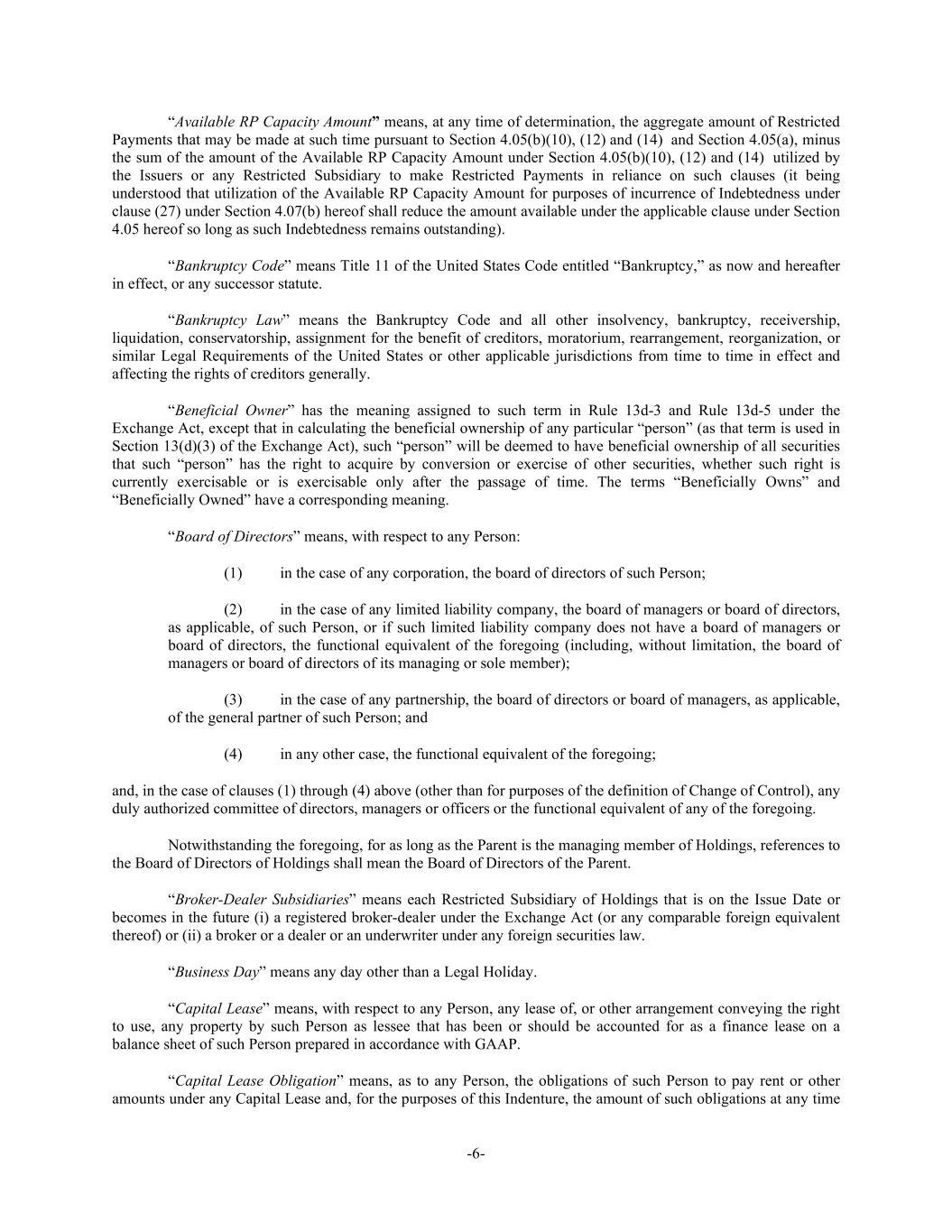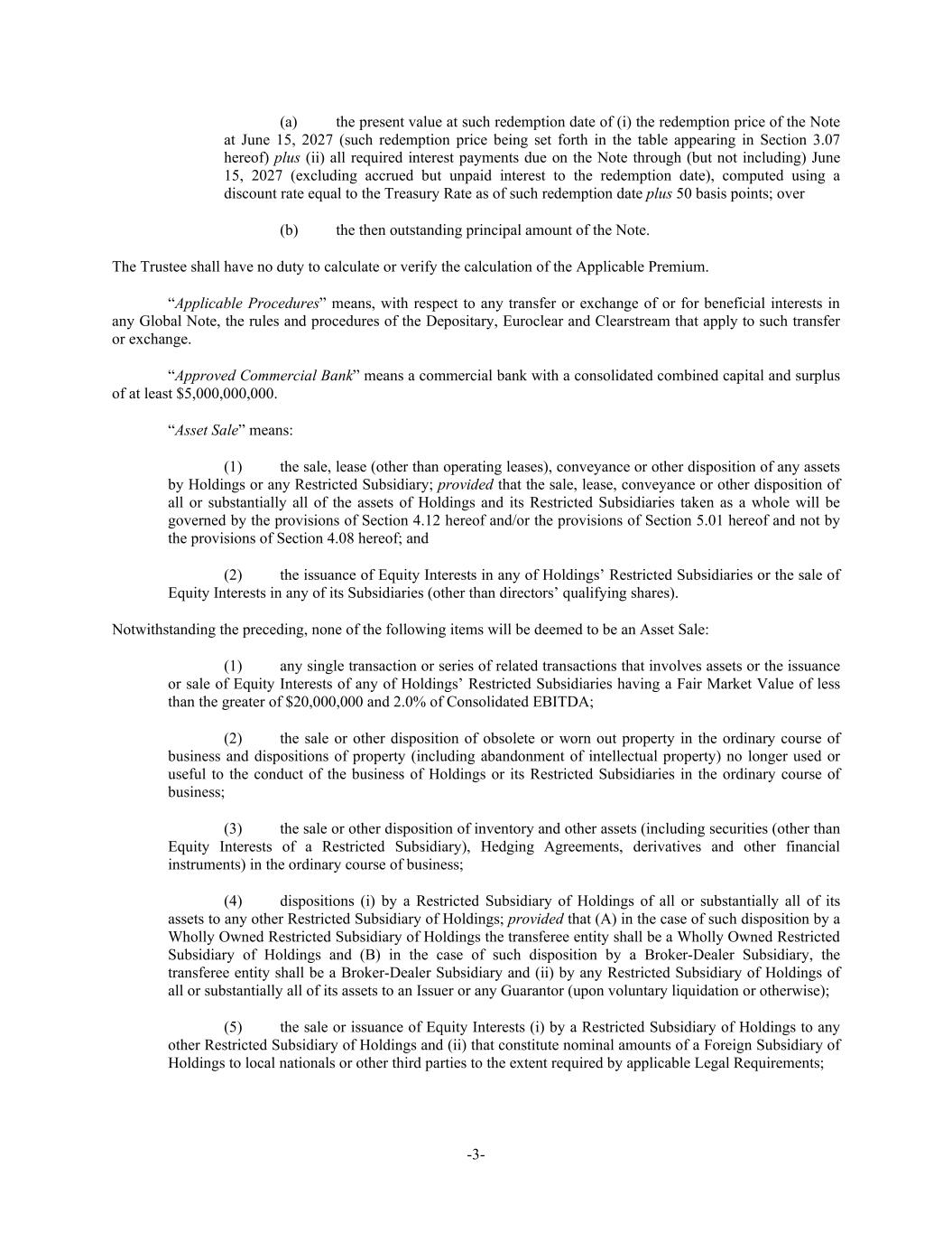 52 Tax Rate applies), Holdings shall be permitted to pay an additional amount with respect to such estimated payment date equal to the excess of such aggregate required annualized installment over the amount permitted under clause (i). “Permitted Unsecured Refinancing Debt” means unsecured Indebtedness incurred by any Loan Party in the form of one or more series of senior unsecured notes or loans; provided that (i) such Indebtedness constitutes Credit Agreement Refinancing Indebtedness, (ii) such Indebtedness does not mature or have scheduled amortization or payments of principal and is not subject to mandatory redemption, repurchase, prepayment or sinking fund obligation (except customary asset sale or change of control provisions), in each case prior to the date that is 91 days after the Latest Maturity Date at the time such Indebtedness is incurred, (iii) such Indebtedness is not at any time guaranteed by any Subsidiaries other than Loan Parties and (iv) such Indebtedness (including any Guarantee thereof) is not secured by any Lien on any property or assets of Holdings or any Restricted Subsidiary. Permitted Unsecured Refinancing Debt will include any Registered Equivalent Notes issued in exchange therefor. “Person” means any natural person, corporation, limited liability company, trust, joint venture, association, company, partnership, Governmental Authority or other entity. “Plan” means any employee pension benefit plan (other than a Multiemployer Plan) subject to the provisions of Title IV of ERISA or Section 412 of the Code or Section 302 of ERISA, and in respect of which the Borrower or any ERISA Affiliate is (or, if such plan were terminated, would under Section 4069 of ERISA be deemed to be) an “employer” as defined in Section 3(5) of ERISA. “Platform” has the meaning assigned to such term in Section 5.01. “Post-Transaction Period” has the meaning assigned to such term in the definition of “Pro Forma Adjustment.” “Prepayment Event” means: (a) any sale, transfer or other disposition (including (x) pursuant to a sale and leaseback transaction, (y) by way of merger or consolidation and (z) any casualty or other insured damage to, or any taking under power of eminent domain or by condemnation or similar proceeding) of any property or asset of Holdings or any of its Restricted Subsidiaries permitted by Section 6.05(f), (j), (k), (m) or (n) other than dispositions resulting in aggregate Net Proceeds not exceeding the greater of $20,000,000 or 2% of Consolidated EBITDA in the case of any single transaction or series of related transactions; or (b) the incurrence by the Borrower or any of its Restricted Subsidiaries of any Indebtedness, other than Indebtedness permitted under Section 6.01 (other than Permitted Unsecured Refinancing Debt, Permitted First Priority Refinancing Debt, Permitted Junior Lien Refinancing Debt and Other Term Loans which shall constitute a Prepayment Event to the extent required by the definition of “Credit Agreement Refinancing Indebtedness”) or permitted by the Required Lenders pursuant to Section 9.02. “primary obligor” has the meaning assigned to such term in the definition of “Guarantor.” “Prime Rate” means the rate of interest per annum last quoted by The Wall Street Journal as the “Prime Rate” in the U.S. or, if The Wall Street Journal ceases to quote such rate, the highest per annum interest rate published by the Federal Reserve Board in Federal Reserve Statistical Release H.15 (519) (Selected Interest Rates) as the “bank prime loan” rate or, if such rate is no longer quoted therein, any similar rate quoted therein (as determined by the Administrative Agent) or any similar release by the Federal