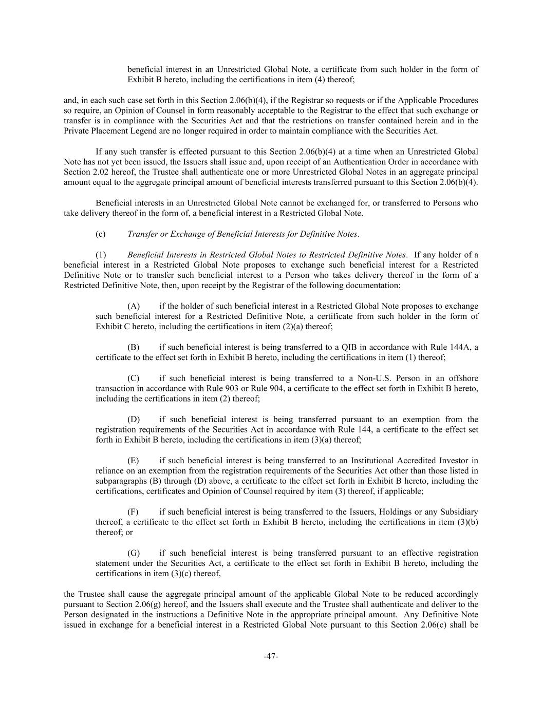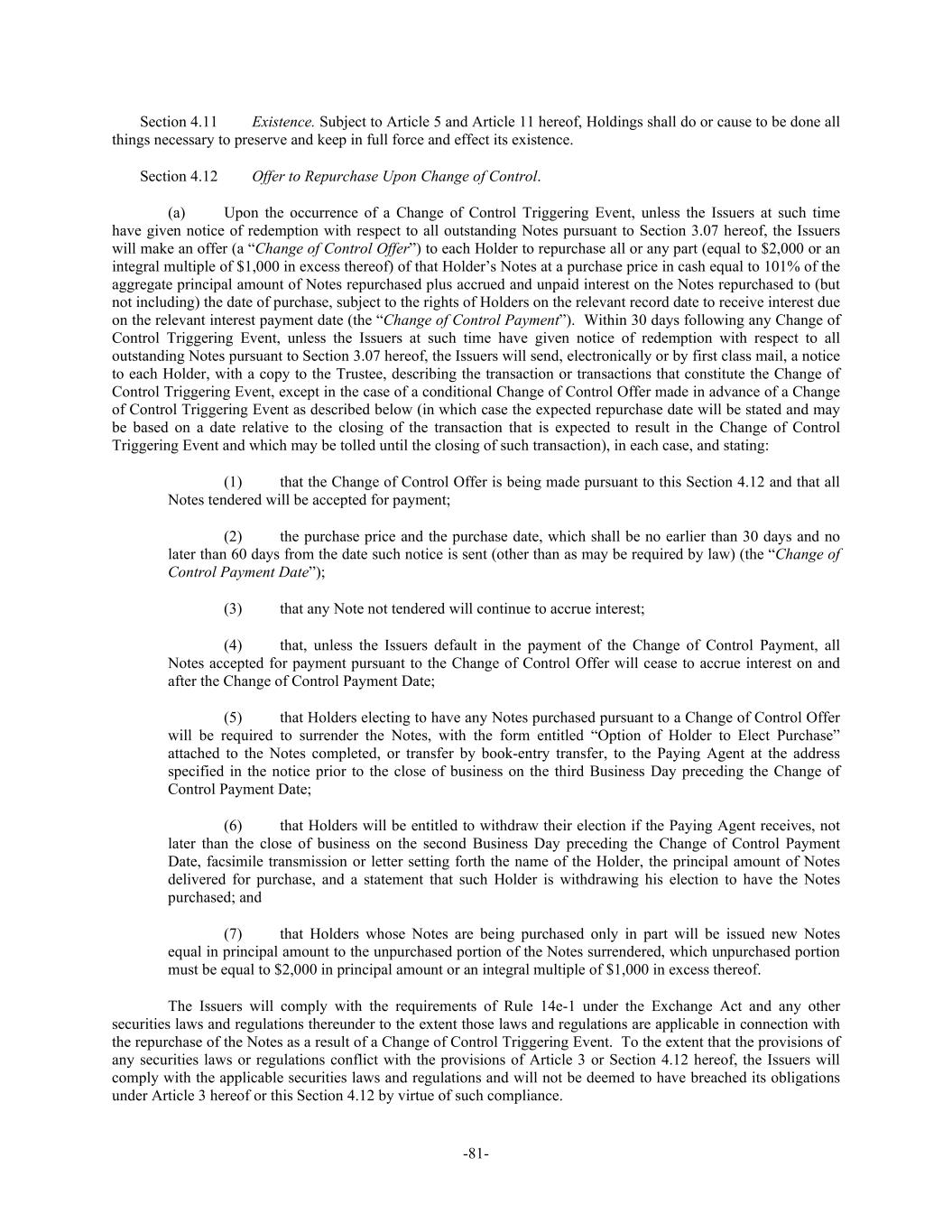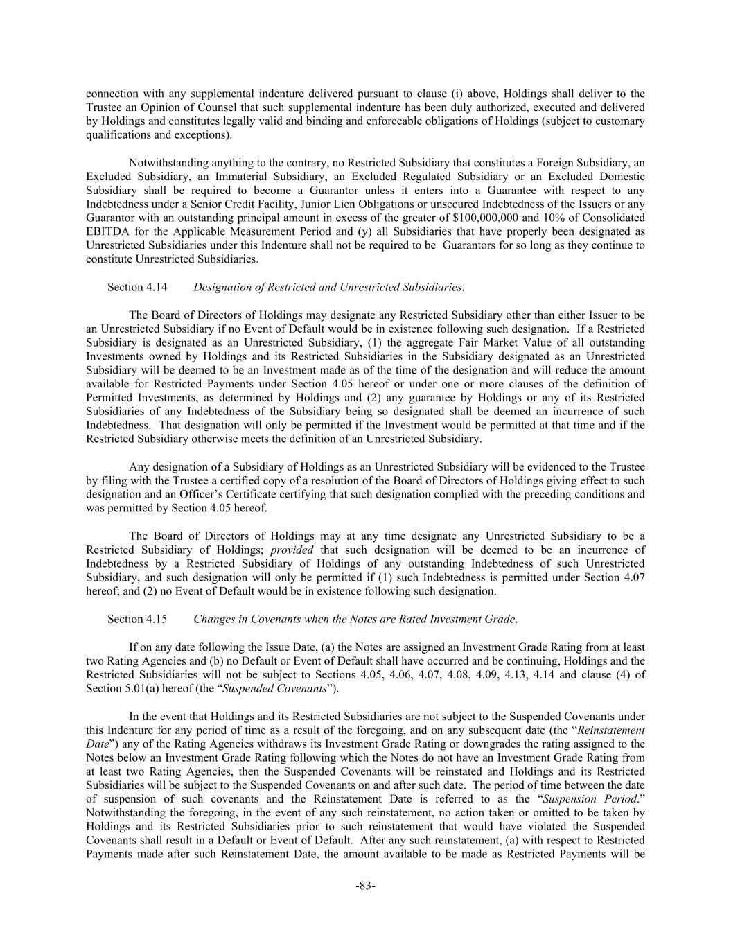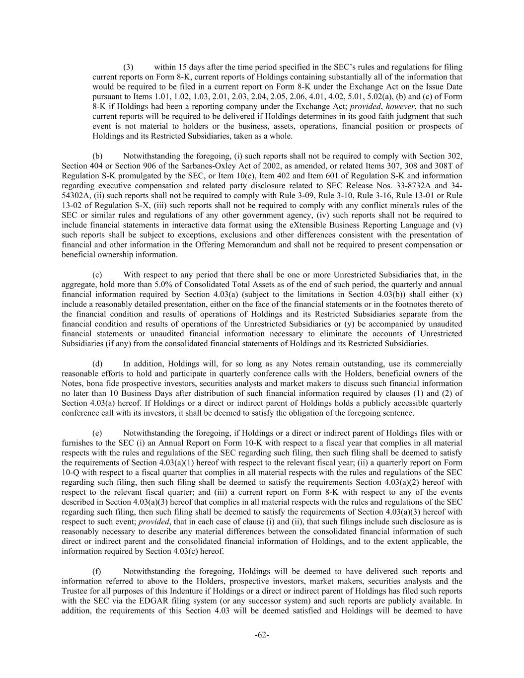 52 Tax Rate applies), Holdings shall be permitted to pay an additional amount with respect to such estimated payment date equal to the excess of such aggregate required annualized installment over the amount permitted under clause (i). “Permitted Unsecured Refinancing Debt” means unsecured Indebtedness incurred by any Loan Party in the form of one or more series of senior unsecured notes or loans; provided that (i) such Indebtedness constitutes Credit Agreement Refinancing Indebtedness, (ii) such Indebtedness does not mature or have scheduled amortization or payments of principal and is not subject to mandatory redemption, repurchase, prepayment or sinking fund obligation (except customary asset sale or change of control provisions), in each case prior to the date that is 91 days after the Latest Maturity Date at the time such Indebtedness is incurred, (iii) such Indebtedness is not at any time guaranteed by any Subsidiaries other than Loan Parties and (iv) such Indebtedness (including any Guarantee thereof) is not secured by any Lien on any property or assets of Holdings or any Restricted Subsidiary. Permitted Unsecured Refinancing Debt will include any Registered Equivalent Notes issued in exchange therefor. “Person” means any natural person, corporation, limited liability company, trust, joint venture, association, company, partnership, Governmental Authority or other entity. “Plan” means any employee pension benefit plan (other than a Multiemployer Plan) subject to the provisions of Title IV of ERISA or Section 412 of the Code or Section 302 of ERISA, and in respect of which the Borrower or any ERISA Affiliate is (or, if such plan were terminated, would under Section 4069 of ERISA be deemed to be) an “employer” as defined in Section 3(5) of ERISA. “Platform” has the meaning assigned to such term in Section 5.01. “Post-Transaction Period” has the meaning assigned to such term in the definition of “Pro Forma Adjustment.” “Prepayment Event” means: (a) any sale, transfer or other disposition (including (x) pursuant to a sale and leaseback transaction, (y) by way of merger or consolidation and (z) any casualty or other insured damage to, or any taking under power of eminent domain or by condemnation or similar proceeding) of any property or asset of Holdings or any of its Restricted Subsidiaries permitted by Section 6.05(f), (j), (k), (m) or (n) other than dispositions resulting in aggregate Net Proceeds not exceeding the greater of $20,000,000 or 2% of Consolidated EBITDA in the case of any single transaction or series of related transactions; or (b) the incurrence by the Borrower or any of its Restricted Subsidiaries of any Indebtedness, other than Indebtedness permitted under Section 6.01 (other than Permitted Unsecured Refinancing Debt, Permitted First Priority Refinancing Debt, Permitted Junior Lien Refinancing Debt and Other Term Loans which shall constitute a Prepayment Event to the extent required by the definition of “Credit Agreement Refinancing Indebtedness”) or permitted by the Required Lenders pursuant to Section 9.02. “primary obligor” has the meaning assigned to such term in the definition of “Guarantor.” “Prime Rate” means the rate of interest per annum last quoted by The Wall Street Journal as the “Prime Rate” in the U.S. or, if The Wall Street Journal ceases to quote such rate, the highest per annum interest rate published by the Federal Reserve Board in Federal Reserve Statistical Release H.15 (519) (Selected Interest Rates) as the “bank prime loan” rate or, if such rate is no longer quoted therein, any similar rate quoted therein (as determined by the Administrative Agent) or any similar release by the Federal