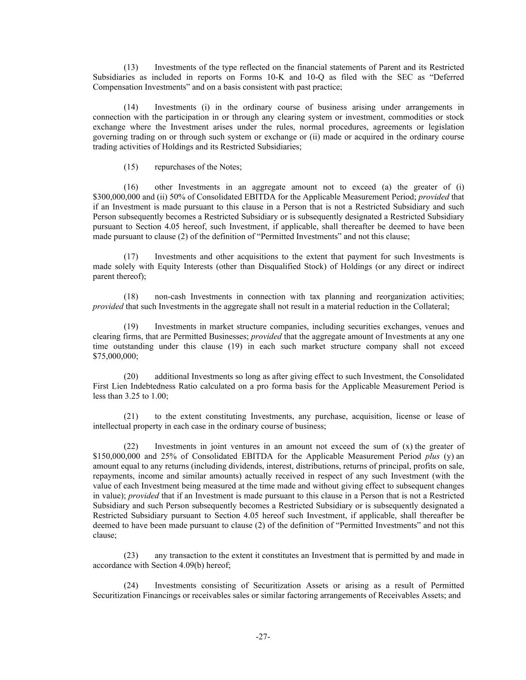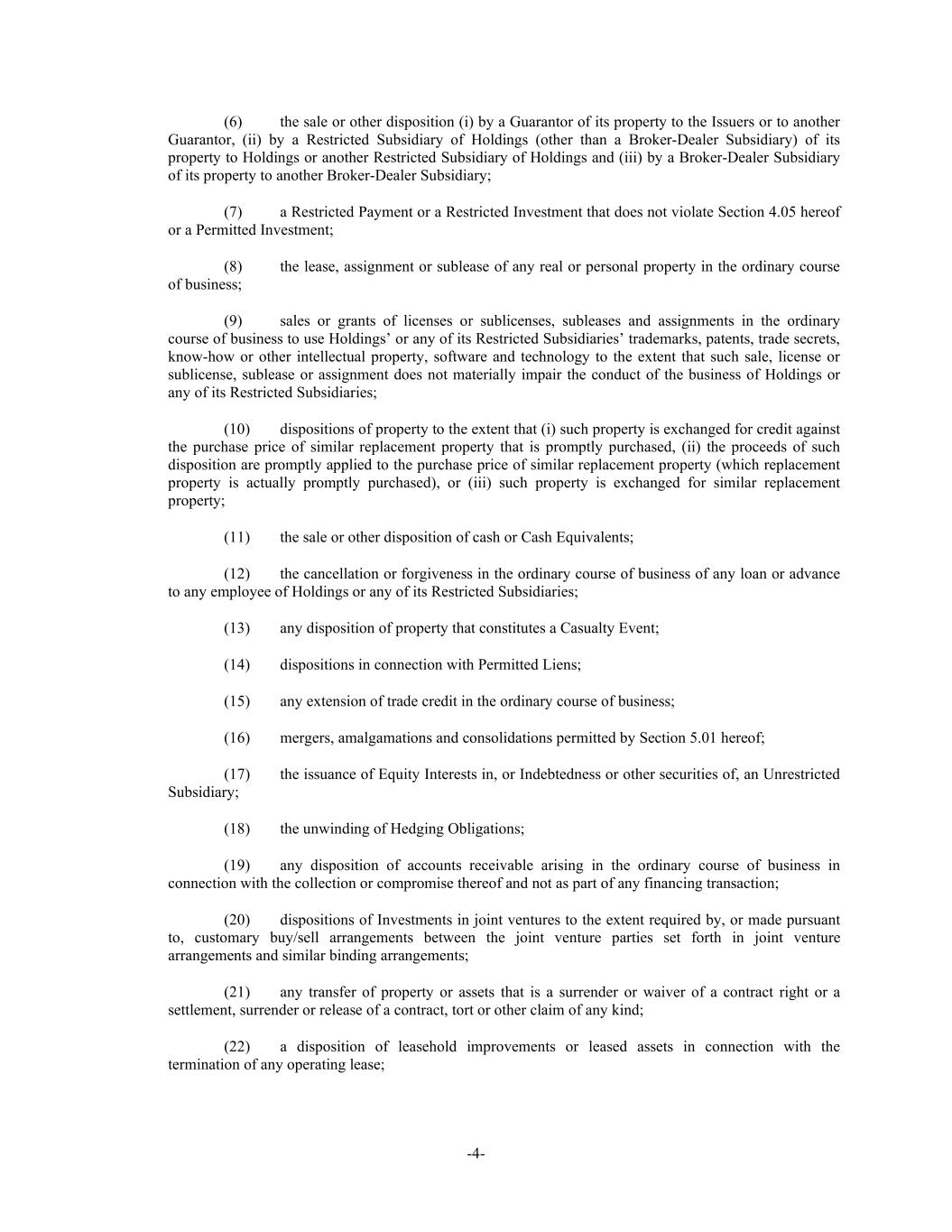 137 (v) [reserved]; (w) Investments in Joint Ventures in an amount not exceed the greater of $250,000,000 and 25% of Consolidated EBITDA calculated on a Pro Forma Basis for the most recently ended Test Period for which financial statements are available; (x) Investments in market structure companies, including securities exchanges, venues and clearing firms, in the ordinary course of business; provided that the aggregate amount of Investments at any one time outstanding under this clause (x) in any such market structure company shall not exceed $50,000,000; (y) Investments consisting of Securitization Assets or arising as a result of Permitted Securitization Financings; and (z) Investments by the Borrower and its Subsidiaries, including loans to any direct or indirect parent of the Borrower, if the Borrower or any other Subsidiary would otherwise be permitted to make a Restricted Payment in such amount (valued at the time of the making thereof, and without giving effect to any subsequent changes in value) pursuant to Sections 6.08(a)(iv), (v), (vii) (provided, that the outstanding amount of any such Investment shall also be deemed to be a Restricted Payment under the appropriate clause of Section 6.06 solely for purposes of determining capacity thereunder). For purposes of determining compliance with this covenant, (A) an Investment need not be permitted solely by reference to one category of permitted Investments (or portion thereof) described in the above clauses but may be permitted in part under any combination thereof, (B) in the event that an Investment (or any portion thereof) meets the criteria of one or more of the categories of permitted Investments (or any portion thereof) described in the above clauses, the Borrower may, in its sole discretion, classify or reclassify, or later divide, classify or reclassify, such permitted Investment (or any portion thereof) in any manner that complies with this covenant and at the time of classification or reclassification will be entitled to only include the amount and type of such Investment (or any portion thereof) in one of the categories of permitted Investments (or any portion thereof) described in the above clauses, (C) if such Investment could have been made as of any time in reliance of any financial test (including the Net Total Leverage Ratio, the Net Secured Leverage Ratio, the Net First Lien Leverage Ratio, the Fixed Charge Coverage Ratio, the Financial Performance Covenant and/or Consolidated EBITDA) based on the most recently delivered financial statements pursuant to Section 5.01(a) and/or (b), such Investment shall be automatically reclassified (with retroactive effect) as having been incurred under the applicable provisions and (D) the amount of any Investment shall be the amount actually invested, without adjustment for subsequent increases or decreases in the value of such Investment, but in each case, without duplication of any adjustments to the amount of Investments permitted under Section 6.04 (other than Section 6.04(l)), net of any return in respect thereof, including dividends, interest, distributions, returns of principal, profits on sale, repayments, income and similar amounts. Section 6.05. Asset Sales. Neither Holdings nor the Borrower will, nor will they permit any Restricted Subsidiary to, sell, transfer, lease or otherwise dispose of any asset, including any Equity Interest owned by it, nor will Holdings or the Borrower permit any Restricted Subsidiary to issue any additional Equity Interest in such Restricted Subsidiary (other than issuing directors’ qualifying shares, nominal shares issued to foreign nationals to the extent required by applicable Requirements of Law and other than issuing Equity Interests to Holdings, the Borrower or a Restricted Subsidiary in compliance with Section 6.04(c)) (each, a “Disposition”), except: (a) Dispositions of obsolete or worn out property, whether now owned or hereafter acquired, in the ordinary course of business and Dispositions of property (including abandonment of Intellectual