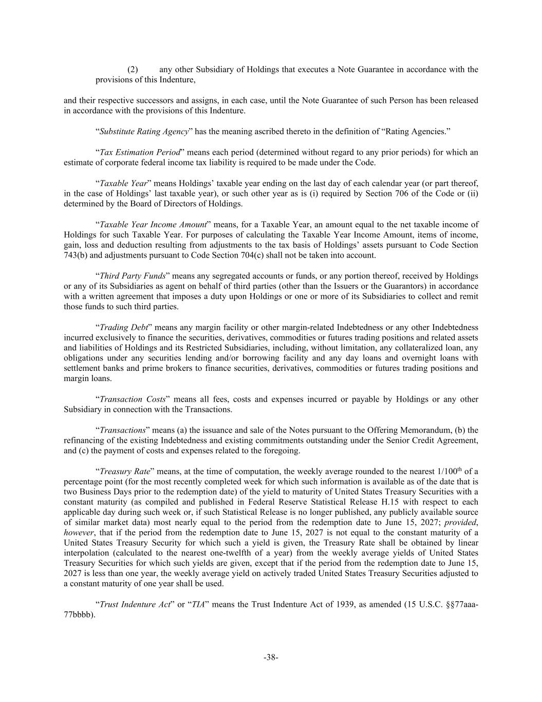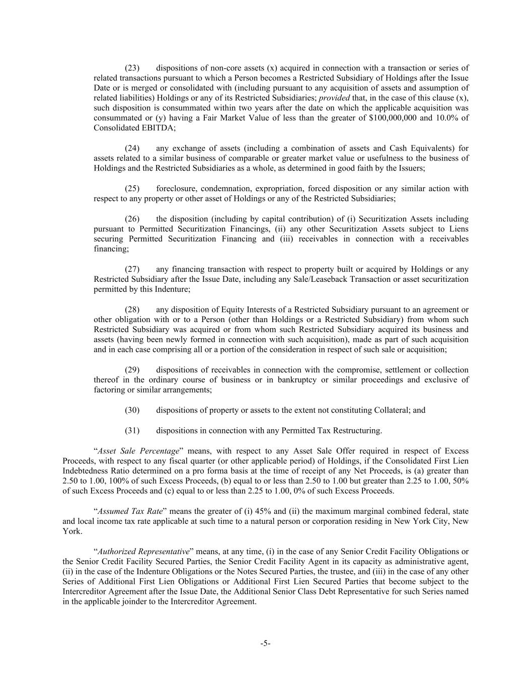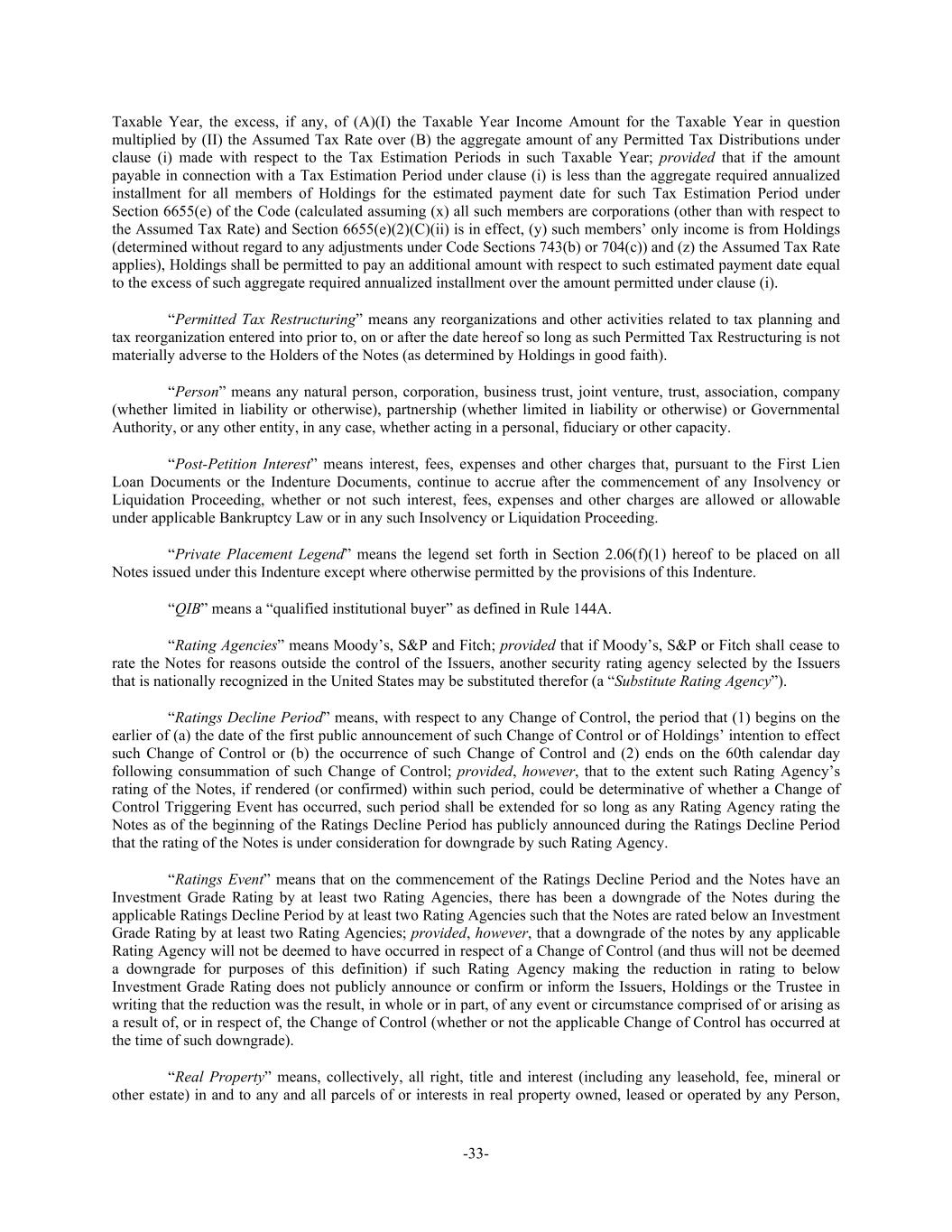 51 maturity date of, and has a Weighted Average Life to Maturity equal to or greater than the Weighted Average Life to Maturity of, the Indebtedness being modified, refinanced, refunded, renewed or extended, (c) other than with respect to a Permitted Refinancing in respect of Indebtedness permitted pursuant to Sections 6.01(a)(ii), 6.01(a)(v) and 6.01(a)(vii), immediately after giving effect thereto, no Event of Default shall have occurred and be continuing, (d) if the Indebtedness being modified, refinanced, refunded, renewed or extended is subordinated in right of payment or lien priority to the Loan Document Obligations, Indebtedness resulting from such Refinancing is subordinated in right of payment or lien priority, as applicable, to the Loan Document Obligations on terms in the aggregate at least as favorable to the Lenders as those contained in the documentation governing the Indebtedness being Refinanced and (e) if the Indebtedness being Refinanced is Indebtedness permitted pursuant to Sections 6.01(a)(ii), 6.01(a)(vii), 6.01(a)(xx) or 6.01(a)(xxi) or is otherwise a Junior Financing, (i) the terms and conditions (including, if applicable, as to collateral but excluding as to subordination, interest rate (including whether such interest is payable in cash or in kind) and redemption premium) of Indebtedness resulting from such Refinancing are not, taken as a whole, materially less favorable to the Loan Parties or the Lenders than the terms and conditions of the Indebtedness being Refinanced as determined by the Borrower in good faith, (ii) the primary obligor in respect of, and the Persons (if any) that Guarantee, Indebtedness resulting from such Refinancing are the primary obligor in respect of, and Persons (if any) that Guaranteed, respectively, the Indebtedness being Refinanced and (iii) if secured, such Indebtedness resulting from such Refinancing shall not be secured by assets that did not secure the Indebtedness being Refinanced (other than assets that would have secured such Indebtedness pursuant to after acquired property clauses). For the avoidance of doubt, it is understood that a Permitted Refinancing may constitute a portion of an issuance of Indebtedness in excess of the amount of such Permitted Refinancing; provided that such excess amount is otherwise permitted to be incurred under Section 6.01. “Permitted Securitization Financing” shall mean one or more transactions pursuant to which (i) Securitization Assets or interests therein are sold or transferred to or financed by one or more Special Purpose Securitization Subsidiaries, and (ii) such Special Purpose Securitization Subsidiaries finance (or refinance) their acquisition of such Securitization Assets or interests therein, or the financing thereof, by selling or borrowing against Securitization Assets and any Swap Agreements entered into in connection with such Securitization Assets; provided, that recourse to Holdings or any Subsidiary (other than the Special Purpose Securitization Subsidiaries) in connection with such transactions shall be limited to the extent customary (as determined by the Borrower in good faith) for similar transactions in the applicable jurisdictions (including, to the extent applicable, in a manner consistent with the delivery of a “true sale”/“absolute transfer” opinion with respect to any transfer by the Borrower or any Subsidiary (other than a Special Purpose Securitization Subsidiary)). “Permitted Tax Distributions” means, collectively distributions to the members of Holdings in cash in an amount up to (i) in the case of payments in respect of a Tax Estimation Period, the excess of (A)(I) the Company Income Amount for the Tax Estimation Period in question and for all preceding Tax Estimation Periods, if any, within the Taxable Year containing such Tax Estimation Period multiplied by (II) the Assumed Tax Rate over (B) the aggregate amount of any distributions made with respect to any previous Tax Estimation Period falling in the Taxable Year containing the applicable Tax Estimation Period referred to in (A)(I), and (ii) after the end of a Taxable Year, the excess, if any, of (A)(I) the Taxable Year Income Amount for the Taxable Year in question multiplied by (II) the Assumed Tax Rate over (B) the aggregate amount of any Permitted Tax Distributions under clause (i) made with respect to the Tax Estimation Periods in such Taxable Year; provided that if the amount payable in connection with a Tax Estimation Period under clause (i) is less than the aggregate required annualized installment for all members of Holdings for the estimated payment date for such Tax Estimation Period under Section 6655(e) of the Code (calculated assuming (x) all such members are corporations (other than with respect to the Assumed Tax Rate) and Section 6655(e)(2)(C)(ii) is in effect, (y) such members’ only income is from Holdings (determined without regard to any adjustments under Code Sections 743(b) or 704(c)) and (z) the Assumed