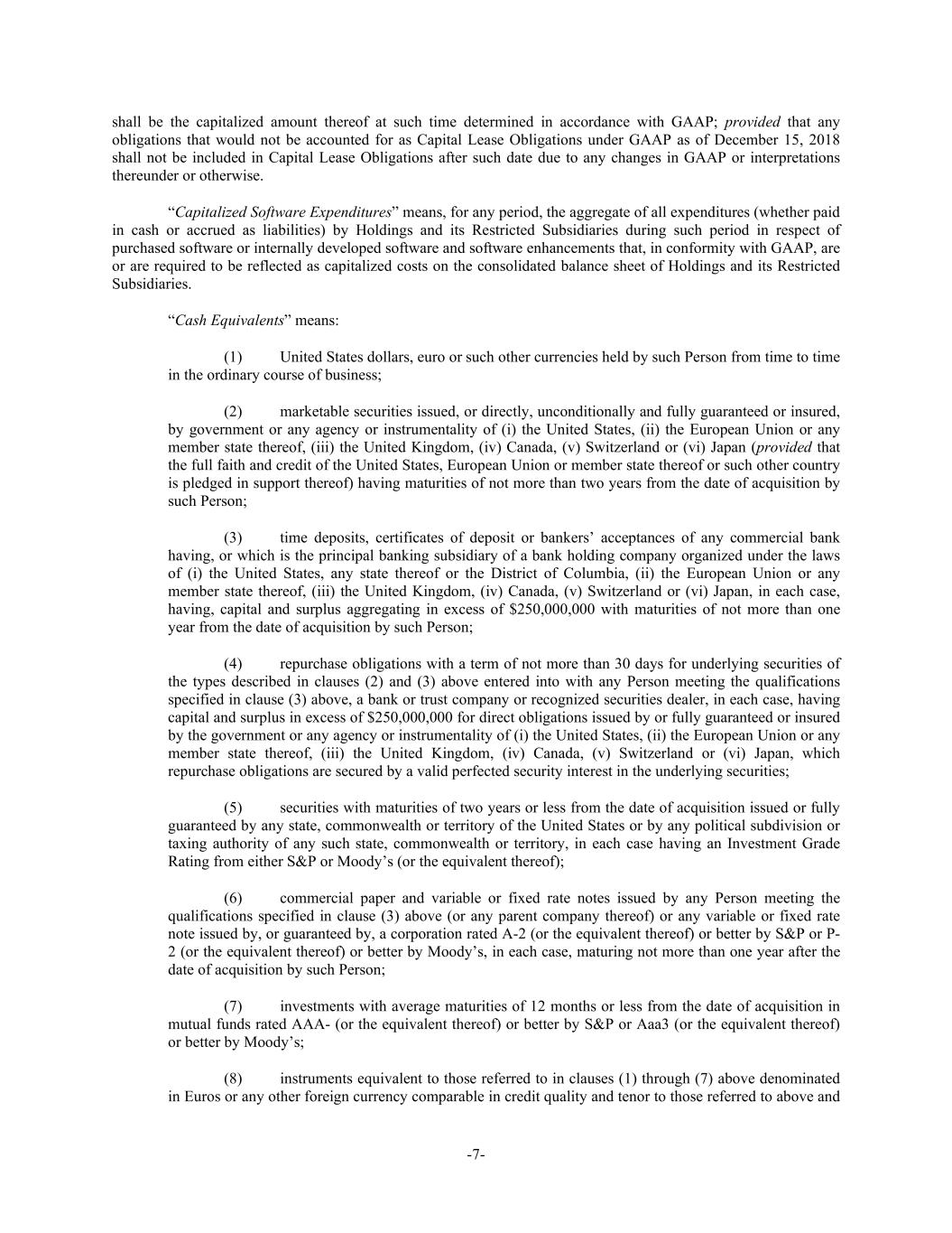 9 “Borrower Materials” has the meaning assigned to such term in Section 5.01. “Borrower Offer of Specified Discount Prepayment” means the offer by the Borrower to make a voluntary prepayment of Term Loans at a specified discount to par pursuant to Section 2.09(a)(ii)(B). “Borrower Solicitation of Discount Range Prepayment Offers” means the solicitation by the Borrower of offers for, and the corresponding acceptance by a Term Lender of, a voluntary prepayment of Term Loans at a specified range at a discount to par pursuant to Section 2.09(a)(ii)(C). “Borrower Solicitation of Discounted Prepayment Offers” means the solicitation by the Borrower of offers for, and the subsequent acceptance, if any, by a Term Lender of, a voluntary prepayment of Term Loans at a discount to par pursuant to Section 2.09(a)(ii)(D). “Borrowing” means (i) Loans of the same Class and Type, made, converted or continued on the same date and, in the case of Term Benchmark Loans, as to which a single Interest Period is in effect, or (ii) a Swingline Loan. “Borrowing Request” means a request by the Borrower for a Borrowing in accordance with Section 2.03. “Broker-Dealer Subsidiary” means any Restricted Subsidiary that is registered as (a) a broker or a dealer pursuant to Section 15 of the Exchange Act or (b) a broker or a dealer or an underwriter under any foreign securities law. “Business Day” means, any day (other than a Saturday or a Sunday) on which banks are open for business in New York City; provided that, when used in connection with a determination of the Term SOFR Reference Rate, the term “Business Day” means any such day that is also a day on which banks are open for business in Chicago. “Capital Lease Obligations” of any Person means the obligations of such Person to pay rent or other amounts under any lease of (or other arrangement conveying the right to use) real or personal property, or a combination thereof, which obligations are required to be classified and accounted for as capital leases or finance leases on a balance sheet of such Person under GAAP as in effect as of December 15, 2018, and the amount of such obligations shall be the capitalized amount thereof determined in accordance with GAAP. For purposes of Section 6.02, a Capital Lease Obligation shall be deemed to be secured by a Lien on the property being leased and such property shall be deemed to be owned by the lessee. “Capitalized Leases” means all leases that have been or should be, in accordance with GAAP as in effect as of December 15, 2018, recorded as capitalized leases or finance leases; provided that for all purposes hereunder the amount of obligations under any Capitalized Lease shall be the amount thereof accounted for as a liability in accordance with GAAP. “Capitalized Software Expenditures” means, for any period, the aggregate of all expenditures (whether paid in cash or accrued as liabilities) by Holdings and its Restricted Subsidiaries during such period in respect of purchased software or internally developed software and software enhancements that, in conformity with GAAP, are or are required to be reflected as capitalized costs on the consolidated balance sheet of Holdings and the Restricted Subsidiaries. “Cash Management Obligations” means obligations of Holdings, any Intermediate Parent, the Borrower or any Restricted Subsidiary in respect of any overdraft and related liabilities arising from treasury, depository and cash management services or any automated clearing house transfers of funds.