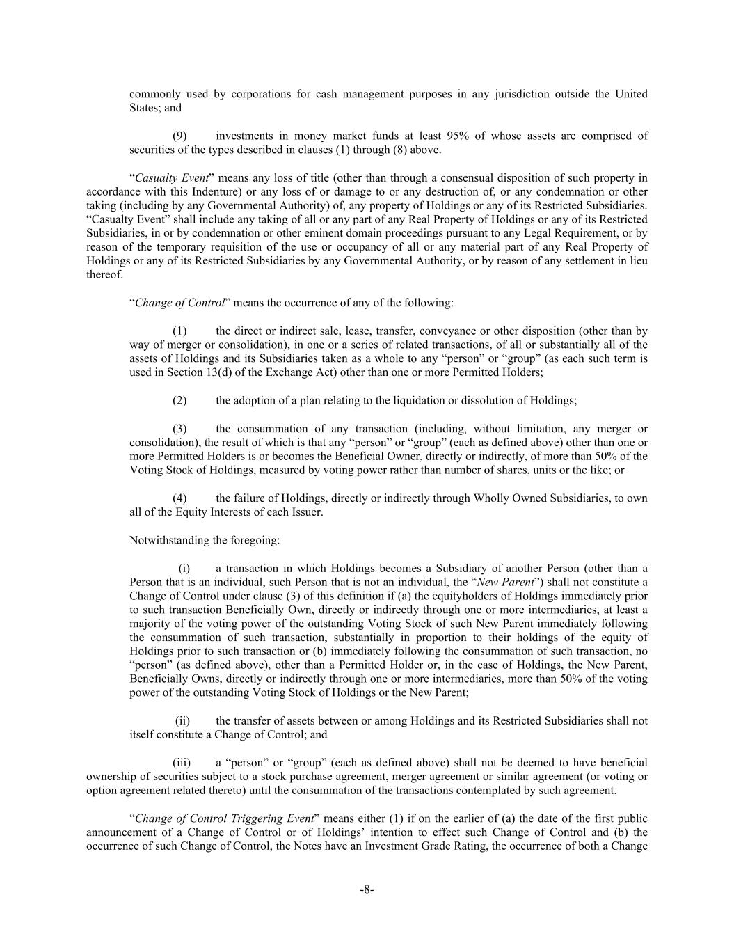 10 “Casualty Event” means any event that gives rise to the receipt by Holdings, any Intermediate Parent, the Borrower or any Restricted Subsidiary of Holdings of any insurance proceeds or condemnation awards in respect of any equipment, fixed assets or real property (including any improvements thereon) to replace or repair such equipment, fixed assets or real property. “CFC” has the meaning assigned to such term in the definition of “Excluded Domestic Subsidiary.” “Change in Control” means the occurrence of any of the following: (a) the direct or indirect sale, lease, transfer, conveyance or other disposition (other than by way of merger or consolidation), in one or a series of related transactions, of all or substantially all of the assets of Holdings and its Subsidiaries taken as a whole to any “person” or “group” (as each such term is used in Section 13(d) of the Exchange Act) other than Holdings, one or more or its Restricted Subsidiaries, or one or more Permitted Holders; (b) the adoption of a plan relating to the liquidation or dissolution of Holdings; (c) the consummation of any transaction (including, without limitation, any merger or consolidation), the result of which is that any “person” or “group” (each as defined above) other than one or more Permitted Holders is or becomes the Beneficial Owner, directly or indirectly, of more than 50% of the Voting Stock of Holdings, measured by voting power rather than number of shares, units or the like; (d) the failure of either VFI or Holdings, directly or indirectly through Wholly Owned Subsidiaries, to own all of the Equity Interests of the Borrower; or (e) the occurrence of a “Change of Control” (or similar event, however denominated), as defined in the documentation governing any Material Indebtedness that is Permitted First Priority Refinancing Debt, Permitted Junior Lien Refinancing Debt, Permitted Unsecured Refinancing Debt, Incremental Equivalent Debt or Junior Financing. In addition, notwithstanding the foregoing, (i) a transaction in which the Borrower, Holdings or a direct or indirect parent entity of Holdings becomes a direct or indirect subsidiary of another person shall not constitute a Change in Control if (A) the equityholders of the Borrower, Holdings or such parent entity immediately prior to such transaction beneficially own, directly or indirectly through one or more intermediaries, at least a majority of the total voting power of the Voting Stock of the Borrower, Holdings or such parent entity immediately following the consummation of such transaction, substantially in proportion to their holdings of the equity of the Borrower, Holdings or such parent entity prior to such transaction or (B) immediately following the consummation of such transaction, no “person” or “group” (each as defined above), other than one or more Permitted Holders is or becomes the Beneficial Owner, directly or indirectly, of more than 50% of the Voting Stock of the Borrower, Holdings or such parent entity, measured by voting power rather than number of shares, units or the like and (ii) a “person” or “group” (each as defined above) shall not be deemed to Beneficially Own Voting Stock to be acquired pursuant to a stock or asset purchase agreement, merger agreement, option agreement, warrant agreement or similar agreement providing a right to acquire Voting Stock (or voting or option or similar agreement related thereto) until the consummation of the acquisition of the Voting Stock in connection with the transactions contemplated by such agreement (so long as such agreement does not give such “person” or “group” the right to direct the voting of the applicable Voting Stock prior to the consummation of such acquisition). “Change in Law” means: (a) the adoption of any rule, regulation, treaty or other law after the Closing Date, (b) any change in any rule, regulation, treaty or other law or in the administration, interpretation or application thereof by any Governmental Authority or Regulatory Supervising Organization after the Closing Date or (c) the making or issuance of any request, guideline or directive (whether or not having the force of law) of any Governmental Authority or Regulatory Supervising Organization made or issued after the Closing Date. “Class” when used in reference to (a) any Loan or Borrowing, refers to whether such Loan, or the Loans comprising such Borrowing, are Revolving Loans, Other Revolving Loans, Initial Term B-1 Loans,