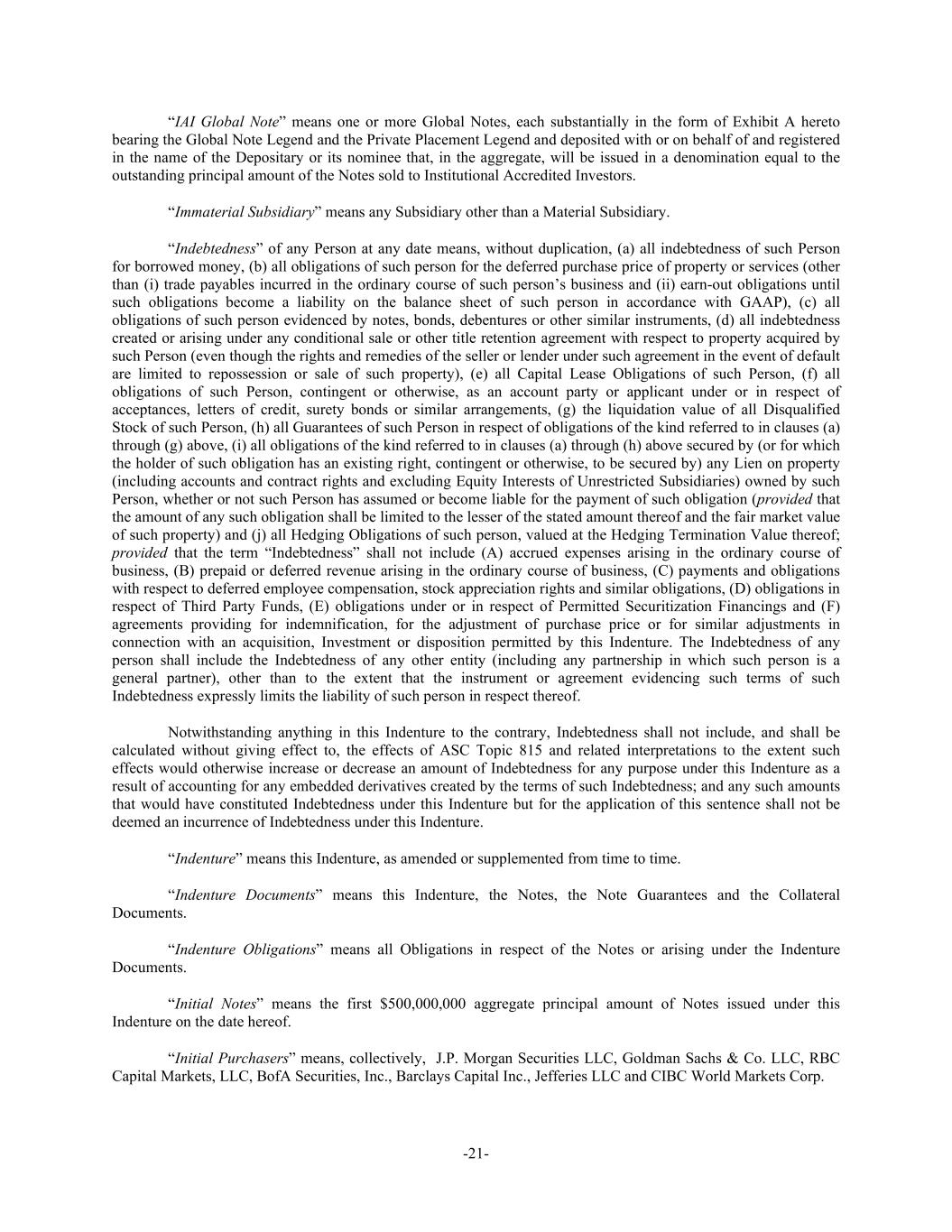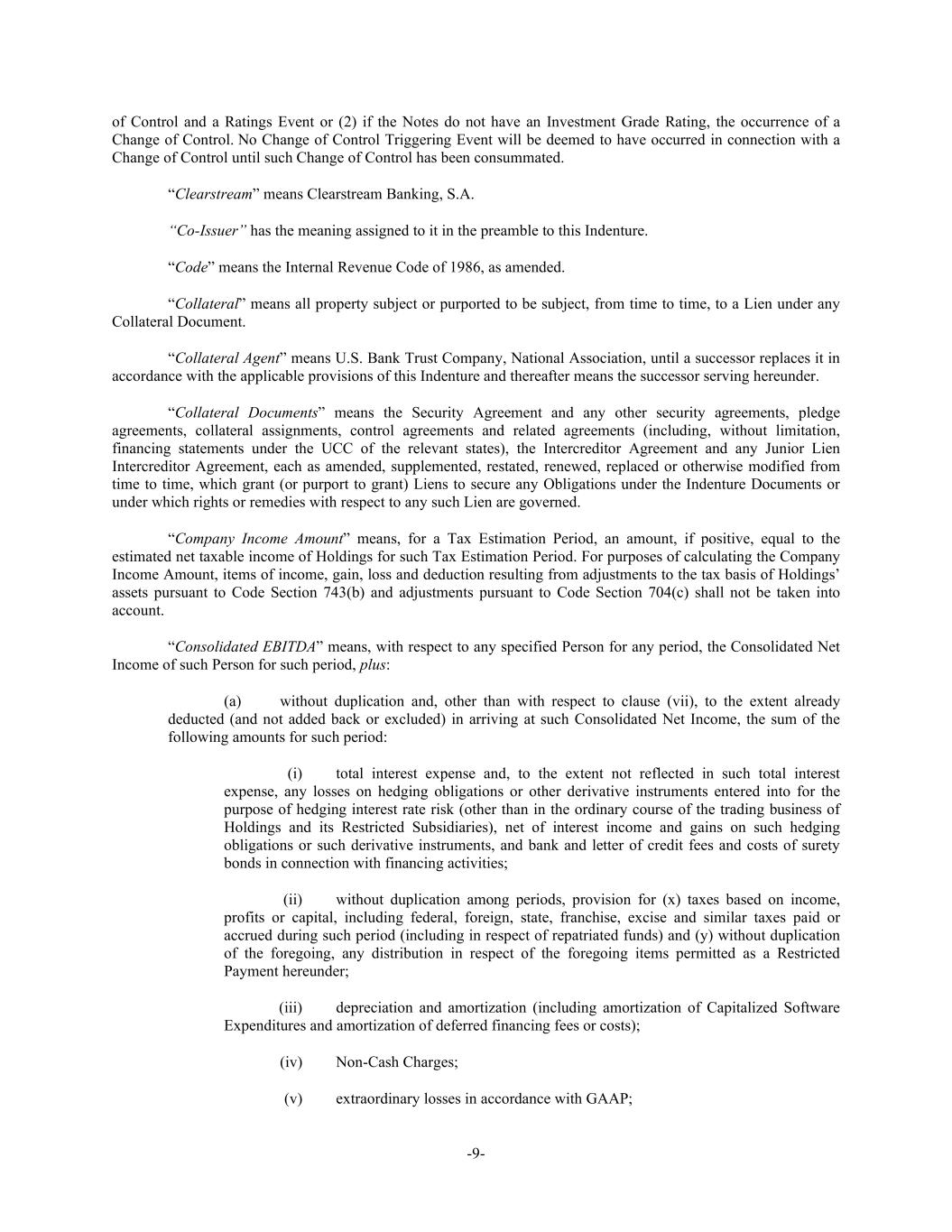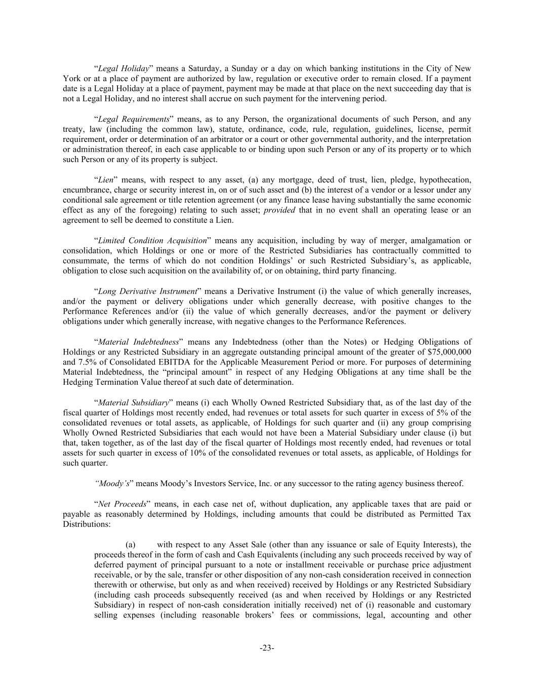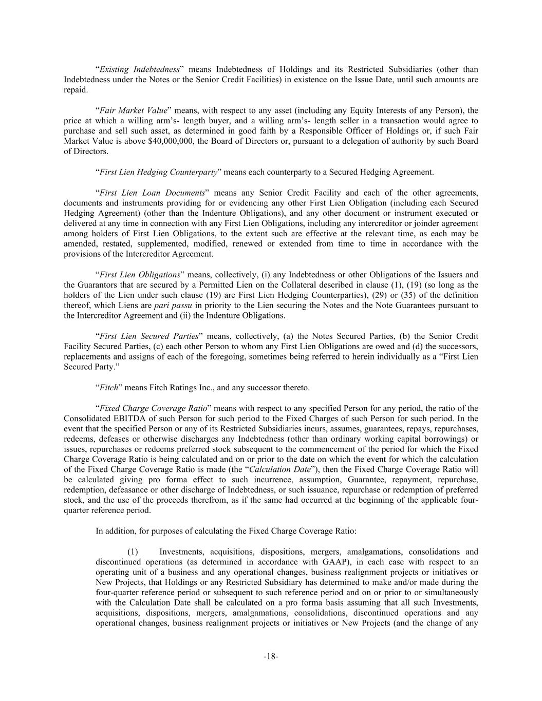 35 “Holdings LLC Agreement” means the Limited Liability Company Agreement of Holdings pursuant to which the members of Holdings hold limited liability interests of Holdings, together with all exhibits and schedules thereto, as in effect as of the Closing Date. “Identified Participating Lenders” has the meaning assigned to such term in Section 2.09(a)(ii)(C)(3). “Identified Qualifying Lenders” has the meaning assigned to such term in Section 2.09(a)(ii)(D)(3). “Immaterial Subsidiary” means any Subsidiary other than a Material Subsidiary. “Increased Amount” of any Indebtedness shall mean any increase in the amount of such Indebtedness in connection with any accrual of interest, the accretion of accreted value, the amortization of original issue discount or deferred financing fees, the payment of interest or dividends in the form of additional Indebtedness or in the form of Equity Interests, as applicable, the accretion of original issue discount, deferred financing fees or liquidation preference and increases in the amount of Indebtedness outstanding solely as a result of fluctuations in the exchange rate of currencies. “Incremental Cap” means, at any time, an aggregate principal amount not to exceed the sum of (a) the excess of (i) the greater of $1,000,000,000 and 100% of Consolidated EBITDA on a Pro Forma Basis for the most recently ended Test Period for which financial statements are available (as of the date of establishment or incurrence of the applicable Incremental Facility or Incremental Equivalent Debt (or, at the option of the Borrower, as of the date of establishment of the commitments in respect thereof, in which case such Incremental Facility or Incremental Equivalent Debt shall be deemed fully funded and incurred)), over (ii) the aggregate amount of Incremental Facilities established and Incremental Equivalent Debt incurred, in each case, after the ClosingFirst Amendment Effective Date and prior to such time utilizing this clause (a), plus (b) an additional amount so long as, in the case of this clause (b), on the date of incurrence thereof (or, at the option of the Borrower, on the date of establishment of the commitments in respect thereof), after giving effect to the incurrence of such Indebtedness and the use of the proceeds thereof (assuming, in the case of testing at time establishment of Commitments, that the committed amounts are fully drawn) (i) if such Incremental Facility or Incremental Equivalent Debt is secured by Liens on the Collateral on a pari passu basis with the Liens on the Collateral securing the Initial Term B-1 Loans, either (A) the Net First Lien Leverage Ratio calculated on a Pro Forma Basis as of the end of the most recent Test Period for which financial statements are available does not exceed 2.50:1.00 (the “First Lien Incurrence Ratio”) or (B) in the case of any Incremental Facility or Incremental Equivalent Debt incurred in connection with a Permitted Acquisition or any other Investment permitted under Section 6.04 or New Project not prohibited hereunder (“Acquisition Debt”), the Net First Lien Leverage Ratio calculated on a Pro Forma Basis as of the end of the most recent Test Period for which financial statements are available either (x) does not exceed the First Lien Incurrence Ratio or (y) is not greater than the Net First Lien Leverage Ratio immediately prior to such incurrence of Indebtedness and Permitted Acquisition, other Investment or New Project, (ii) if such Incremental Facility or Incremental Equivalent Debt is secured by Liens on the Collateral on a junior basis to the Liens on the Collateral securing the Initial Term B-1 Loans, either (A) the Net Secured Leverage Ratio calculated on a Pro Forma Basis as of the end of the most recent Test Period for which financial statements are available does not exceed 3.00:1.00 (the “Secured Leverage Incurrence Ratio”) or (B) in the case of any Incremental Facility or Incremental Equivalent Debt that is Acquisition Debt, the Net Secured Leverage Ratio calculated on a Pro Forma Basis as of the end of the most recent Test Period for which financial statements are available either (x) does not exceed the Secured Leverage Incurrence Ratio or (y) is not greater than the Net Secured Leverage Ratio immediately prior to such incurrence of Indebtedness and Permitted Acquisition, other Investment or New Project, and (iii) if such Incremental Facility or Incremental Equivalent Debt is unsecured, either (A) (x) the Fixed Charge
