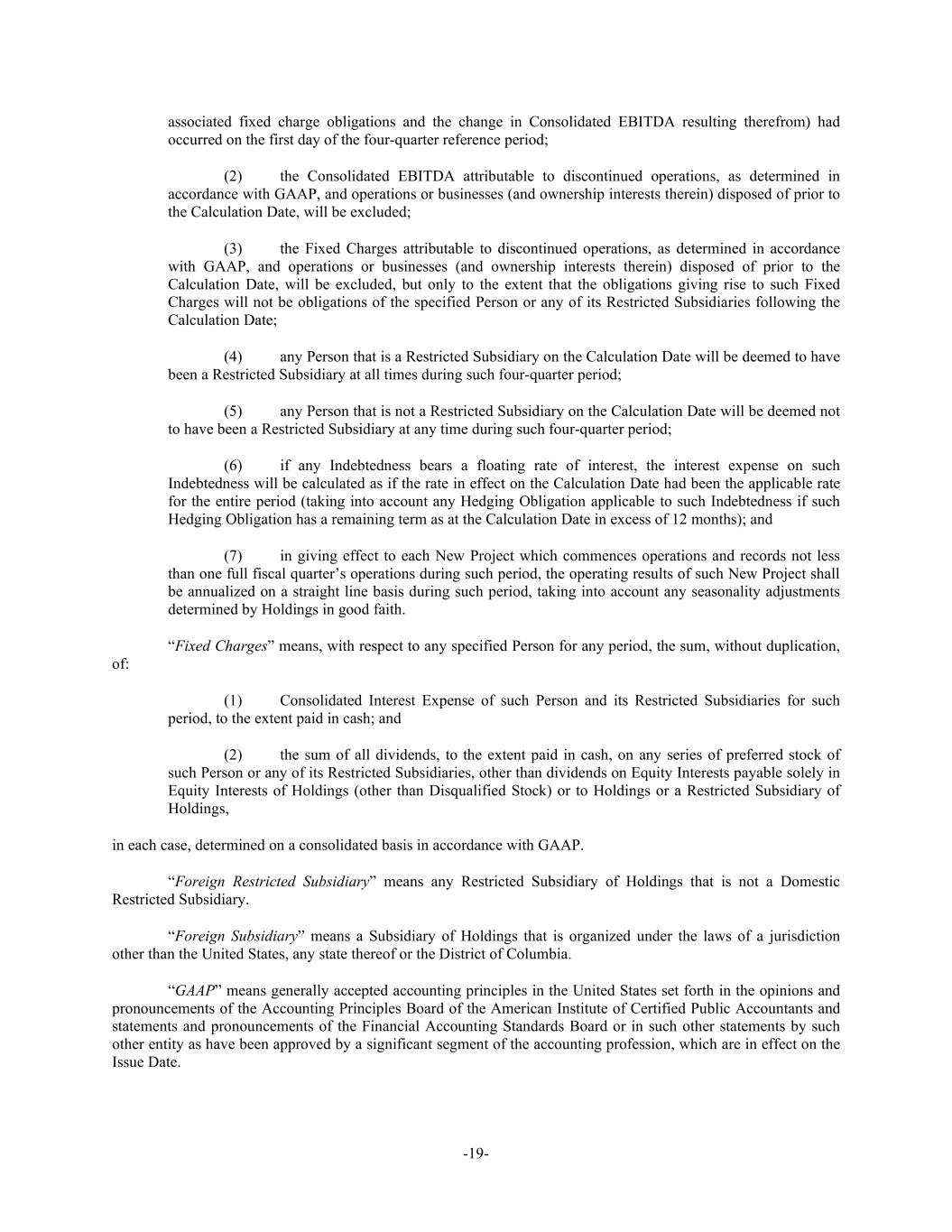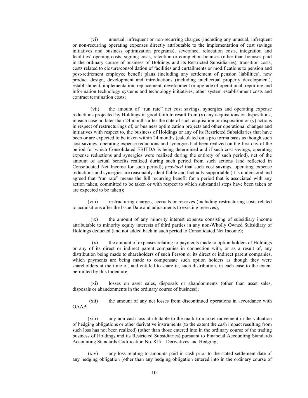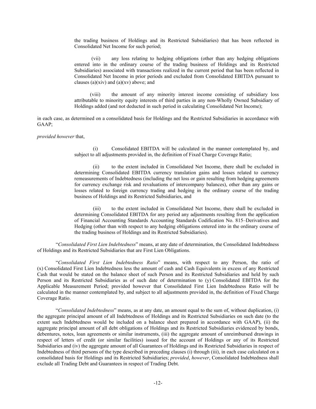 17 (vi) any gain relating to amounts received in cash prior to the stated settlement date of any hedging obligation (other than any hedging obligation entered into in the ordinary course of the trading business of Holdings and its Restricted Subsidiaries) that has been reflected in Consolidated Net Income for such period; (vii) any loss relating to hedging obligations (other than any hedging obligations entered into in the ordinary course of the trading business of Holdings and its Restricted Subsidiaries) associated with transactions realized in the current period that has been reflected in Consolidated Net Income in prior periods and excluded from Consolidated EBITDA pursuant to clauses (a)(xiii) and (a)(xiv) above; and (viii) the amount of any minority interest income consisting of subsidiary loss attributable to minority equity interests of third parties in any Non-Wholly Owned Subsidiary of Holdings added (and not deducted in such period in calculating Consolidated Net Income); in each case, as determined on a consolidated basis for Holdings and the Restricted Subsidiaries in accordance with GAAP; provided that, (I) to the extent included in Consolidated Net Income, there shall be excluded in determining Consolidated EBITDA currency translation gains and losses related to currency remeasurements of Indebtedness (including the net loss or gain resulting from hedging agreements for currency exchange risk and revaluations of intercompany balances), other than any gains or losses related to foreign currency trading and hedging in the ordinary course of the trading business of Holdings and its Restricted Subsidiaries, (II) to the extent included in Consolidated Net Income, there shall be excluded in determining Consolidated EBITDA for any period any adjustments resulting from the application of Financial Accounting Standards Accounting Standards Codification No. 815–Derivatives and Hedging (other than with respect to any hedging obligations entered into in the ordinary course of the trading business of Holdings and its Restricted Subsidiaries), (III) to the extent not included in Consolidated Net Income, there shall be included in determining Consolidated EBITDA for any period, without duplication, (A) the Acquired EBITDA of any Person, property, business or asset acquired by Holdings or any Restricted Subsidiary during such period (other than any Unrestricted Subsidiary) to the extent not subsequently sold, transferred or otherwise disposed of (but not including the Acquired EBITDA of any related Person, property, business or assets to the extent not so acquired) (each such Person, property, business or asset acquired, including pursuant to a transaction consummated prior to the Closing Date, and not subsequently so disposed of, an “Acquired Entity or Business”), and the Acquired EBITDA of any Unrestricted Subsidiary that is converted into a Restricted Subsidiary during such period (each, a “Converted Restricted Subsidiary”), in each case based on the Acquired EBITDA of such Pro Forma Entity for such period (including the portion thereof occurring prior to such acquisition or conversion) determined on a historical Pro Forma Basis and (B) an adjustment in respect of each Pro Forma Entity equal to the amount of the Pro Forma Adjustment with respect to such Pro Forma Entity for such period (including the portion thereof occurring prior to such acquisition or conversion) as specified in a certificate from a Financial Officer delivered to the Administrative Agent (for further delivery to the Lenders); and (IV) there shall be (A) to the extent included in Consolidated Net Income, excluded in determining Consolidated EBITDA for any period the Disposed EBITDA of any Person, property, business or asset (other than any Unrestricted Subsidiary) sold, transferred or otherwise disposed