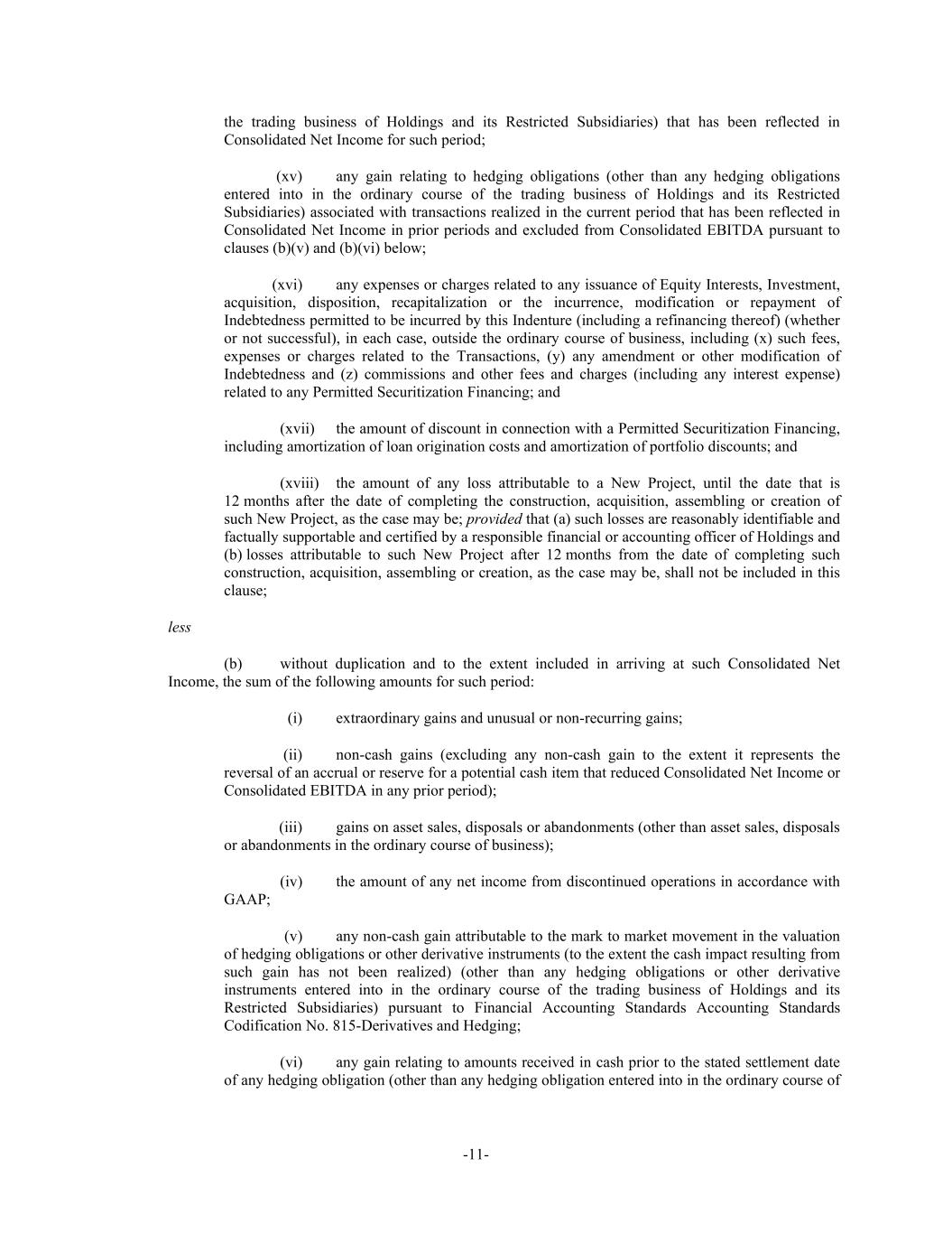 16 business of the Borrower and its Restricted Subsidiaries) pursuant to Financial Accounting Standards Accounting Standards Codification No. 815–Derivatives and Hedging; (xiii) any loss relating to amounts paid in cash prior to the stated settlement date of any hedging obligation (other than any hedging obligation entered into in the ordinary course of the trading business of Holdings and its Restricted Subsidiaries) that has been reflected in Consolidated Net Income for such period; (xiv) any gain relating to hedging obligations (other than any hedging obligations entered into in the ordinary course of the trading business of Holdings and its Restricted Subsidiaries) associated with transactions realized in the current period that has been reflected in Consolidated Net Income in prior periods and excluded from Consolidated EBITDA pursuant to clauses (b)(v) and (b)(vi) below; (xv) any expenses or charges related to any issuance of Equity Interests, Investment, acquisition, Disposition, recapitalization or the incurrence, modification or repayment of Indebtedness permitted to be incurred by this Agreement (including a refinancing thereof) (whether or not successful), in each case, outside the ordinary course of business, including (x) such fees, expenses or charges related to this Agreement, (y) any amendment or other modification of the Loans or other obligations under the Loan Documents or other Indebtedness and (z) commissions and other fees and charges (including any interest expense) related to any Permitted Securitization Financing; and (xvi) the amount of discount in connection with a Permitted Securitization Financing, including amortization of loan origination costs and amortization of portfolio discounts; less (b) without duplication and to the extent included in arriving at such Consolidated Net Income, the sum of the following amounts for such period: (i) extraordinary gains and unusual or non-recurring gains; (ii) non-cash gains (excluding any non-cash gain to the extent it represents the reversal of an accrual or reserve for a potential cash item that reduced Consolidated Net Income or Consolidated EBITDA in any prior period); (iii) gains on asset sales, disposals or abandonments (other than asset sales, disposals or abandonments in the ordinary course of business); (iv) the amount of any net income from discontinued operations in accordance with GAAP; (v) any non-cash gain attributable to the mark to market movement in the valuation of hedging obligations or other derivative instruments (to the extent the cash impact resulting from such gain has not been realized) (other than any hedging obligations or other derivative instruments entered into in the ordinary course of the trading business of Holdings and its Restricted Subsidiaries) pursuant to Financial Accounting Standards Accounting Standards Codification No. 815–Derivatives and Hedging;