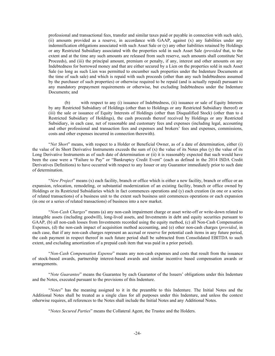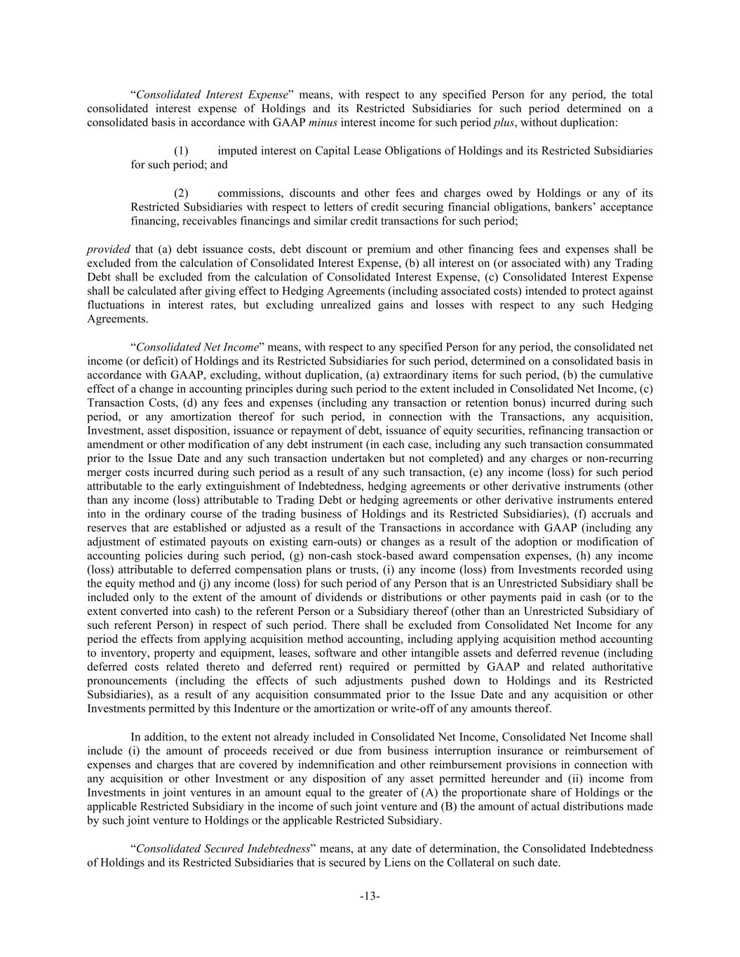 18 of, closed or classified as discontinued operations by Holdings or any Restricted Subsidiary during such period (each such Person, property, business or asset so sold, transferred or otherwise disposed of, closed or classified, a “Sold Entity or Business”), and the Disposed EBITDA of any Restricted Subsidiary that is converted into an Unrestricted Subsidiary during such period (each, a “Converted Unrestricted Subsidiary”), in each case based on the Disposed EBITDA of such Sold Entity or Business or Converted Unrestricted Subsidiary for such period (including the portion thereof occurring prior to such sale, transfer, disposition, closure, classification or conversion) determined on a historical pro forma basis and (B) to the extent not included in Consolidated Net Income, included in determining Consolidated EBITDA for any period in which a Sold Entity or Business is disposed or Converted Unrestricted Subsidiary is converted, an adjustment equal to the Pro Forma Disposal Adjustment with respect to such Sold Entity or Business or Converted Unrestricted Subsidiary (including the portion thereof occurring prior to such disposal or conversion) as specified in a certificate from a Financial Officer delivered to the Administrative Agent (for further delivery to the Lenders). “Consolidated First Lien Debt” means, as of any date of determination, the aggregate amount of Consolidated Total Debt outstanding on such date, without duplication (x) constituting the Loan Document Obligations that are secured by a first priority Lien on the Collateral or (y) that is secured on a pari passu basis with the Initial Term B-1 Loans by a first priority Lien on the Collateral. “Consolidated First Lien Net Debt” means, as of any date of determination, (a) the amount of Consolidated First Lien Debt as of such date, less (b) all unrestricted cash and Permitted Investments on the balance sheet of Holdings to the extent not subject to any Liens (other than Liens permitted under Section 6.02 but excluding any Liens permitted by Section 6.02(iii), Section 6.02(xv) and Section 6.02(xx)) and the use thereof for application to the payment of Indebtedness is not prohibited by law or contract binding on Holdings. “Consolidated Interest Expense” means, for any period, the cash interest expense (including that attributable to Capitalized Leases), net of cash interest income (excluding cash interest income relating to any asset or property that secures any Trading Debt), of Holdings and the Restricted Subsidiaries, determined on a consolidated basis in accordance with GAAP, with respect to all outstanding Indebtedness of Holdings and the Restricted Subsidiaries (excluding Trading Debt), including all commissions, discounts and other fees and charges owed with respect to letters of credit and bankers’ acceptance financing and net costs under hedging agreements, but excluding, for the avoidance of doubt, (i) amortization of deferred financing costs, debt issuance costs, commissions, fees and expenses, pay-in-kind interest expense and any other amounts of non-cash interest (including as a result of the effects of acquisition method accounting), (ii) the accretion or accrual of discounted liabilities during such period, (iii) any interest in respect of items excluded from Indebtedness in the proviso to the definition thereof, (iv) non-cash interest expense attributable to the movement of the mark-to-market valuation of obligations under hedging agreements or other derivative instruments pursuant to Financial Accounting Standards Accounting Standards Codification No. 815-Derivatives and Hedging, (v) any one-time cash costs associated with breakage in respect of hedging agreements for interest rates, and (vi) all non-recurring cash interest expense consisting of liquidated damages for failure to timely comply with registration rights obligations, all as calculated on a consolidated basis in accordance with GAAP. “Consolidated Net Income” means, for any period, the net income (loss) of Holdings and the Restricted Subsidiaries for such period determined on a consolidated basis in accordance with GAAP, excluding, without duplication, (a) extraordinary items for such period, (b) the cumulative effect of a change in accounting principles during such period to the extent included in Consolidated Net Income, (c) [reserved], (d) any fees and expenses (including any transaction or retention bonus) incurred during such period, or any amortization thereof for such period, in connection with any acquisition, Investment, asset