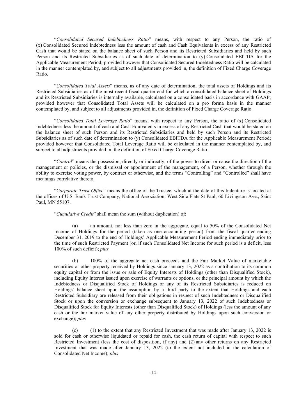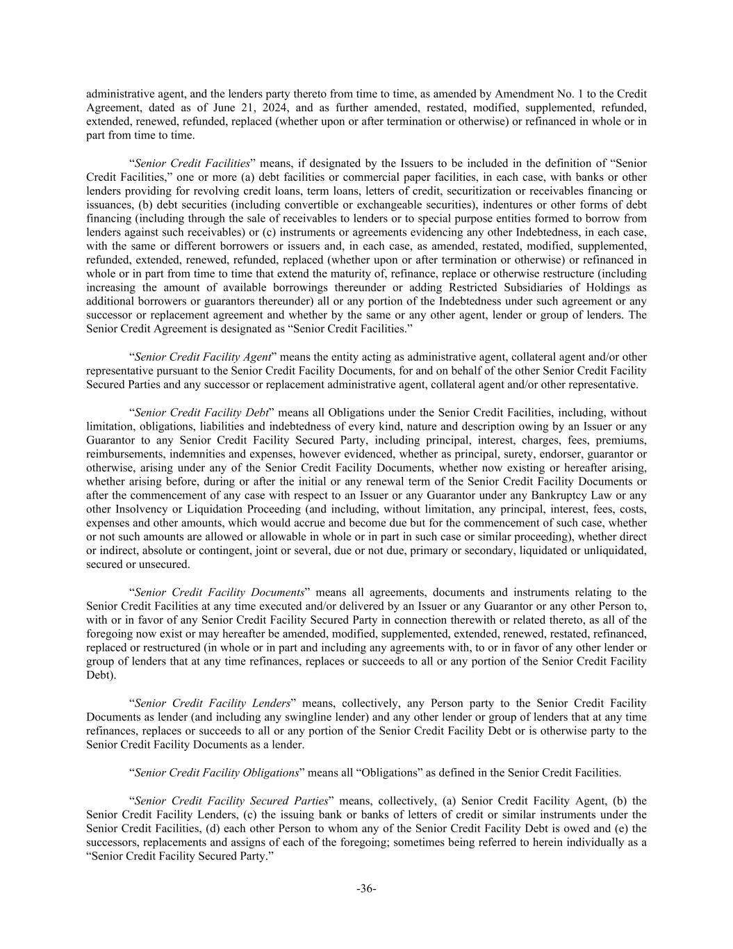 20 through the ability to exercise voting power, by contract or otherwise. “Controlling” and “Controlled” have meanings correlative thereto. “Converted Restricted Subsidiary” has the meaning assigned to such term in the definition of “Consolidated EBITDA.” “Converted Unrestricted Subsidiary” has the meaning assigned to such term in the definition of “Consolidated EBITDA.” “Corresponding Tenor” with respect to any Available Tenor means, as applicable, either a tenor (including overnight) or an interest payment period having approximately the same length (disregarding business day adjustment) as such Available Tenor. “Covered Entity” has the meaning assigned to such term in Section 9.21(b). “Covered Party” has the meaning assigned to such term in Section 9.21(a). “Credit Agreement Refinancing Indebtedness” means (a) Permitted First Priority Refinancing Debt, (b) Permitted Junior Lien Refinancing Debt, (c) Permitted Unsecured Refinancing Debt or (d) Indebtedness incurred or Other Revolving Commitments obtained pursuant to a Refinancing Amendment, in each case, issued, incurred or otherwise obtained (including by means of the extension or renewal of existing Indebtedness) in exchange for, or to extend, renew, replace or refinance, in whole or part, existing Term Loans, outstanding Revolving Loans or (in the case of Other Revolving Commitments obtained pursuant to a Refinancing Amendment) Revolving Commitments, outstanding loans under any Incremental Revolving Facility or undrawn commitments under any Incremental Revolving Facility (“Refinanced Debt”); provided that (i) such extending, renewing, replacing or refinancing Indebtedness (including, if such Indebtedness includes any Other Revolving Commitments, the unused portion of such Other Revolving Commitments) is in an original aggregate principal amount not greater than the sum of the aggregate principal amount of the Refinanced Debt (and, in the case of Refinanced Debt consisting, in whole or in part, of unused commitments under any Incremental Revolving Facility or Other Revolving Commitments, the amount thereof) plus all accrued and unpaid interest and fees thereon and expenses incurred in connection with such extension, renewal, replacement or refinancing, (ii) such Indebtedness has a maturity that is equal to or later than and, except in the case of Other Revolving Commitments, a Weighted Average Life to Maturity equal to or greater than the Refinanced Debt; provided that this clause (ii) shall not apply to Indebtedness incurred in the form of Customary Bridge Loans (provided that any loans, notes, securities or other debt which are exchanged for or otherwise replace such Customary Bridge Loans, if any, shall be subject to the requirements of this clause (ii) to the extent otherwise applicable) and/or Indebtedness in an aggregate principal amount outstanding that is not in excess of the then remaining capacity under the Inside Maturity Basket, and (iii) such Refinanced Debt shall be repaid, defeased or satisfied and discharged, and all accrued interest, fees and premiums (if any) in connection therewith shall be paid, on the date such Credit Agreement Refinancing Indebtedness is issued, incurred or obtained; provided that to the extent that such Refinanced Debt consists, in whole or in part, of commitments under any Incremental Revolving Facility or Other Revolving Commitments (or loans incurred pursuant to any Incremental Revolving Facility or Other Revolving Loans), such commitments shall be terminated, and all accrued fees in connection therewith shall be paid, on the date such Credit Agreement Refinancing Indebtedness is issued, incurred or obtained. “Credit Party” means the Administrative Agent, the Issuing Banks, the Swingline Lender or any other Lender. “Cumulative Credit” means at any time, an amount equal to: