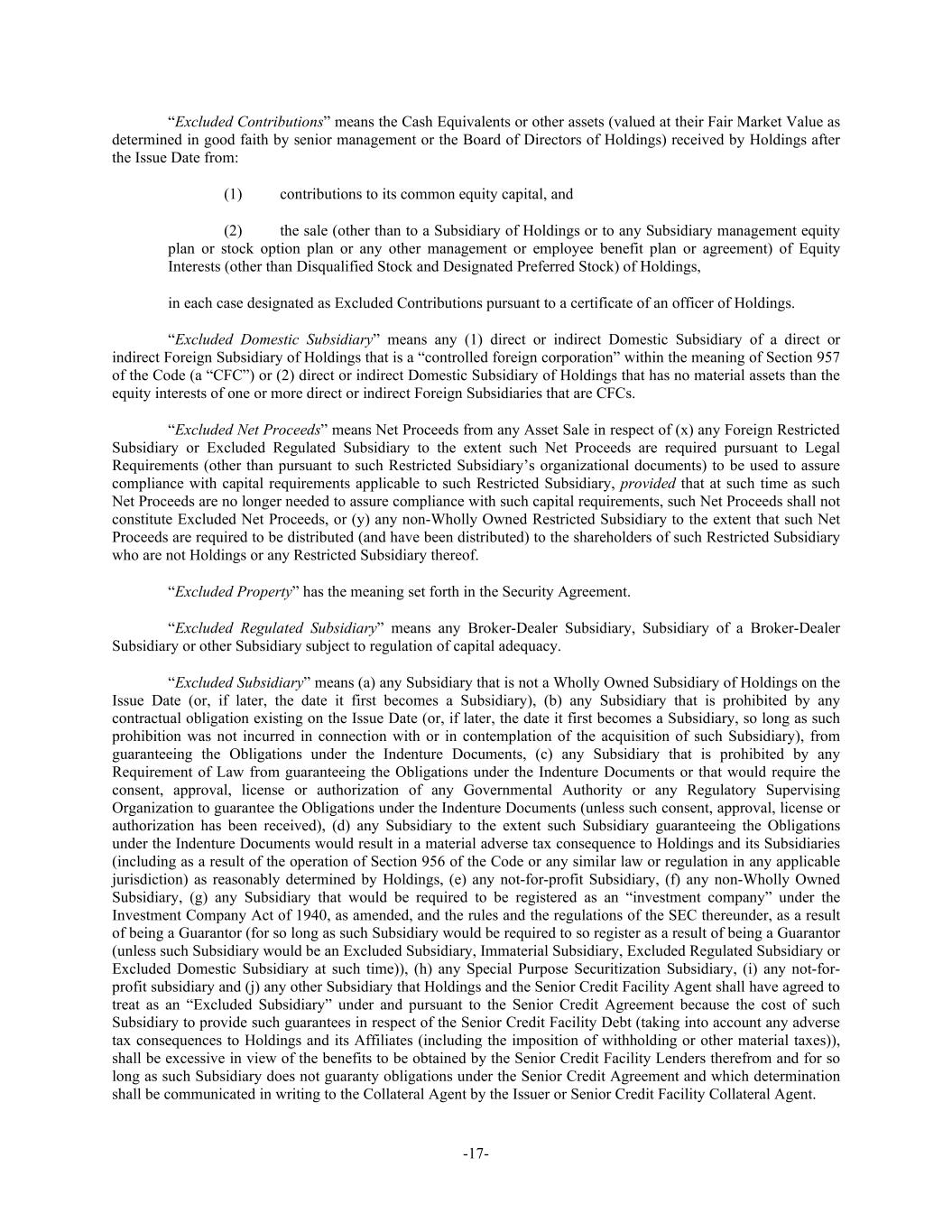 31 (A)(ii) above) prohibits such a pledge without the consent of any other party; provided, that this clause (B) shall not apply if (1) such other party is a Holdings or any Restricted Subsidiary or (2) consent has been obtained to consummate such pledge (it being understood that the foregoing shall not be deemed to obligate the Borrower or any Subsidiary to obtain any such consent) and shall only apply for so long as such organizational documents, joint venture agreement or shareholder agreement or replacement or renewal thereof is in effect, or (C) a pledge thereof to secure the Secured Obligations would give any other party (other than a Loan Party or a Wholly Owned Subsidiary) to any organizational documents, joint venture agreement or shareholder agreement governing such Equity Interests (or other contractual obligation referred to in subclause (A)(ii) above) the right to terminate its obligations thereunder (other than, in the case of other contractual obligations referred to in subclause (A)(ii), customary non-assignment provisions which are ineffective under the Uniform Commercial Code or other applicable Requirement of Law); and (f) any Equity Interests of any Unrestricted Subsidiary or any Special Purpose Securitization Subsidiary. “Excluded Subsidiary” means (a) any Subsidiary that is not a Wholly Owned Subsidiary of Holdings on the Closing Date (or, if later, the date it first becomes a Subsidiary), (b) any Subsidiary that is prohibited by any contractual obligation existing on the Closing Date (or, if later, the date it first becomes a Subsidiary, so long as such prohibition was not incurred in connection with or in contemplation of the acquisition of such Subsidiary), from guaranteeing the Secured Obligations, (c) any Subsidiary that is prohibited by any Requirement of Law from guaranteeing the Secured Obligations or that would require the consent, approval, license or authorization of any Governmental Authority or any Regulatory Supervising Organization to guarantee the Secured Obligations (unless such consent, approval, license or authorization has been received), (d) any Subsidiary to the extent such Subsidiary guaranteeing the Secured Obligations would result in a material adverse tax consequence to the Borrower and its Subsidiaries (including as a result of the operation of Section 956 of the Code or any similar law or regulation in any applicable jurisdiction) as reasonably determined by the Borrower with the consent of the Administrative Agent (such consent not to be unreasonably withheld or delayed), (e) and any Subsidiary that would be required to be registered as an “investment company” under the Investment Company Act of 1940, as amended, and the rules and the regulations of the SEC thereunder, as a result of being a Guarantor (for so long as such Subsidiary would be required to so register as a result of being a Guarantor), (f) any other Subsidiary excused from becoming a Loan Party pursuant to the last paragraph of the definition of the term “Collateral and Guarantee Requirement”, (g) any Special Purpose Securitization Subsidiary, and (h) any not-for-profit subsidiary. “Excluded Taxes” means, with respect to the Administrative Agent, any Lender, any Issuing Bank or any other recipient of any payment to be made by or on account of any obligation of any Loan Party hereunder or under any other Loan Document, (a) Taxes imposed on (or measured by) its net income (however denominated) and franchise Taxes imposed on it (in lieu of net income Taxes), in each case, imposed as a result of (i) such recipient being organized under the laws of, or having its principal office located in or, in the case of any Lender, having its applicable lending office located in, the jurisdiction imposing such Tax, or (ii) a present or former connection between such recipient and the jurisdiction imposing such Tax (other than a connection arising from such recipient having executed, delivered, or become a party to, performed its obligations or received payments under, received or perfected a security interest under, sold or assigned an interest in, engaged in any other transaction pursuant to, or enforced, any Loan Documents), (b) any branch profits Tax imposed by the United States of America or any similar Tax imposed by any other jurisdiction described in clause (a) above, (c) in the case of a Lender, any withholding Tax that is attributable to such Lender’s failure to comply with Section 2.15(e), (d) except in the case of an assignee or lending office pursuant to a request by the Borrower under Section 2.17, any U.S. federal withholding Taxes imposed due to a Requirement of Law in effect at the time a Lender becomes a party hereto (or designates a new lending office), except to the extent that such Lender (or its assignor, if any) was entitled, at the time of designation of a new lending office (or assignment), to receive additional