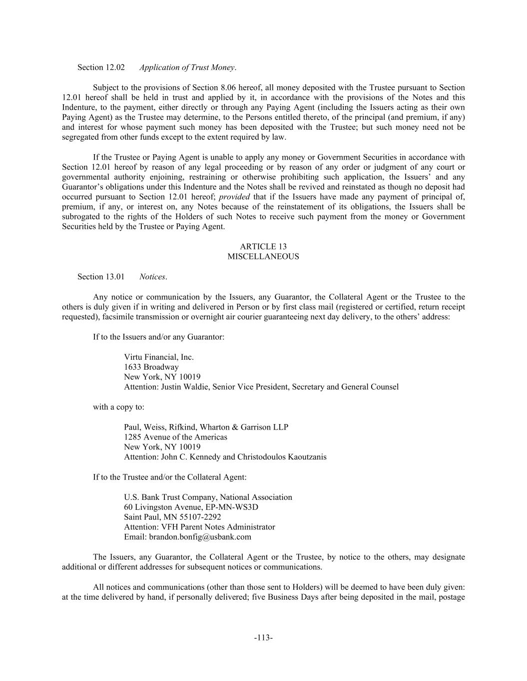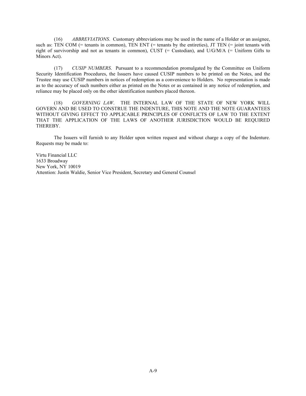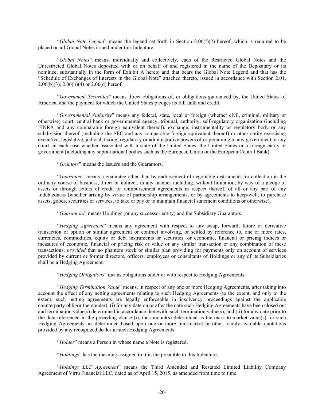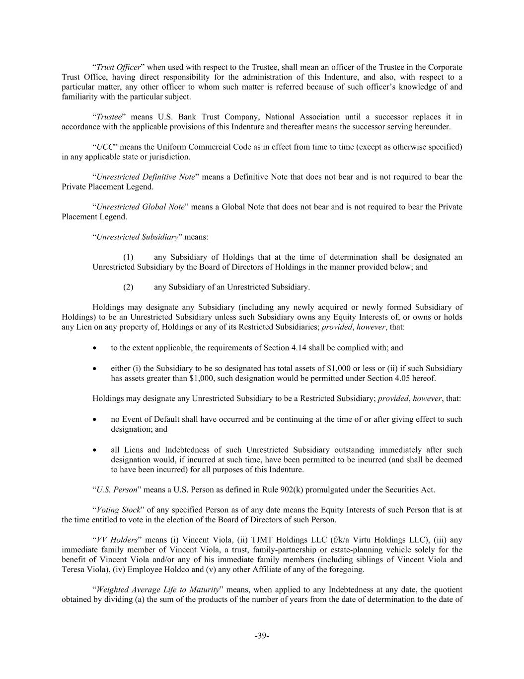 64 “Unadjusted Benchmark Replacement” means the applicable Benchmark Replacement excluding the related Benchmark Replacement Adjustment. “Unaudited Financial Statements” means the unaudited consolidated balance sheet of Holdings for the fiscal quarters ended March 31, 2021, June 30, 2021 and September 30, 2021 and the related consolidated statements of income, changes in equity and cash flows of Holdings, including the notes thereto. “United States Tax Compliance Certificate” has the meaning assigned to such term in Section 2.15(e)(ii)(C). “Unrestricted Subsidiary” means (a) any of (i) RFQ-hub Holdings LLC, a Delaware limited liability company, (ii) RFQ-hub Europe BV, a private company with limited liability organized under the laws of the Netherlands, (iii) RFQ-hub International Limited, a limited company organized under the laws of Ireland, (iv) RFQ-hub Americas LLC, a Delaware limited liability company, (v) RFQ- hub Asia-Pacific Private Limited, a private limited company organized under the laws of Singapore and (vi) RFQ-hub Software Solutions (France) SAS (formerly known as Virtu ITG Software Solutions (France) SAS), a simplified stock company organized under the laws of France, each of which is designated as an “Unrestricted Subsidiary” on the First Amendment Effective Date and (b) any other Subsidiary (other than an Intermediate Parent or the Borrower) designated by the Borrower as an Unrestricted Subsidiary pursuant to Section 5.13 subsequent to the ClosingFirst Amendment Effective Date. “Unsecured Leverage Test” has the meaning assigned to such term in the definition of “Incremental Cap.” “U.S. Government Securities Business Day” means any day except for (i) a Saturday, (ii) a Sunday or (iii) a day on which the Securities Industry and Financial Markets Association recommends that the fixed income departments of its members be closed for the entire day for purposes of trading in United States government securities. “U.S. Special Resolution Regimes” has the meaning assigned to such term in Section 9.21. “USA Patriot Act” means the Uniting and Strengthening America by Providing Appropriate Tools Required to Intercept and Obstruct Terrorism Act of 2001, as amended from time to time. “VFI” means Virtu Financial, Inc., a Delaware corporation. “Voting Stock” of any specified Person as of any date means the Equity Interests of such Person that is at the time entitled to vote in an election of the Board of Directors of Holdings or such Person. “VV Holders” means (i) Vincent Viola, (ii) TJMT Holdings LLC (f/k/a Virtu Holdings LLC), (iii) any immediate family member of Vincent Viola, a trust, family-partnership or estate-planning vehicle solely for the benefit of Vincent Viola and/or any of his immediate family members (including siblings of Vincent Viola and Teresa Viola), (iv) Virtu Employee Holdco LLC and (v) any other Affiliate of any of the foregoing. “Weighted Average Life to Maturity” means, when applied to any Indebtedness at any date, the number of years obtained by dividing: (a) the sum of the products obtained by multiplying (i) the amount of each then remaining installment, sinking fund, serial maturity or other required payments of principal, including payment at final maturity, in respect thereof, by (ii) the number of years (calculated to the nearest