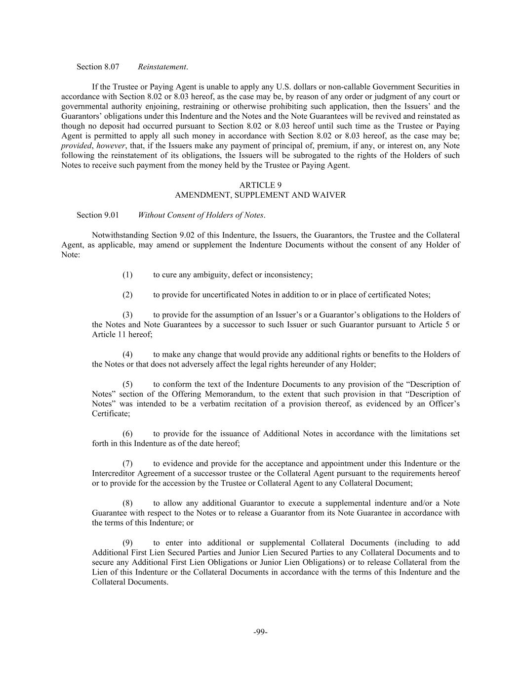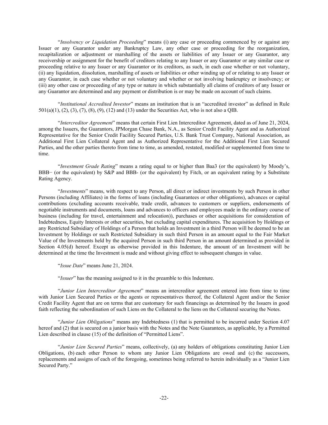 126 (xviii) Indebtedness incurred by the Borrower or any of the Restricted Subsidiaries in respect of letters of credit, bank guarantees, bankers’ acceptances or similar instruments issued or created in the ordinary course of business, including in respect of workers compensation claims, health, disability or other employee benefits or property, casualty or liability insurance or self-insurance or other reimbursement-type obligations regarding workers compensation claims; (xix) obligations in respect of performance, bid, appeal and surety bonds and performance and completion guarantees and similar obligations provided by Holdings or any of its Restricted Subsidiaries or obligations in respect of letters of credit, bank guarantees or similar instruments related thereto, in each case in the ordinary course of business or consistent with past practice; (xx) Permitted Unsecured Refinancing Debt, and any Permitted Refinancing thereof; (xxi) Permitted First Priority Refinancing Debt and Permitted Junior Lien Refinancing Debt, and any Permitted Refinancing thereof; (xxii) (A) Indebtedness of the Borrower in respect of one or more series of loans, bonds, notes or debentures that will be unsecured or secured by Liens on the Collateral on a pari passu or junior basis with the Liens on the Collateral securing the Initial Term B-1 Loans and that are issued or made in lieu of Incremental Facilities; provided that at the time of the incurrence thereof and after giving Pro Forma Effect thereto and to the use of the proceeds thereof, the aggregate principal amount incurred shall not exceed the Incremental Cap (the “Incremental Equivalent Debt”); provided, further, that (i) such Incremental Equivalent Debt is not scheduled to mature prior to the Latest Maturity Date then in effect and such Incremental Equivalent Debt shall not have a Weighted Average Life to Maturity shorter than the Weighted Average Life to Maturity of the Term Loans then in effect; provided, that that this clause (i) shall not apply to Indebtedness incurred in the form of Customary Bridge Loans (provided that any loans, notes securities or other debt which are exchanged for or otherwise replace such Customary Bridge Loans, if any, shall be subject to the requirements of this clause (i)) and/or Indebtedness in an aggregate principal amount outstanding that is not in excess of the then remaining capacity under the Inside Maturity Basket, (ii) such Incremental Equivalent Debt shall not have any mandatory prepayment provisions (other than provisions related to customary asset sale and change of control offers) that would result in prepayments of such Incremental Equivalent Debt prior to the Term Loans then outstanding; provided, however, that if such Indebtedness is secured by Liens on the Collateral on a pari passu basis with any Class of Term Loans, such Indebtedness may have mandatory prepayment provisions that provide for pro rata or less than pro rata (but not greater than pro rata) prepayments with such Class of Term Loans, (iii) [reserved], (iv) at the time when such Incremental Equivalent Debt is issued, the aggregate principal amount issued may not exceed the Incremental Cap, (v) (1) such Incremental Equivalent Debt shall not be Guaranteed by any Person other than a Loan Party, (2) the obligations in respect thereof shall not be secured by any Lien on any asset other than any asset constituting Collateral, (3) the security agreements relating to such Incremental Equivalent Debt shall be substantially the same as the Security Documents (with any material differences being reasonably satisfactory to the Administrative Agent), and (4) if such Incremental Equivalent Debt is secured, such Incremental Equivalent Debt and the trustee, administrative agent or other representative under the agreement governing such Incremental Equivalent Debt shall be subject to the First Lien Intercreditor Agreement or the Junior Lien Intercreditor Agreement, as applicable; provided that if such Incremental Equivalent Debt is issued pursuant to an agreement that has not previously been made subject thereto, then Holdings, the Borrower, the Subsidiary Loan Parties, the Administrative Agent and the Senior Representative for such Incremental Equivalent Debt shall have executed and delivered an appropriate supplement or joinder to the First Lien Intercreditor Agreement or the Junior Lien Intercreditor Agreement, as applicable, and (vi) such Indebtedness shall not have any mandatory prepayment provisions (other