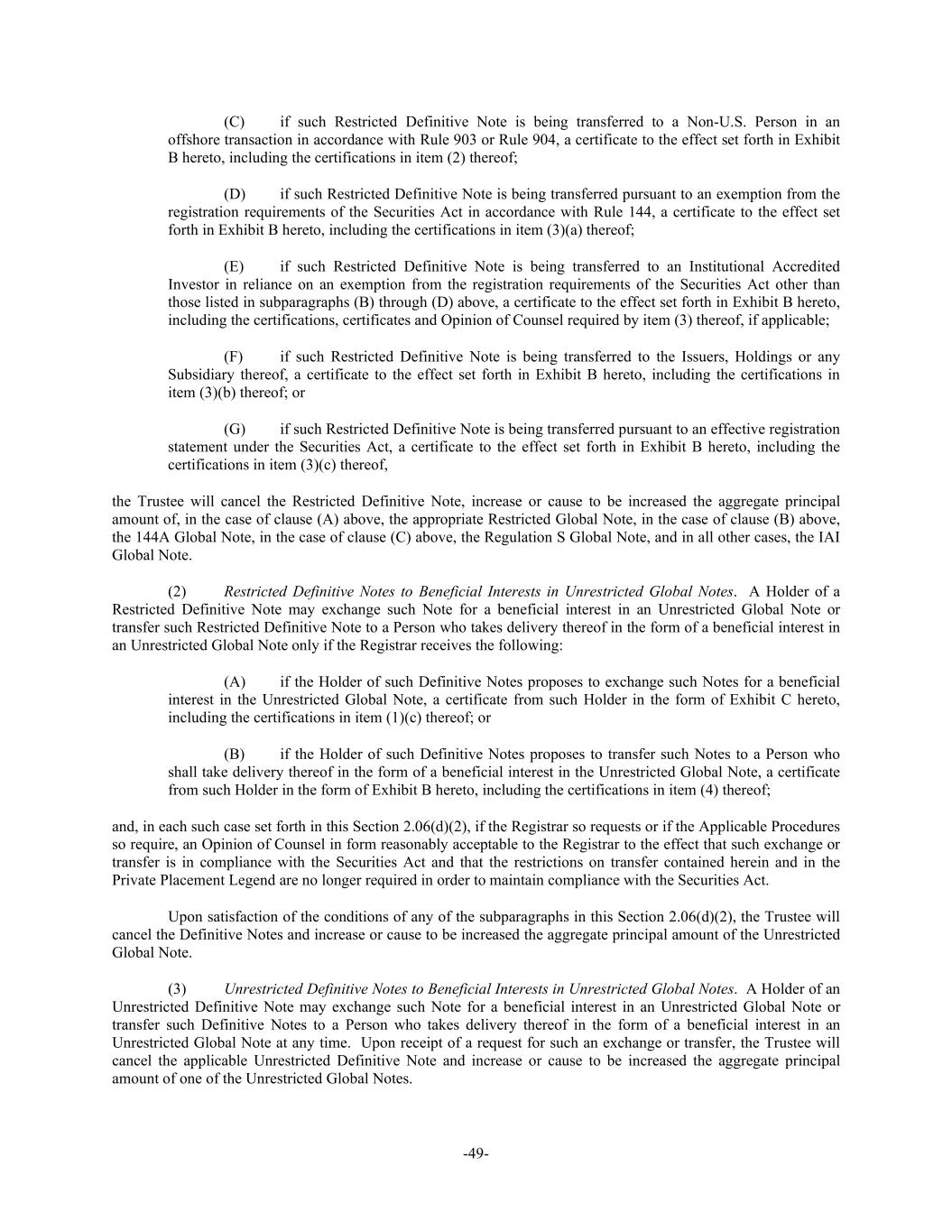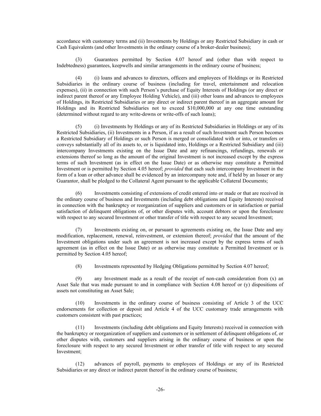 135 (c) Investments (i) by Holdings, the Borrower or any Restricted Subsidiary in any Loan Party (excluding any new Restricted Subsidiary that becomes a Loan Party pursuant to such Investment), (ii) by any Restricted Subsidiary that is not a Loan Party in any other Restricted Subsidiary that is also not a Loan Party, (iii) by Holdings or any Restricted Subsidiary (A) in any Restricted Subsidiary, provided that at the time such Investment is made in a Restricted Subsidiary that is not a Loan Party, the aggregate outstanding amount of such Investments made by Loan Parties in Restricted Subsidiaries that are not Loan Parties in reliance on this clause (iii)(A), together with the aggregate outstanding amount of Investments made pursuant to Section 6.04(m) (including any such Investments deemed to have been made pursuant to Section 9.14), in each case, after the ClosingFirst Amendment Effective Date, shall not exceed the Non-Loan Party Investment Amount at such time, (B) in any Regulated Subsidiary in the form of short-term intercompany advances and Indebtedness, in each case made in the ordinary course of business to provide for working capital and other operational requirements of such Regulated Subsidiary, (C) in any Restricted Subsidiary that is not a Loan Party, constituting an exchange of Equity Interests of such Restricted Subsidiary for Indebtedness of such Subsidiary, (D) constituting Guarantees of Indebtedness or other monetary obligations of Restricted Subsidiaries that are not Loan Parties owing to any Loan Party or (E) constituting unsecured Guarantees of Trading Debt to the extent such Guarantees are permitted under Section 6.01(a)(iii), (iv) by Holdings, any Intermediate Parent, the Borrower or any Restricted Subsidiary in Restricted Subsidiaries that are not Loan Parties so long as such Investment is part of a series of simultaneous transactions that result in the proceeds of the initial transaction being invested in one or more Loan Parties or, if the proceeds were initially held by a non-Loan Party, in a Restricted Subsidiary that is not a Loan Party and (v) by Holdings, the Borrower or any Restricted Subsidiary in any Restricted Subsidiary that is not a Loan Party, consisting of the contribution of Equity Interests of any other Restricted Subsidiary that is not a Loan Party so long as the Equity Interests of the transferee Restricted Subsidiary is pledged to secure the Secured Obligations; (d) Investments consisting of extensions of trade credit in the ordinary course of business; (e) Investments (i) existing or contemplated on the ClosingFirst Amendment Effective Date and set forth on Schedule 6.04(e) and any modification, replacement, renewal, reinvestment or extension thereof and (ii) existing on the ClosingFirst Amendment Effective Date by Holdings, the Borrower or any Restricted Subsidiary in the Borrower or any Restricted Subsidiary and any modification, renewal or extension thereof; provided that in each case the amount of the original Investment is not increased except by the terms of such Investment to the extent as set forth on Schedule 6.04(e) or as otherwise permitted by this Section 6.04; (f) Investments in Swap Agreements permitted under Section 6.07; (g) promissory notes and other non-cash consideration received in connection with Dispositions permitted by Section 6.05; (h) Permitted Acquisitions; (i) Investments in the ordinary course of business consisting of Uniform Commercial Code Article 3 endorsements for collection or deposit and Uniform Commercial Code Article 4 customary trade arrangements with customers consistent with past practices; (j) Investments (including debt obligations and Equity Interests) received in connection with the bankruptcy or reorganization of suppliers and customers or in settlement of delinquent obligations of, or other disputes with, customers and suppliers or upon the foreclosure with respect to any secured Investment or other transfer of title with respect to any secured Investment;