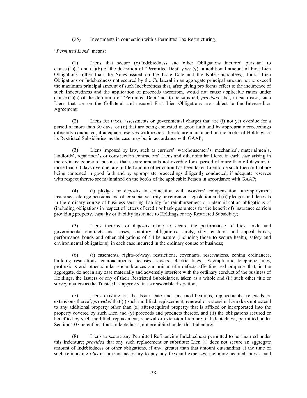 48 (d) Liens incurred or deposits made to secure the performance of bids, trade contracts, governmental contracts and leases, statutory obligations, surety, stay, customs and appeal bonds, performance bonds and other obligations of a like nature (including those to secure health, safety and environmental obligations), in each case incurred in the ordinary course of business; (e) easements, rights-of-way, restrictions, encroachments, protrusions and other similar encumbrances and other title defects affecting real property that, in the aggregate, do not in any case materially interfere with the ordinary conduct of the business of Holdings and its Restricted Subsidiaries, taken as a whole, and zoning codes and other land use restrictions under applicable law; (f) Liens securing, or otherwise arising from, judgments not constituting an Event of Default under Section 7.01(j); (g) Liens on goods the purchase price of which is financed by a commercial letter of credit issued for the account of Holdings or any of its Restricted Subsidiaries; provided that such Lien secures only the obligations of Holdings or such Restricted Subsidiaries in respect of such letter of credit to the extent such obligations are permitted by Section 6.01; and (h) Liens arising from precautionary Uniform Commercial Code financing statements or similar filings made in respect of operating leases entered into by Holdings or any of its Restricted Subsidiaries; provided that the term “Permitted Encumbrances” shall not include any Lien securing Indebtedness other than Liens referred to in clause (c) above securing obligations under letters of credit or bank guarantees and in clause (g) above. “Permitted First Priority Refinancing Debt” means any secured Indebtedness incurred by the Borrower in the form of one or more series of senior secured notes; provided that (i) such Indebtedness is secured by the Collateral on a pari passu basis (but without regard to the control of remedies) with the Loan Document Obligations and is not secured by any property or assets of Holdings, any Intermediate Parent, the Borrower or any Subsidiary other than the Collateral, (ii) such Indebtedness constitutes Credit Agreement Refinancing Indebtedness, (iii) such Indebtedness does not mature or have scheduled amortization or payments of principal and is not subject to mandatory redemption, repurchase, prepayment or sinking fund obligation (except customary asset sale or change of control provisions), in each case prior to the date that is 91 days after the Latest Maturity Date at the time such Indebtedness is incurred, (iv) the security agreements relating to such Indebtedness are substantially the same as the Security Documents (with such material differences as are reasonably satisfactory to the Administrative Agent), (v) such Indebtedness is not at any time guaranteed by any Subsidiaries other than the Subsidiary Loan Parties and (vi) a Senior Representative acting on behalf of the holders of such Indebtedness shall have become party to the First Lien Intercreditor Agreement; provided that if such Indebtedness is the initial Permitted First Priority Refinancing Debt incurred by the Borrower, then the Loan Parties, the Administrative Agent and the Senior Representative for such Indebtedness shall have executed and delivered the First Lien Intercreditor Agreement. Permitted First Priority Refinancing Debt will include any Registered Equivalent Notes issued in exchange therefor. “Permitted Holders” means (i) the VV Holders, (ii) North Island Holdings I, LP and any Affiliate thereof, (iii) Aranda Investments Pte. Ltd. and any Affiliate thereof, (iv) any group (within the meaning of Section 13(d)(3) or Section 14(d)(2) of the Exchange Act or any successor provision) the members of which include any of the foregoing, so long as no Person or other ‘‘group’’ (other than Permitted Holders specified in clauses (i) through (iii) above) beneficially owns more than 50% on a fully diluted basis of the voting power held by such Permitted Holder group and (v) VFI and its Subsidiaries, so long as no ‘‘person’’ or ‘‘group’’ (as each such term is used in Section 13(d) of the Exchange Act)) other than one or more Permitted Holders specified in clauses (i) through (iv) above is or becomes the Beneficial Owner, directly or