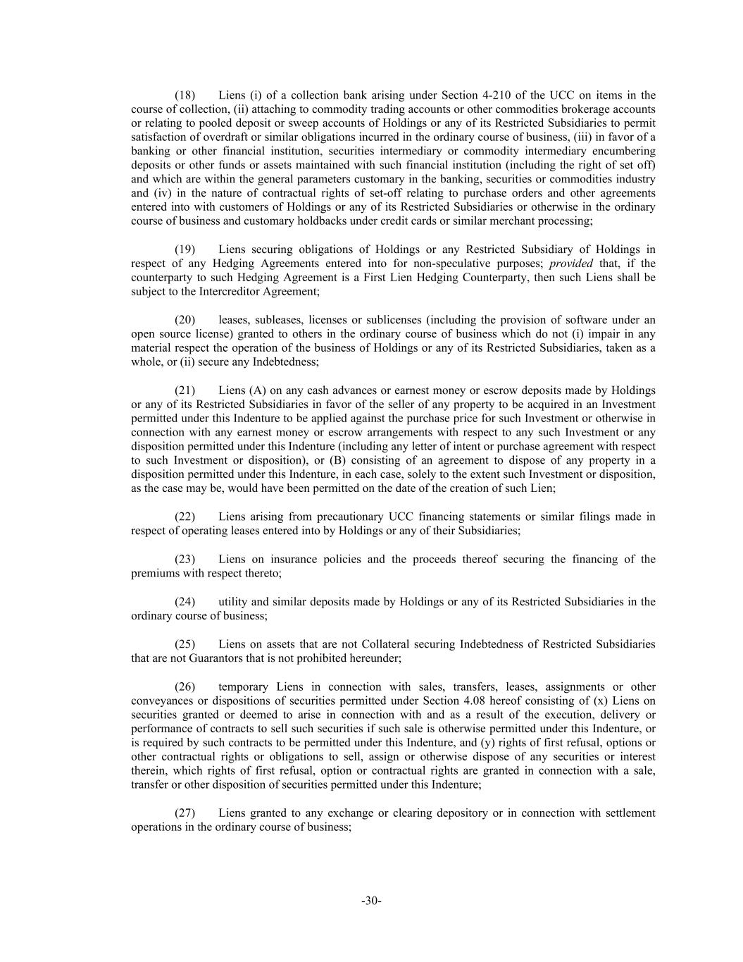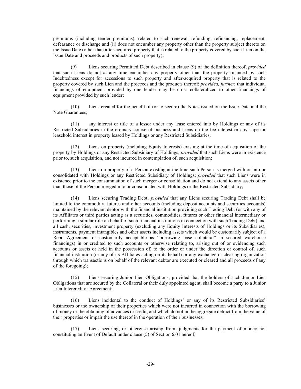 131 (xviii) Liens on insurance policies and the proceeds thereof securing the financing of the premiums with respect thereto; (xix) Liens on the Collateral securing Permitted First Priority Refinancing Debt, Permitted Junior Lien Refinancing Debt and, to the extent permitted to be secured pursuant to and subject to the requirements thereof, Indebtedness incurred under Sections 6.01(a)(viii), 6.01(a)(ix), 6.01(a)(x) and 6.01(a)(xxii); (xx) Liens securing Trading Debt; provided that any Liens securing Trading Debt shall be limited to the commodity, futures and other accounts (including deposit accounts and securities accounts) maintained by the relevant debtor with the financial institution providing such Trading Debt (or with any of its Affiliates or third parties acting as a securities, commodities, futures or other financial intermediary or performing a similar role on behalf of such financial institutions in connection with such Trading Debt) and all cash, securities, investment property (excluding any Equity Interests of the Borrower or its Subsidiaries), instruments, payment intangibles and other assets, including assets which would be customarily subject of a Repo Agreement or customarily acceptable as “borrowing base collateral” in secured warehouse financings, in or credited to such accounts or otherwise relating to, arising out of or evidencing such accounts or assets or held in the possession of, to the order or under the direction or control of, such financial institution (or any of its Affiliates acting on its behalf) or any exchange or clearing organization through which transactions on behalf of the relevant debtor are executed or cleared and all proceeds of any of the foregoing); (xxi) other Liens; provided that at the time of the granting of and after giving Pro Forma Effect to any such Lien and the obligations secured thereby (including the use of proceeds thereof) the aggregate face amount of obligations secured by Liens existing in reliance on this clause (xxi) shall not exceed the greater of $400,000,000 and 40% of Consolidated EBITDA calculated on a Pro Forma Basis for the most recently ended Test Period for which financial statements are available; and (xxii) Liens securing Indebtedness permitted under Section 6.01(xxiv) and (xxv); provided that the assets or property securing such Liens do not include any assets or property of any Loan Party or Regulated Subsidiary. For purposes of determining compliance with this Section 6.02, (A) a Lien securing an item of Indebtedness (or portion thereof) need not be permitted solely by reference to one category of permitted Liens (or any portion thereof) described in Sections 6.02(i) through (xxii) but may be permitted in part under any combination thereof and (B) in the event that a Lien securing an item of Indebtedness (or any portion thereof) meets the criteria of one or more of the categories of permitted Liens (or any portion thereof) described in Sections 6.02(i) through (xxii), (I) the Borrower may, in its sole discretion, divide, classify or reclassify, or later divide, classify or reclassify (as if incurred at such later time), such Lien securing such item of Indebtedness (or any portion thereof) in any manner that complies with this Section 6.02 and at the time of incurrence, division, classification or reclassification will be entitled to only include the amount and type of such Lien or such item of Indebtedness secured by such Lien (or any portion thereof) in one of the above clauses (or any portion thereof) and such Lien securing such item of Indebtedness (or any portion thereof) will be treated as being incurred or existing pursuant to only such clause or clauses (or any portion thereof) without giving pro forma effect to such item (or any portion thereof) when calculating the amount of Liens or Indebtedness (or any portion thereof) that may be incurred, divided, classified or reclassified pursuant to any other clause (or any portion thereof) at such time and (II) if such Lien could be incurred as of any time in reliance of any financial test (including the Net Total Leverage Ratio, the Net Secured Leverage Ratio, the Net First Lien Leverage Ratio, the Fixed Charge Coverage Ratio, the Financial Performance Covenant and/or Consolidated EBITDA) based on the most recently delivered financial statements pursuant to Section 5.01(a) and/or (b), such Lien shall be automatically reclassified (with retroactive effect) as having