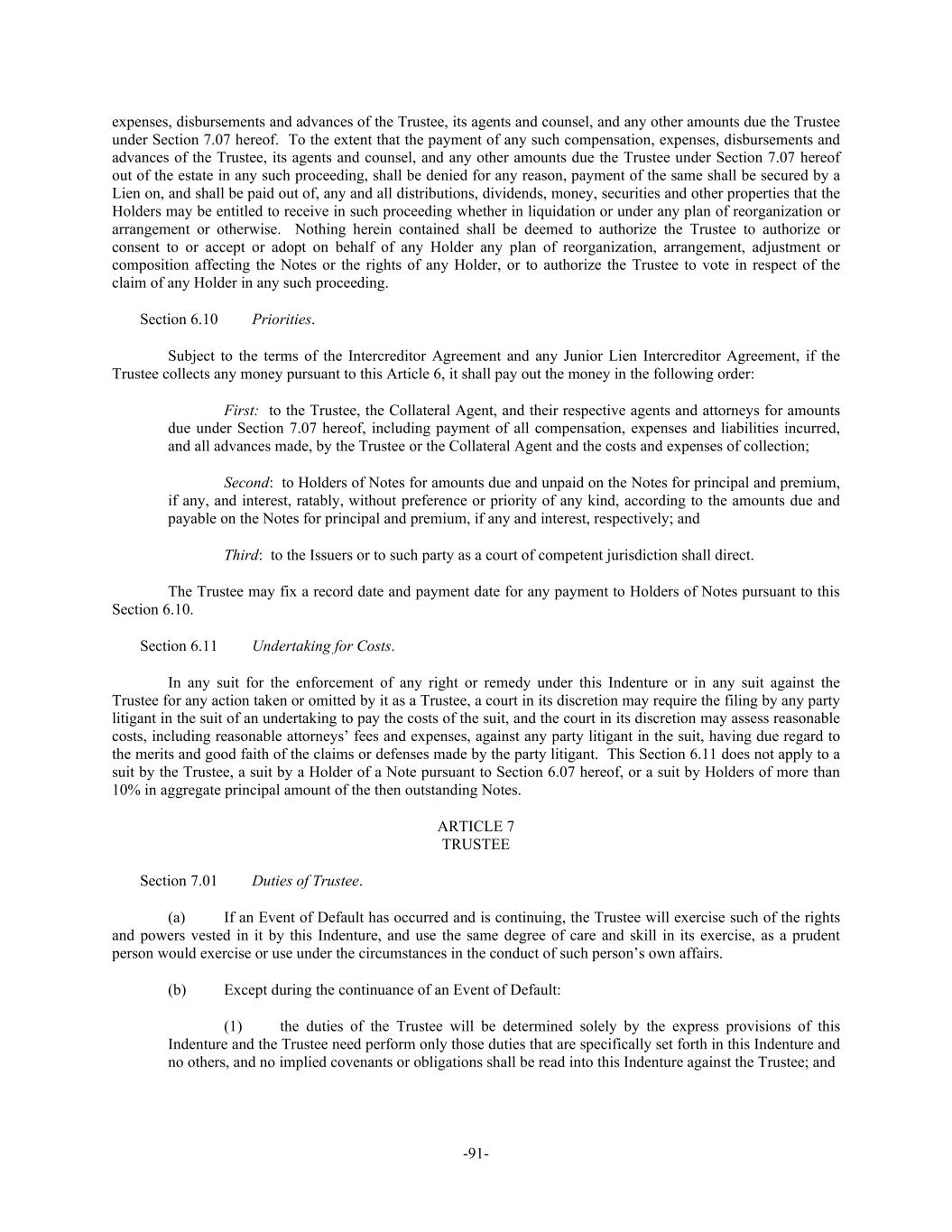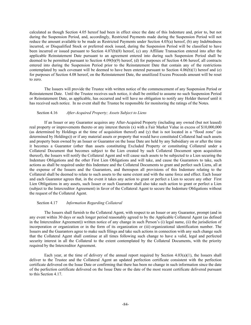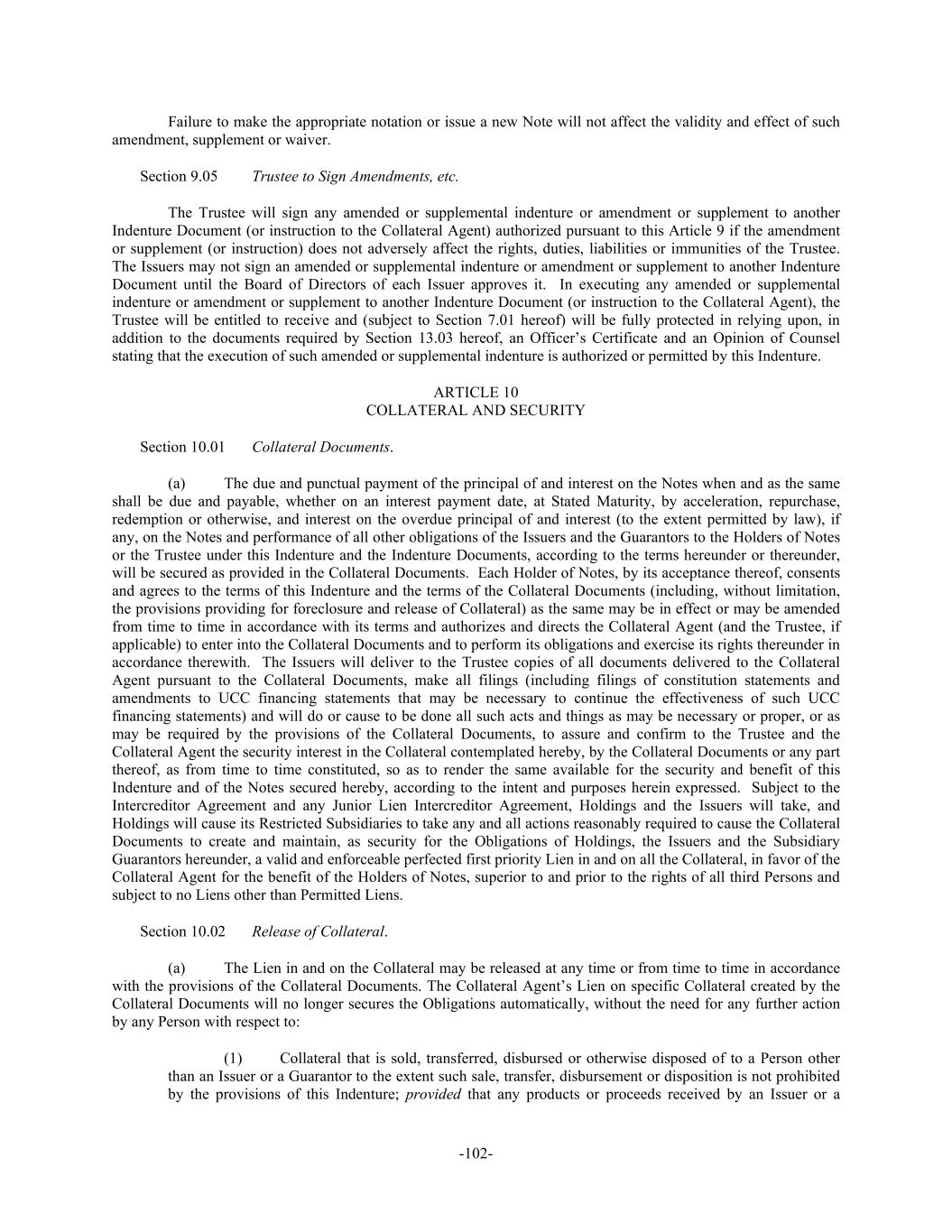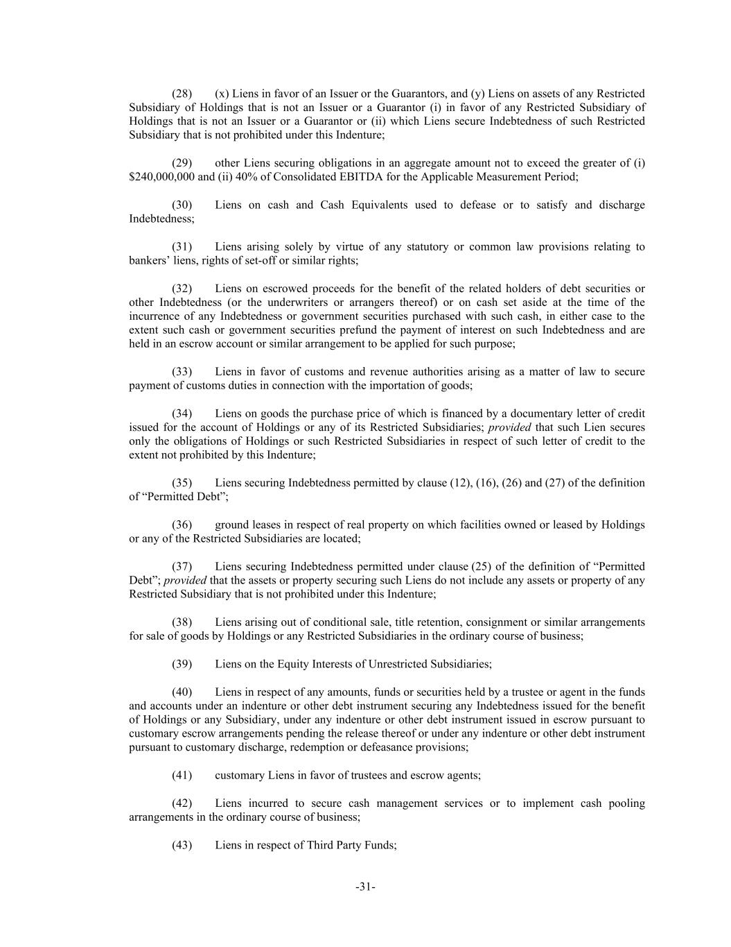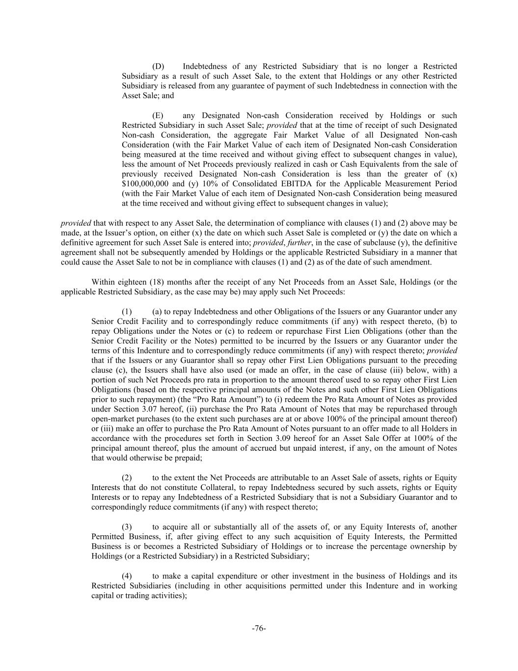 129 This Agreement will not treat (1) unsecured Indebtedness as subordinated or junior to secured Indebtedness merely because it is unsecured or (2) senior Indebtedness as subordinated or junior to any other senior Indebtedness merely because it has a junior priority with respect to the same collateral. Section 6.02. Liens. Neither Holdings nor the Borrower will, nor will they permit any Restricted Subsidiary to, create, incur, assume or permit to exist any Lien on any property or asset now owned or hereafter acquired by it, except: (i) Liens created under the Loan Documents; (ii) Permitted Encumbrances; (iii) Liens existing on the ClosingFirst Amendment Effective Date and set forth on Schedule 6.02 and any modifications, replacements, renewals or extensions thereof; provided that (A) such modified, replacement, renewal or extension Lien does not extend to any additional property other than (x) after-acquired property that is affixed or incorporated into the property covered by such Lien and (y) proceeds and products thereof, and (B) the obligations secured or benefited by such modified, replacement, renewal or extension Lien are, if Indebtedness, permitted by Section 6.01 or, if not Indebtedness, not prohibited hereunder; (iv) Liens securing Indebtedness permitted under Section 6.01(a)(v); provided that (A) such Liens attach concurrently with or within 365 days after the acquisition, repair, replacement, construction or improvement (as applicable) of the property subject to such Liens, (B) such Liens do not at any time encumber any property other than the property financed by such Indebtedness except for accessions to such property and the proceeds and the products thereof and (C) with respect to Capital Lease Obligations, such Liens do not at any time extend to or cover any assets (except for accessions to or proceeds of such assets) other than the assets subject to such Capital Lease Obligations; provided, further, that individual financings of equipment provided by one lender may be cross collateralized to other financings of equipment provided by such lender; (v) leases, licenses, subleases or sublicenses granted to others that do not (A) interfere in any material respect with the business of Holdings and its Restricted Subsidiaries, taken as a whole, or (B) secure any Indebtedness; (vi) Liens in favor of customs and revenue authorities arising as a matter of law to secure payment of customs duties in connection with the importation of goods; (vii) Liens (A) of a collection bank arising under Section 4-210 of the Uniform Commercial Code on items in the course of collection and (B) in favor of a banking institution arising as a matter of law encumbering deposits (including the right of setoff) and that are within the general parameters customary in the banking industry; (viii) Liens (A) on cash advances or escrow deposits in favor of the seller of any property to be acquired in an Investment permitted pursuant to Section 6.04 to be applied against the purchase price for such Investment or otherwise in connection with any escrow arrangements with respect to any such Investment or any Disposition permitted under Section 6.05 (including any letter of intent or purchase agreement with respect to such Investment or Disposition), or (B) consisting of an agreement to dispose of any property in a Disposition permitted under Section 6.05, in each case, solely to the extent such Investment or Disposition, as the case may be, would have been permitted on the date of the creation of such Lien;