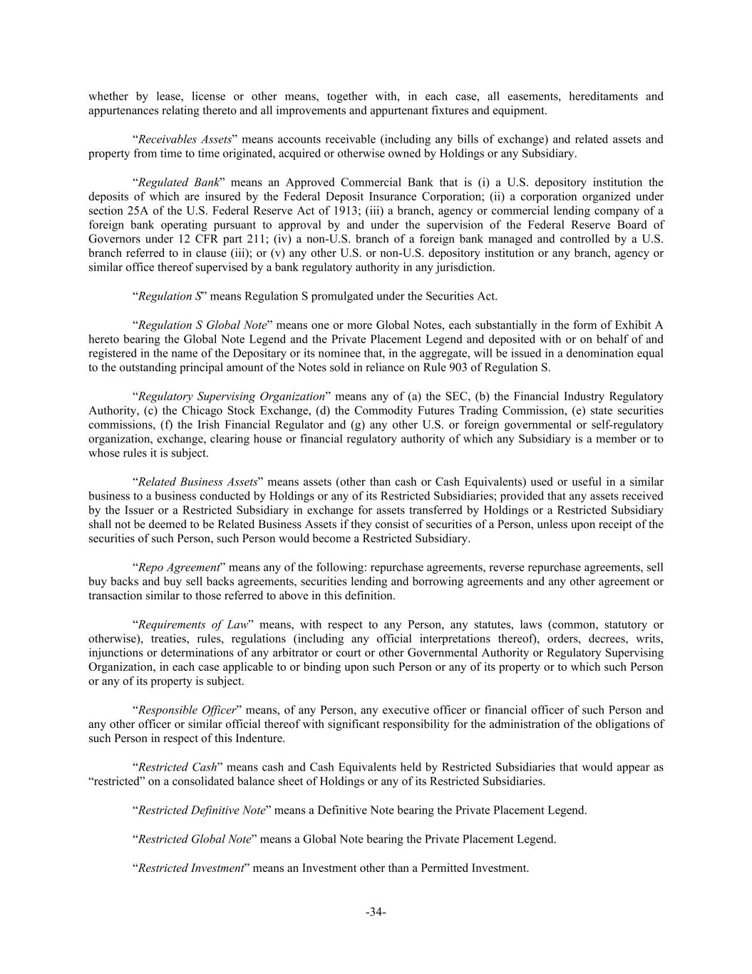 55 the same Guarantees) issued in a dollar-for-dollar exchange therefor pursuant to an exchange offer registered with the SEC. “Regulated Bank” means an Approved Commercial Bank that is (i) a U.S. depository institution the deposits of which are insured by the Federal Deposit Insurance Corporation; (ii) a corporation organized under section 25A of the U.S. Federal Reserve Act of 1913; (iii) a branch, agency or commercial lending company of a foreign bank operating pursuant to approval by and under the supervision of the Federal Reserve Board of the under 12 CFR part 211; (iv) a non-U.S. branch of a foreign bank managed and controlled by a U.S. branch referred to in clause (iii); or (v) any other U.S. or non-U.S. depository institution or any branch, agency or similar office thereof supervised by a bank regulatory authority in any jurisdiction. “Regulated Subsidiary” means any Broker-Dealer Subsidiary, any subsidiary of a Broker-Dealer Subsidiary or other Subsidiary subject to regulation of capital adequacy. “Regulatory Supervising Organization” means any of (a) the SEC, (b) the Financial Industry Regulatory Authority, (c) the Chicago Stock Exchange, (d) the Commodity Futures Trading Commission, (e) state securities commissions, (f) the Irish Financial Regulator and (g) any other U.S. or foreign governmental or self-regulatory organization, exchange, clearing house or financial regulatory authority of which any Subsidiary is a member or to whose rules it is subject. “Reimbursement Obligation” means the obligation of the Borrower to reimburse the Issuing Banks pursuant to Section 2.22(d) for amounts drawn under Letters of Credit. “Related Parties” means, with respect to any specified Person, such Person’s Affiliates and the partners, directors, officers, employees, trustees, agents, controlling persons, advisors and other representatives of such Person and of each of such Person’s Affiliates and permitted successors and assigns. “Release” means any release, spill, emission, leaking, dumping, injection, pouring, deposit, disposal, discharge, dispersal, leaching or migration into or through the environment (including ambient air, surface water, groundwater, land surface or subsurface strata) and including the environment within any building, or any occupied structure, facility or fixture. “Released Subsidiary” has the meaning assigned to such term in Section 9.14(b). “Relevant Governmental Body” means the Federal Reserve Board and/or the NYFRB, the CME Term SOFR Administrator, as applicable, or a committee officially endorsed or convened by the Federal Reserve Board and/or the NYFRB or, in each case, any successor thereto. “Repo Agreement” means any of the following: repurchase agreements, reverse repurchase agreements, sell buy backs and buy sell backs agreements, securities lending and borrowing agreements and any other agreement or transaction similar to those referred to above in this definition. “Repricing Transaction” means the prepayment or refinancing of all or a portion of the Initial Term B-1 Loans with the incurrence by any Loan Party of any Indebtedness in the form of long term bank debt financing in the form of term loans denominated in United States dollars that are broadly syndicated to banks and other institutional investors incurred for the primary purpose of repaying, refinancing, substituting or replacing the Initial Term B-1 Loans and having an effective All-In Yield (as determined by the Administrative Agent consistent with generally accepted financial practice) that is less than the All- In Yield (as determined by the Administrative Agent on the same basis) of the Initial Term B-1 Loans (other than, for the avoidance of doubt, securitizations), including without limitation, as may be effected through any amendment to this Agreement relating to the All-In Yield of such Initial Term B-1 Loans,