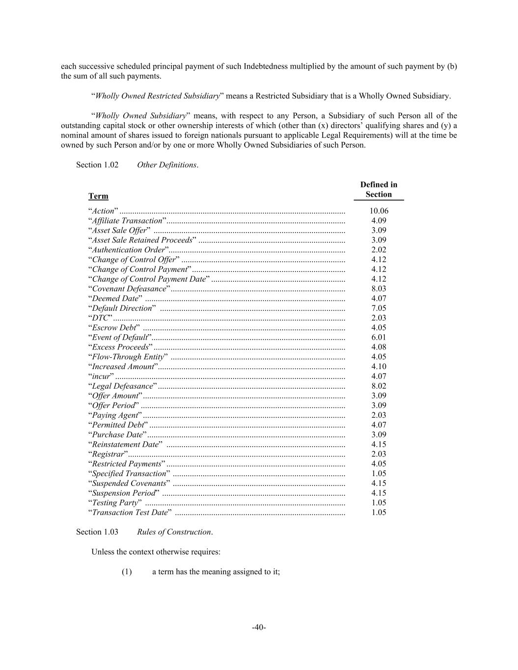 65 one-twelfth) that will elapse between such date and the making of such payment; by (b) the then outstanding principal amount of such Indebtedness. “Wholly Owned Restricted Subsidiary” means any Restricted Subsidiary that is a Wholly Owned Subsidiary of Holdings. “Wholly Owned Subsidiary” means, with respect to any Person at any date, a subsidiary of such Person of which securities or other ownership interests representing 100% of the Equity Interests (other than (a) directors’ qualifying shares and (b) nominal shares issued to foreign nationals to the extent required by applicable Requirements of Law) are, as of such date, owned, controlled or held by such Person or one or more Wholly Owned Subsidiaries of such Person or by such Person and one or more Wholly Owned Subsidiaries of such Person. “Withdrawal Liability” means liability to a Multiemployer Plan as a result of a complete or partial withdrawal from such Multiemployer Plan, as such terms are defined in Part I of Subtitle E of Title IV of ERISA. “Write-Down and Conversion Powers” means, (a) with respect to any EEA Resolution Authority, the write-down and conversion powers of such EEA Resolution Authority from time to time under the Bail-In Legislation for the applicable EEA Member Country, which write-down and conversion powers are described in the EU Bail-In Legislation Schedule, and (b) with respect to the United Kingdom, any powers of the applicable Resolution Authority under the Bail-In Legislation to cancel, reduce, modify or change the form of a liability of any UK Financial Institution or any contract or instrument under which that liability arises, to convert all or part of that liability into shares, securities or obligations of that person or any other person, to provide that any such contract or instrument is to have effect as if a right had been exercised under it or to suspend any obligation in respect of that liability or any of the powers under that Bail-In Legislation that are related to or ancillary to any of those powers. Section 1.02. Classification of Loans and Borrowings. For purposes of this Agreement, Loans and Borrowings may be classified and referred to by Class (e.g., a “Term Loan” or “Revolving Loan”) or by Type (e.g., a “Term Benchmark Loan”) or by Class and Type (e.g., a “Term Benchmark Term Loan” or “ABR Revolving Loan”). Borrowings also may be classified and referred to by Class (e.g., a “Term Borrowing” or “Revolving Borrowing”) or by Type (e.g., a “Term Benchmark Borrowing”) or by Class and Type (e.g., a “Term Benchmark Term Borrowing” or “ABR Revolving Borrowing”). Section 1.03. Terms Generally. The definitions of terms herein shall apply equally to the singular and plural forms of the terms defined. Whenever the context may require, any pronoun shall include the corresponding masculine, feminine and neuter forms. The words “include,” “includes” and “including” shall be deemed to be followed by the phrase “without limitation.” The word “will” shall be construed to have the same meaning and effect as the word “shall.” Unless the context requires otherwise, (a) any definition of or reference to any agreement (including this Agreement and the other Loan Documents), instrument or other document herein shall be construed as referring to such agreement, instrument or other document as from time to time amended, amended and restated, supplemented or otherwise modified (subject to any restrictions on such amendments, supplements or modifications set forth herein), (b) any reference herein to any Person shall be construed to include such Person’s successors and assigns (subject to any restrictions on assignment set forth herein) and, in the case of any Governmental Authority or Regulatory Supervising Organization, any other Governmental Authority or Regulatory Supervising Organization that shall have succeeded to any or all functions thereof, (c) the words “herein,” “hereof” and “hereunder,” and words of similar import, shall be construed to refer to this Agreement in its entirety and not to any particular provision hereof, (d) all references herein to Articles, Sections, Exhibits and Schedules shall be construed to refer to Articles and Sections of, and Exhibits and Schedules to, this