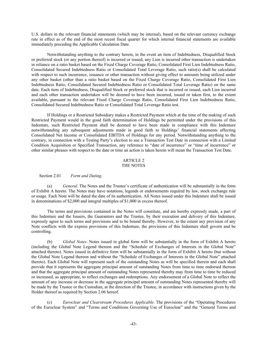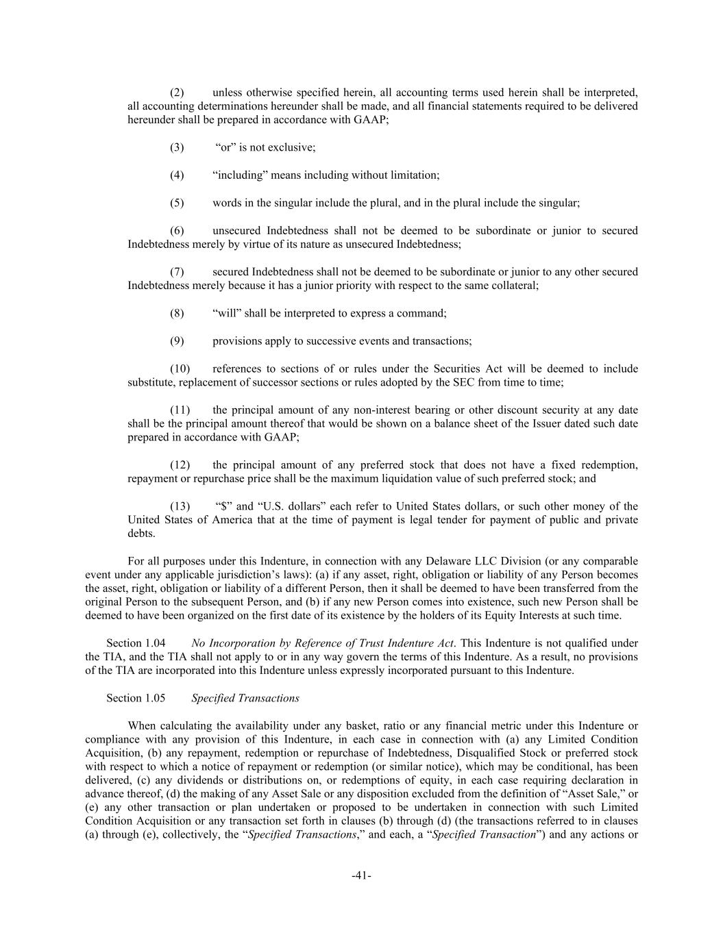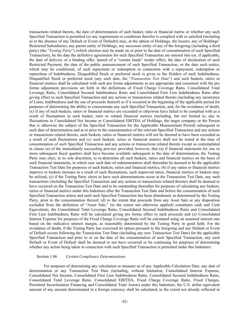 66 Agreement, (e) any reference to any law, rule or regulation herein shall, unless otherwise specified, refer to such law, rule or regulation as amended, modified or supplemented from time to time and (f) the words “asset” and “property” shall be construed to have the same meaning and effect and to refer to any and all tangible and intangible assets and properties, including cash, securities, accounts and contract rights. Section 1.04. Accounting Terms; GAAP. Except as otherwise expressly provided herein, all terms of an accounting or financial nature shall be construed in accordance with GAAP, as in effect from time to time; provided, however, that if the Borrower notifies the Administrative Agent that the Borrower requests an amendment to any provision (including any definitions) hereof to eliminate the effect of any change occurring after the Closing Date in GAAP or in the application thereof on the operation of such provision (or if the Administrative Agent notifies the Borrower that the Required Lenders request an amendment to any provision hereof for such purpose), regardless of whether any such notice is given before or after such change in GAAP or in the application thereof, then such provision shall be interpreted on the basis of GAAP as in effect and applied immediately before such change shall have become effective until such notice shall have been withdrawn or such provision amended in accordance herewith. Notwithstanding any other provision contained herein, all terms of an accounting or financial nature used herein shall be construed, and all computations of amounts and ratios referred to herein shall be made, without giving effect to (i) any election under Financial Accounting Standards Accounting Standards Codification No. 825, “Financial Instruments”, or any successor thereto (including pursuant to the Accounting Standards Codification), to value any Indebtedness of Holdings, the Borrower or any Subsidiary at “fair value”, as defined therein and (ii) any treatment of Indebtedness under Accounting Standards Codification 470-20 or 2015-03 (or any other Accounting Standards Codification or Financial Accounting Standard having a similar result or effect) to value any such Indebtedness in a reduced or bifurcated manner as described therein, and such Indebtedness shall at all times be valued at the full stated principal amount thereof. Section 1.05. Effectuation of Transactions. All references herein to Holdings, the Borrower and the other Subsidiaries shall be deemed to be references to such Persons, and all the representations and warranties of Holdings, the Borrower and the other Loan Parties contained in this Agreement and the other Loan Documents shall be deemed made, in each case, after giving effect to the Transactions to occur on the Closing Date, unless the context otherwise requires. Section 1.06. Currency Translation. Notwithstanding the foregoing, for purposes of any determination under Article 5, Article 6 (other than the Financial Performance Covenant) or Article 7 or any determination under any other provision of this Agreement expressly requiring the use of a currency exchange rate, all amounts incurred, outstanding or proposed to be incurred or outstanding in currencies other than dollars shall be translated into dollars at currency exchange rates in effect on the date of such determination; provided, however, that for purposes of determining compliance with Article 6 with respect to the amount of any Indebtedness, Investment, Disposition or Restricted Payment in a currency other than dollars, no Default or Event of Default shall be deemed to have occurred solely as a result of changes in rates of exchange occurring after the time such Indebtedness or Investment is incurred or Disposition or Restricted Payment made; provided, further, that if Indebtedness is incurred to refinance other Indebtedness denominated in a currency other than dollars (or in a different currency from the Indebtedness being refinanced), and such refinancing would cause the applicable dollar-denominated restriction to be exceeded if calculated at the relevant currency exchange rate in effect on the date of such refinancing, such dollar- denominated restriction shall be deemed not to have been exceeded so long as the principal amount of such refinancing Indebtedness does not exceed (i) the outstanding principal amount, as applicable, of such Indebtedness being refinanced plus (ii) the aggregate amount of unpaid accrued interest and premium thereon plus other amounts paid, and fees and expenses incurred, in connection with such refinancing; provided, further, that, for the avoidance of doubt, the foregoing provisions of this Section 1.06 shall otherwise apply to such Sections, including with respect to determining whether any Indebtedness or Investment may be incurred or Disposition or Restricted Payment made at any time under such Sections.