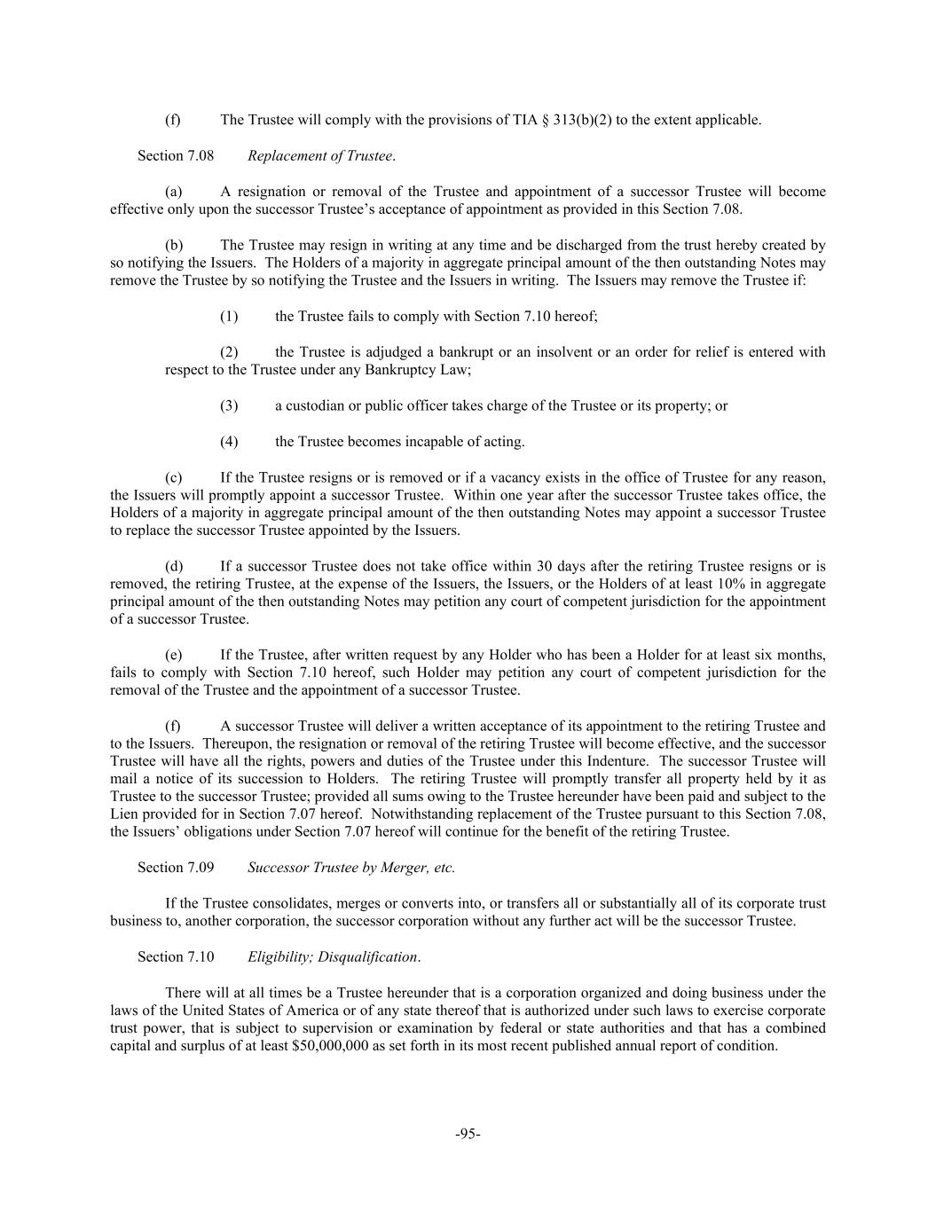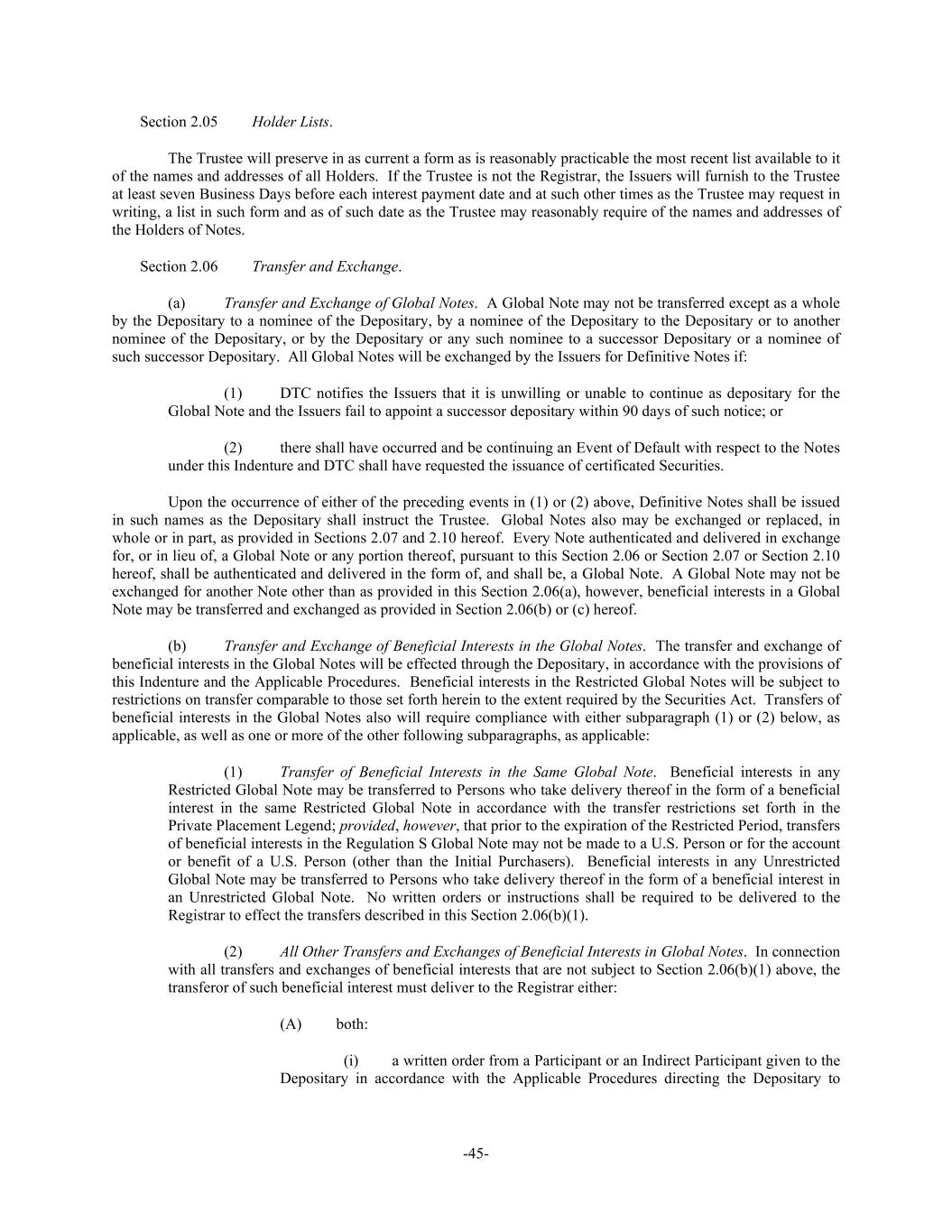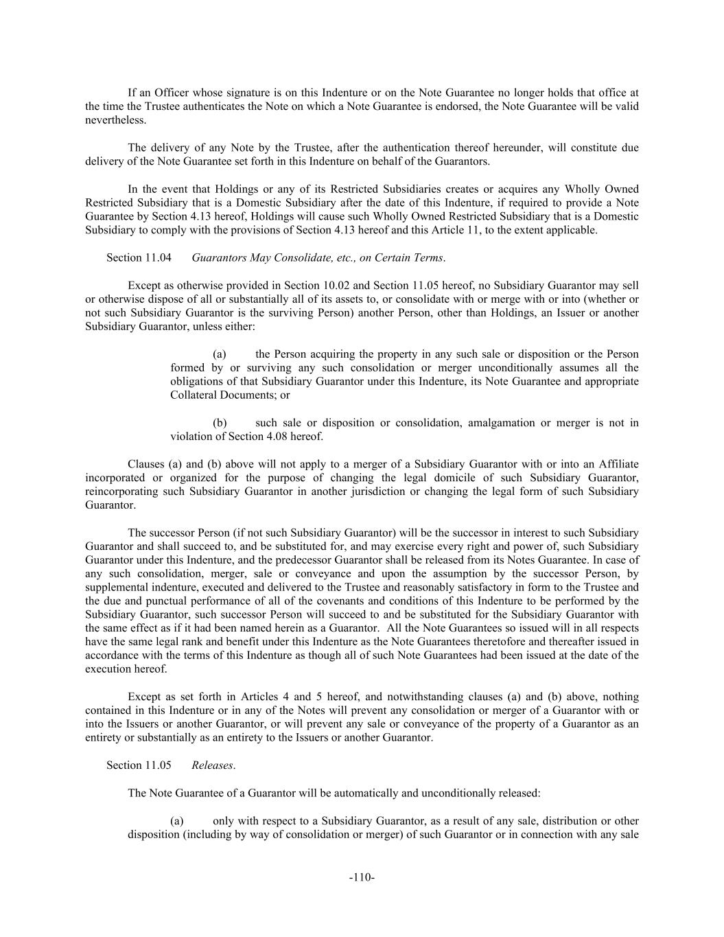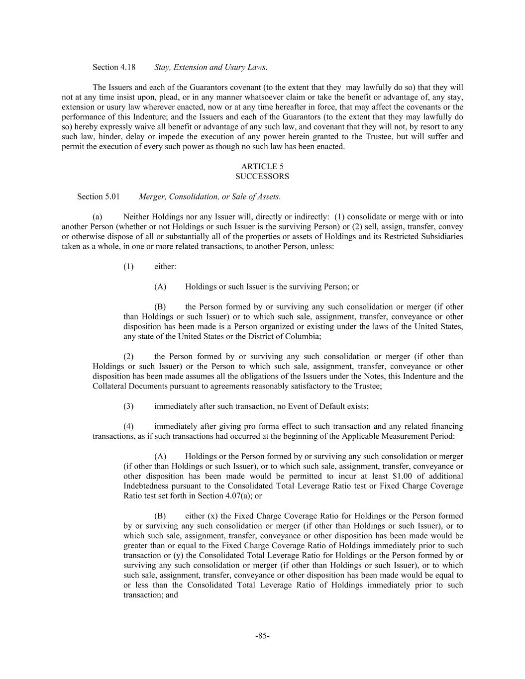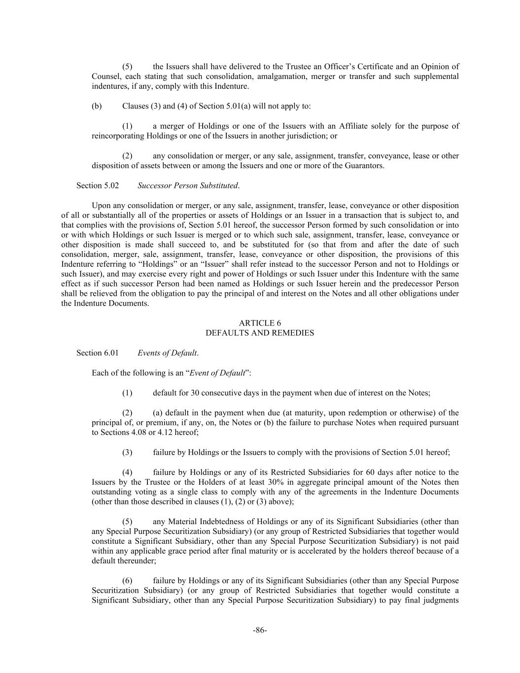 133 Borrower is a party pursuant to a supplement hereto or thereto in form and substance reasonably satisfactory to the Administrative Agent, (y) each Loan Party other than the Borrower, unless it is the other party to such merger or consolidation, shall have reaffirmed, pursuant to an agreement in form and substance reasonably satisfactory to the Administrative Agent, that its Guarantee of, and grant of any Liens as security for, the Secured Obligations shall apply to the Successor Borrower’s obligations under this Agreement and (z) the Borrower shall have delivered to the Administrative Agent a certificate of a Responsible Officer and an opinion of counsel, each stating that such merger or consolidation complies with this Agreement; provided, further, that (1) if such Person is not a Loan Party, no Default exists after giving effect to such merger or consolidation and (2) if the foregoing requirements are satisfied, the Successor Borrower will succeed to, and be substituted for, the Borrower under this Agreement and the other Loan Documents; provided, further, that the Borrower agrees to use commercially reasonable efforts to provide any documentation and other information about the Successor Borrower as shall have been reasonably requested in writing by any Lender through the Administrative Agent that such Lender shall have reasonably determined is required by regulatory authorities under applicable “know your customer” and anti-money laundering rules and regulations, including without limitation the USA Patriot Act; (v) Holdings may merge or consolidate with any other Person, so long as no Event of Default exists after giving effect to such merger or consolidation; provided that (A) Holdings shall be the continuing or surviving Person or (B) if the Person formed by or surviving any such merger or consolidation is not Holdings or is a Person into which Holdings has been liquidated (any such Person, the “Successor Holdings”), (w) the Successor Holdings shall expressly assume all the obligations of Holdings under this Agreement and the other Loan Documents to which Holdings is a party pursuant to a supplement hereto or thereto in form and substance reasonably satisfactory to the Administrative Agent, (x) each Loan Party other than Holdings, unless it is the other party to such merger or consolidation, shall have reaffirmed, pursuant to an agreement in form and substance reasonably satisfactory to the Administrative Agent, that its Guarantee of and grant of any Liens as security for the Secured Obligations shall apply to the Successor Holdings’ obligations under this Agreement, (y) the Successor Holdings shall, immediately following such merger or consolidation, directly or indirectly own all Subsidiaries owned by Holdings immediately prior to such merger and (z) Holdings shall have delivered to the Administrative Agent a certificate of a Responsible Officer and an opinion of counsel, each stating that such merger or consolidation complies with this Agreement; provided, further, that if the foregoing requirements are satisfied, the Successor Holdings will succeed to, and be substituted for, Holdings under this Agreement and the other Loan Documents; provided, further, that the Borrower agrees to use commercially reasonable efforts to provide any documentation and other information about the Successor Holdings as shall have been reasonably requested in writing by any Lender through the Administrative Agent that such Lender shall have reasonably determined is required by regulatory authorities under applicable “know your customer” and anti-money laundering rules and regulations, including without limitation the USA Patriot Act; (vi) any Restricted Subsidiary (other than the Borrower) may merge, consolidate or amalgamate with any other Person in order to effect an Investment permitted pursuant to Section 6.04; provided that the continuing or surviving Person shall be a Restricted Subsidiary, which together with each of its Restricted Subsidiaries, shall have complied with the requirements of Sections 5.11 and 5.12 and if the other party to such transaction is not a Loan Party, no Default exists after giving effect to such transaction; and (vii) any Restricted Subsidiary (other than the Borrower) may effect a merger, dissolution, liquidation, consolidation or amalgamation to effect a Disposition permitted pursuant to Section 6.05; provided that if the other party to such transaction is not a Loan Party, no Default exists after giving effect to the transaction.