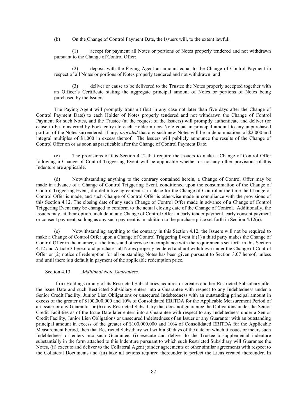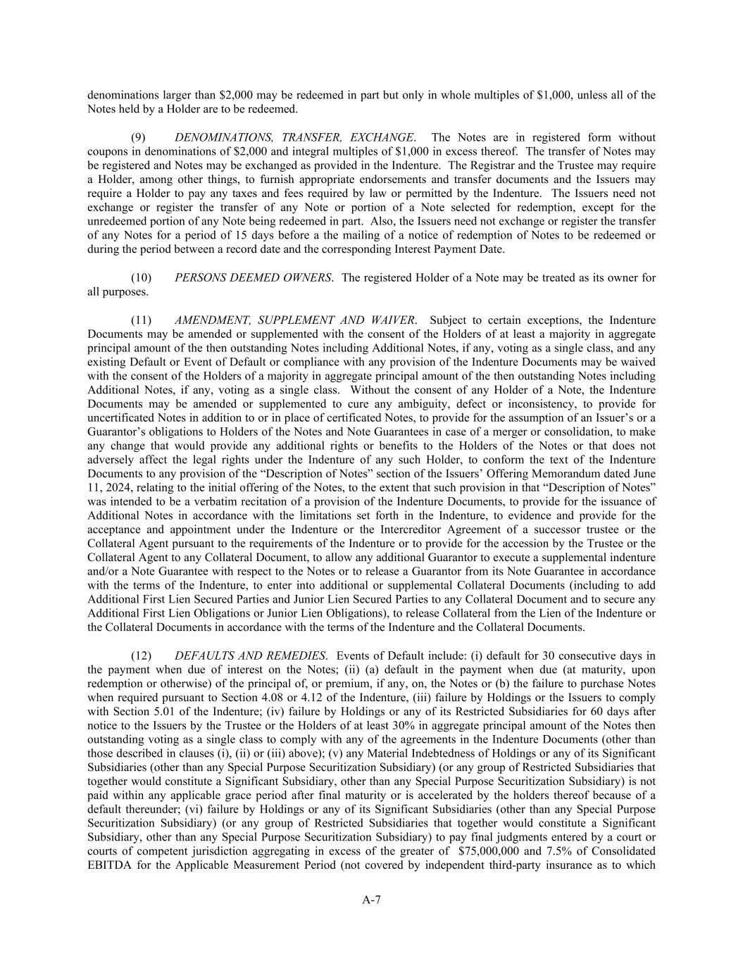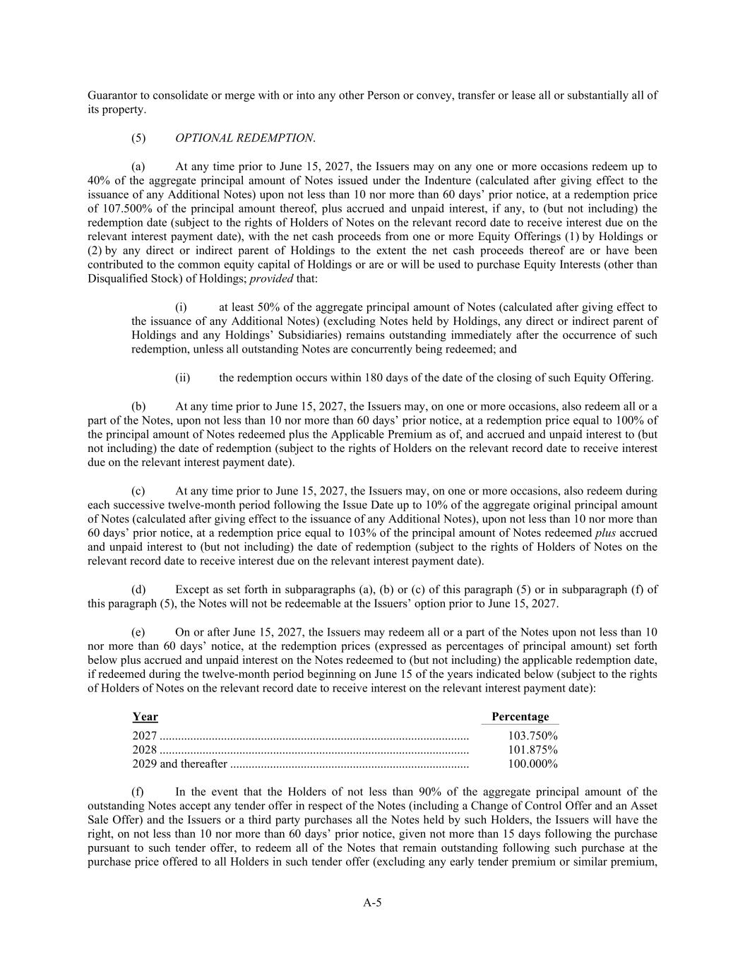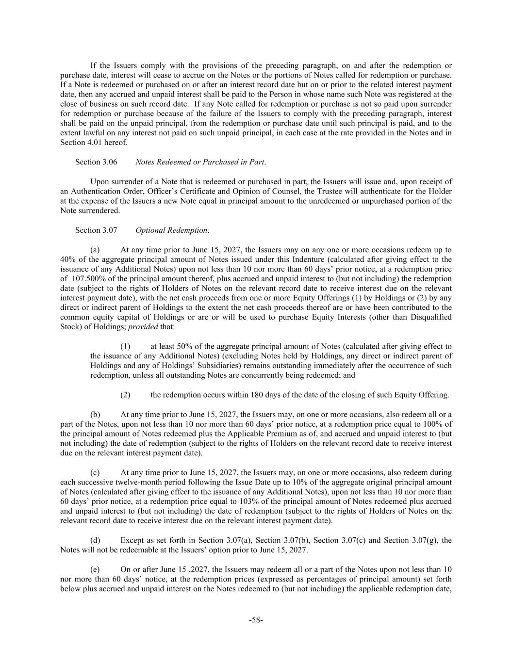 125 to 1.00% annually) that would result in prepayments of such Indebtedness prior to the Initial Term B- 1 Loans; provided, however, that if such Indebtedness is secured by Liens on the Collateral on a pari passu basis with the Initial Term B-1 Loans, such Indebtedness may have mandatory prepayment provisions that provide for pro rata or less than pro rata (but not greater than pro rata) prepayments with the Initial Term B-1 Loans and (5) such Indebtedness (other than existing Indebtedness that is assumed (and not incurred) not in contemplation of such Permitted Acquisition or Investment) shall not have a maturity date earlier than or a Weighted Average Life to Maturity shorter than those applicable to the Initial Term B-1 Loans; provided that this clause (5) shall not apply to Indebtedness incurred in the form of Customary Bridge Loans (provided that any loans, notes securities or other debt which are exchanged for or otherwise replace such Customary Bridge Loans, if any, shall be subject to the requirements of this clause (5)) and/or Indebtedness in an aggregate principal amount outstanding that is not in excess of the then remaining capacity under the Inside Maturity Basket, and (B) and any Permitted Refinancing thereof; (x) [reserved];the Secured Notes and any Permitted Refinancing thereof; provided that the Secured Notes, and any Permitted Refinancing thereof that is secured by Liens on the Collateral ranking pari passu with the Liens on the Collateral securing the Term B-1 Loans, in each case, are subject to the First Lien Intercreditor Agreement; (xi) Indebtedness representing deferred compensation to employees of Holdings and its Restricted Subsidiaries incurred in the ordinary course of business; (xii) Indebtedness consisting of unsecured promissory notes issued by any Loan Party to current or former officers, directors and employees, their permitted transferees, or their respective estates, executors, trustees, administrators, heirs, legatees or distributees to finance the purchase or redemption of Equity Interests of Holdings (or any direct or indirect parent thereof or any Employee Holding Vehicle) permitted by Section 6.08(a); (xiii) Indebtedness constituting indemnification obligations or obligations in respect of purchase price or other similar adjustments incurred in a Permitted Acquisition, any other Investment or any Disposition, in each case permitted under this Agreement; (xiv) Indebtedness consisting of obligations under deferred compensation or other similar arrangements incurred in connection with any Permitted Acquisition or other Investment permitted hereunder; (xv) Cash Management Obligations and other Indebtedness in respect of netting services, overdraft protections and similar arrangements, in each case, incurred in the ordinary course of business in connection with deposit accounts; (xvi) Indebtedness of Holdings, the Borrower and any of the Restricted Subsidiaries; provided that at the time of the incurrence thereof and after giving Pro Forma Effect thereto and the use of the proceeds thereof, the aggregate principal amount of Indebtedness outstanding in reliance on this clause (xvi) shall not exceed the greater of $400,000,000 and 40% of Consolidated EBITDA calculated on a Pro Forma Basis for the most recently ended Test Period for which financial statements are available; (xvii) Indebtedness consisting of (A) the financing of insurance premiums or (B) take-or- pay obligations contained in supply arrangements, in each case in the ordinary course of business;