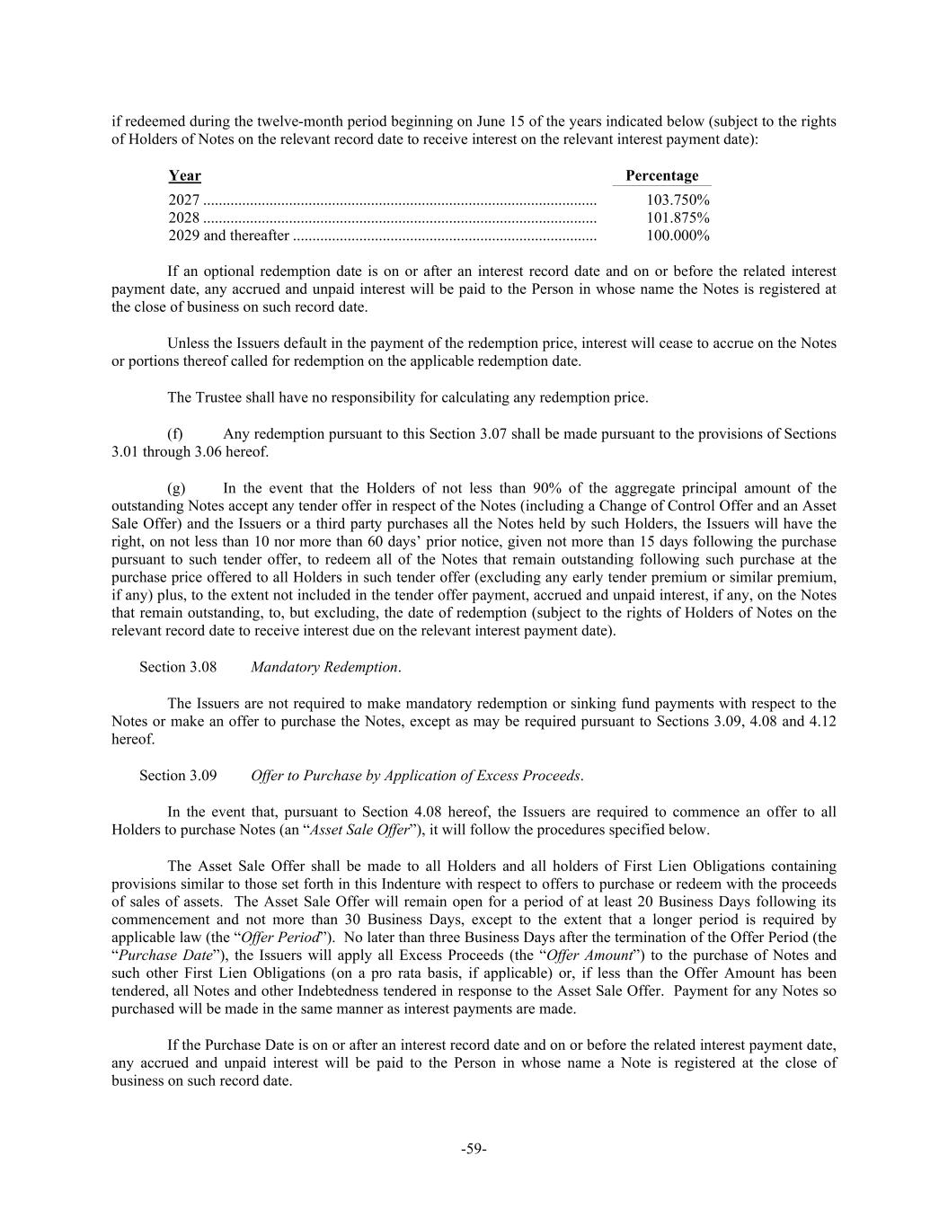 80 and rescind the applicable Specified Discount Prepayment Notice, Discount Range Prepayment Notice or Solicited Discounted Prepayment Notice therefor at its discretion at any time on or prior to the applicable Specified Discount Prepayment Response Date (and if such offer is revoked pursuant to the preceding clauses, any failure by the Borrower to make any prepayment to a Term Lender, as applicable, pursuant to this Section 2.09(a)(ii) shall not constitute a Default or Event of Default under Section 7.01 or otherwise). (b) In the event and on each occasion that any Net Proceeds are received by or on behalf of Holdings, any Intermediate Parent, the Borrower or any of its Restricted Subsidiaries (i) in respect of any Prepayment Event described in clause (b) of the definition of “Prepayment Event”, the Borrower shall, on the date of such Prepayment Event, prepay Initial Term B-1 Loans in an aggregate amount equal to 100% of the amount of such Net Proceeds, and (ii) in respect of any Prepayment Event described in clause (a) of the definition of “Prepayment Event”, the Borrower shall, within three Business Days after such Net Proceeds are received, prepay Initial Term B-1 Loans in an aggregate amount equal to the Asset Sale Percentage of such Net Proceeds; provided that, in the case of any event described in clause (a) of the definition of the term “Prepayment Event,” if the Borrower and its Restricted Subsidiaries invest (or commit with a Person that is not Holdings, an Intermediate Parent, the Borrower or a Subsidiary to invest) the Net Proceeds from such event (or a portion thereof) within 18 months after receipt of such Net Proceeds in the business of the Borrower and its Restricted Subsidiaries (including in any acquisitions permitted under Section 6.04 and in working capital or trading activities), then no prepayment shall be required pursuant to this paragraph (b) in respect of such Net Proceeds in respect of such event (or the applicable portion of such Net Proceeds, if applicable) except to the extent of any such Net Proceeds therefrom that have not been so invested (or committed to be invested) by the end of such 18-month period (or if committed to be so invested within such 18-month period, have not been so invested within 24 months after receipt thereof), at which time a prepayment shall be required in an amount equal to such Net Proceeds that have not been so invested (or committed to be invested). Notwithstanding the foregoing, the Borrower may use a portion of such Net Proceeds of a Prepayment Event described in clause (a) of the definition of “Prepayment Event” to prepay, redeem or repurchase any Other First Lien Debt (provided, that in the case of the prepayment of any revolving Indebtedness, there is a corresponding reduction in commitments), in each case in an amount not to exceed the product of (x) the amount of such Net Proceeds and (y) a fraction, (A) the numerator of which is the outstanding principal amount of such Other First Lien Debt and (B) the denominator of which is the sum of the outstanding principal amount of such Other First Lien Debt and the outstanding principal amount of all Classes of Initial Term B-1 Loans; it being understood and agreed that such portion shall, thereafter, no longer be required to be applied to prepay the Initial Term B-1 Loans. (c) Commencing with the fiscal quarter of Holdings ending June 30, 20232025, the Borrower shall apply an aggregate amount equal to (i) the ECF Percentage of Excess Cash Flow for the four fiscal quarter period ending on June 30 of each year (each an “Excess Cash Flow Period”), minus (ii) to the extent not financed using the proceeds of the incurrence of funded long term Indebtedness, the sum of (A) the aggregate amount of any voluntary prepayments, repurchases, redemption or retirements made during such Excess Cash Flow Period (plus, at the Borrower’s election, without duplication of any amounts previously deducted under this clause (i), the amount of any voluntary prepayment, repurchases, redemptions or retirements after the end of such Excess Cash Flow Period but before the date of prepayment under this clause (c) of (x) Initial Term B-1 Loans (it being understood that the amount of any voluntary prepayment, repurchase, redemption or retirement of Initial Term B-1 Loans below par shall be calculated to equal the amount of cash used and not the principal amount deemed prepaid therewith) and (y) Other First Lien Debt (provided, that (1) in the case of the prepayment of any revolving Indebtedness, there was a corresponding reduction in commitments and (2) the maximum amount of each such prepayment, repurchase, redemption or retirement of Other First Lien Debt that may be counted for purposes of this clause (A)(y) shall not exceed the amount that would have been prepaid, repurchased, redeemed or retired in respect of such Other First Lien Debt if such prepayment, repurchase, redemption or retirement had been