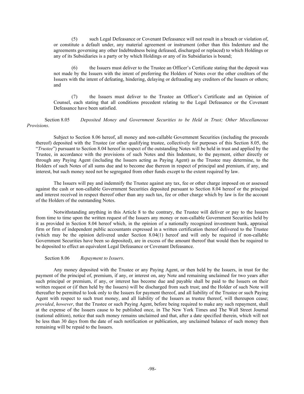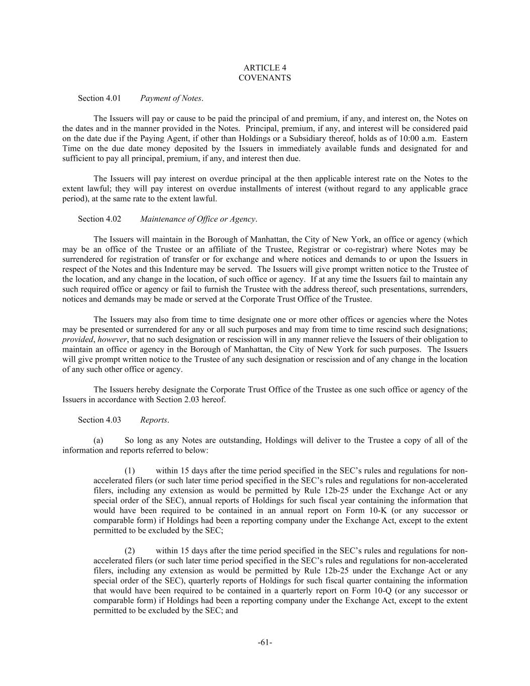 122 set forth on Schedule 5.16 by the times specified on such Schedule 5.16 with respect to such actions, or such later time as the Administrative Agent may agree in its reasonable discretion. All conditions precedent, covenants and representations and warranties contained in this Agreement and the other Loan Documents shall be deemed modified to the extent necessary to effect the foregoing (and to permit the taking of the actions described on Schedule 5.16 within the time periods required by this Section 5.16, rather than as elsewhere provided in the Loan Documents). ARTICLE 6 NEGATIVE COVENANTS Each of Holdings and the Borrower covenants and agrees with the Administrative Agent and each of the Lenders that, until the Termination Date: Section 6.01. Indebtedness; Certain Equity Securities. (a) Holdings and the Borrower will not, and will not permit any Restricted Subsidiary to, create, incur, assume or permit to exist any Indebtedness, except: (i) Indebtedness of Holdings, the Borrower and any of the Restricted Subsidiaries under the Loan Documents (including any Indebtedness incurred pursuant to Section 2.18 or 2.19); (ii) (A) Indebtedness outstanding on the ClosingFirst Amendment Effective Date (provided that any such Indebtedness that is (x) not intercompany Indebtedness and (y) in excess of $2,000,000 shall be listed on Schedule 6.01), (B) Indebtedness in respect of the Existing Yen Bonds, and (C) any Permitted Refinancing of any of the foregoing; (iii) Guarantees by Holdings, the Borrower and the Restricted Subsidiaries in respect of Indebtedness of the Borrower or any Restricted Subsidiary otherwise permitted hereunder; provided that such Guarantee is otherwise permitted by Section 6.04; provided, further, that (A) no Guarantee by any Restricted Subsidiary of any Junior Financing shall be permitted unless such Restricted Subsidiary shall have also provided a Guarantee of the Loan Document Obligations pursuant to the Guarantee Agreement, (B) if the Indebtedness being Guaranteed is subordinated to the Loan Document Obligations, such Guarantee shall be subordinated to the Guarantee of the Loan Document Obligations on terms at least as favorable to the Lenders as those contained in the subordination of such Indebtedness, (C) no Guarantee by a Regulated Subsidiary of any Trading Debt of a non-Regulated Subsidiary shall be permitted unless such non-Regulated Subsidiary is consolidated with such Regulated Subsidiary for regulatory capital purposes, (D) no Guarantee by a Domestic Subsidiary that is not a Regulated Subsidiary of any Trading Debt shall be permitted unless such Domestic Subsidiary is a Subsidiary Loan Party and (E) any such Guarantee of Trading Debt shall be unsecured; (iv) Indebtedness of the Borrower owing to any Restricted Subsidiary or of any Restricted Subsidiary owing to any other Restricted Subsidiary or the Borrower or Holdings to the extent permitted by Section 6.04; provided that all such Indebtedness of any Loan Party owing to any Restricted Subsidiary that is not a Loan Party shall be subordinated to the Loan Document Obligations (but only to the extent permitted by applicable law and not giving rise to adverse tax consequences) on terms (i) at least as favorable to the Lenders as those set forth in the form of intercompany note attached as Exhibit H or (ii) otherwise reasonably satisfactory to the Administrative Agent; (v) (A) Indebtedness (including Capital Lease Obligations) of the Borrower or any Restricted Subsidiaries financing the acquisition, construction, repair, replacement or improvement of fixed or capital assets, other than software; provided that such Indebtedness is incurred concurrently