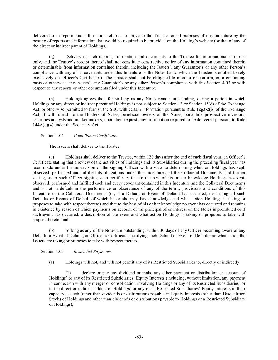 117 may have personnel who do not wish to receive material non-public information with respect to the Borrower or its Affiliates, or the respective securities of any of the foregoing, and who may be engaged in investment and other market-related activities with respect to such Persons’ securities. The Borrower hereby agrees that it will use commercially reasonable efforts to identify that portion of the Borrower Materials that may be distributed to the Public Lenders and that (w) all such Borrower Materials shall be clearly and conspicuously marked “PUBLIC” which, at a minimum, shall mean that the word “PUBLIC” shall appear prominently on the first page thereof; (x) by marking Borrower Materials “PUBLIC,” the Borrower shall be deemed to have authorized the Administrative Agent, the Lead Arrangers and the Lenders to treat such Borrower Materials as not containing any material non-public information (although it may be sensitive and proprietary) with respect to the Borrower or its securities for purposes of United States Federal and state securities laws (provided, however, that to the extent such Borrower Materials constitute Information, they shall be treated as set forth in Section 9.12); (y) all Borrower Materials marked “PUBLIC” are permitted to be made available through a portion of the Platform designated “Public Side Information”; and (z) the Administrative Agent and the Lead Arrangers shall be entitled to treat any Borrower Materials that are not marked “PUBLIC” as being suitable only for posting on a portion of the Platform not designated “Public Side Information.” Notwithstanding the foregoing, the Borrower shall be under no obligation to mark any Borrower Materials “PUBLIC”; provided that the following Borrower Materials may be marked “PUBLIC” unless the Borrower, after receiving notice from the Administrative Agent within a reasonable period of time prior to the intended distribution of such Borrower Materials, notifies the Administrative Agent that such Borrower Materials contain material non-public information: (1) the Loan Documents and (2) any notification of changes in the terms of the facilities provided hereunder. The Borrower hereby represents and warrants that each of the Borrower, its controlling Person and each of its subsidiaries, either (i) has no registered or publicly traded securities outstanding, or (ii) files its financial statements with the SEC and/or makes its financial statements available to potential holders of its 144A securities, and, accordingly, the Borrower hereby (i) authorizes the Administrative Agent to make the financial statements to be provided under Sections 5.01(a) and (b) above, along with the Loan Documents, available to Public Lenders and (ii) agrees that at the time such financial statements are provided hereunder, they shall already have been made available to holders of its securities. The Borrower will not request that any other material be posted to Public Lenders without expressly representing and warranting to the Administrative Agent in writing that such materials do not constitute material non-public information within the meaning of the federal securities laws or that the Borrower has no outstanding publicly traded securities, including 144A securities. In no event shall the Administrative Agent post compliance certificates or budgets to Public Lenders. Section 5.02. Notices of Material Events. Promptly after any Responsible Officer of Holdings or the Borrower obtains actual knowledge thereof, Holdings or the Borrower will furnish to the Administrative Agent (for distribution to each Lender through the Administrative Agent) written notice of the following: (a) the occurrence of any Default; (b) the filing or commencement of any Proceeding by or before any arbitrator, Governmental Authority or Regulatory Supervising Organization against or, to the knowledge of a Financial Officer, a Responsible Officer or another executive officer of Holdings, any Intermediate Parent, the Borrower or any Subsidiary, affecting Holdings, any Intermediate Parent, the Borrower or any Subsidiary or the receipt of a notice of an Environmental Liability, in each case, that could reasonably be expected to result in a Material Adverse Effect;