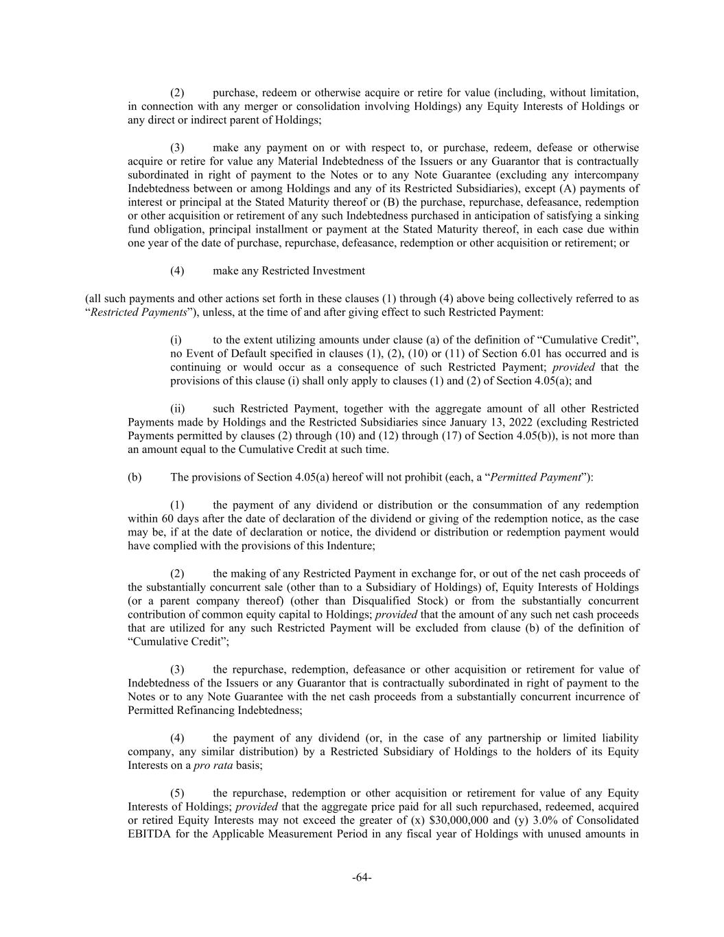 142 formed or acquired to merge into or consolidate with the Borrower or any of the Restricted Subsidiaries (to the extent such merger or consolidation is permitted under Section 6.03) in order to consummate such Investment, in each case in accordance with the requirements of Sections 5.11 and 5.12; (E) the proceeds of which shall be used to pay (or to make Restricted Payments to allow any direct or indirect parent thereof to pay) fees and expenses related to any equity or debt offering permitted by this Agreement; and (F) the proceeds of which shall be used to make payments permitted by clause (b)(iv) of this Section 6.08; (viii) in addition to the foregoing Restricted Payments, the Borrower may make additional Restricted Payments in an aggregate amount not to exceed the Cumulative Credit; provided, that clause (b) of the definition of “Cumulative Credit” may only be used if no Specified Event of Default shall have occurred and be continuing or would result therefrom; (ix) redemptions in whole or in part of any of its Equity Interests for another class of its Equity Interests or with proceeds from substantially concurrent equity contributions or issuances of new Equity Interests; provided that such new Equity Interests contain terms and provisions at least as advantageous to the Lenders in all respects material to their interests as those contained in the Equity Interests redeemed thereby; (x) so long as no Specified Event of Default has occurred and is continuing or would be caused thereby, Holdings, the Borrower and each Restricted Subsidiary may make additional Restricted Payments; provided that after giving effect to any such Restricted Payment, the aggregate amount of Restricted Payments made in reliance on this clause (x) after the First Amendment Effective Date shall not exceed the greater of $300,000,000 and 30% of Consolidated EBITDA calculated on a Pro Forma Basis for the Test Period most recently ended for which financial statements are available prior to the making of such Restricted Payment; (xi) so long as no Specified Event of Default has occurred and is continuing or would be caused thereby, Holdings, the Borrower and each Restricted Subsidiary may make unlimited Restricted Payments; provided that after giving effect to any such Restricted Payment, the Net First Lien Leverage Ratio calculated on a Pro Forma Basis as of the end of the most recent Test Period for which financial statements are available does not exceed 2.00 to 1.00; and (xii) any consideration, payment, dividend, distribution or other transfer in connection with a Permitted Securitization Financing or a receivables financing may be made. (b) Neither Holdings nor the Borrower will, nor will they permit any Restricted Subsidiary to, make or agree to pay or make, directly or indirectly, any payment or other distribution (whether in cash, securities or other property) of or in respect of principal of or interest on any Junior Financing constituting Material Indebtedness more than six (6) months prior to the maturity thereof, or any payment or other distribution (whether in cash, securities or other property), including any sinking fund or similar deposit, on account of the purchase, redemption, retirement, acquisition, cancellation or termination of any Junior Financing constituting Material Indebtedness, in each case, more than six (6) months prior to the maturity thereof, or any other payment (including the application of any payment received under any Swap Agreement in respect of any Junior Financing) that has a substantially similar effect to any of the foregoing, except: