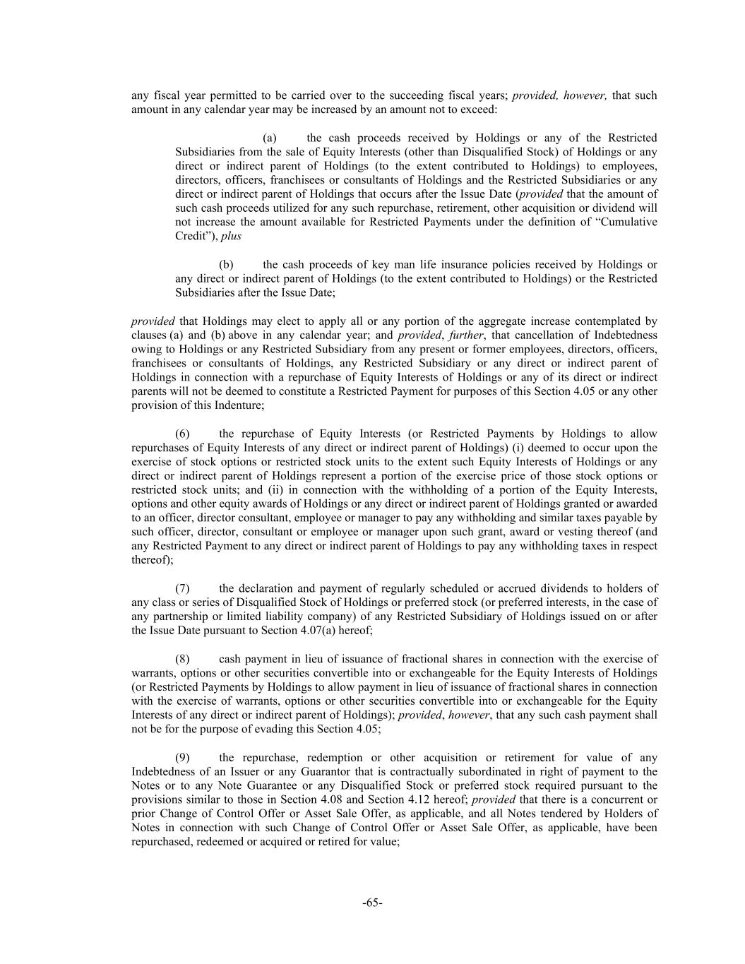 140 effectively cap, collar or exchange interest rates (from fixed to floating rates, from one floating rate to another floating rate or otherwise) with respect to any interest-bearing liability or investment of Holdings, the Borrower or any Restricted Subsidiary; provided that any Swap Agreement entered into pursuant to this clause (a) shall be entered into in the ordinary course of business and not for speculative purposes and (b) Swap Agreements entered into in the ordinary course trading business of the Borrower or any Restricted Subsidiary. Section 6.08. Restricted Payments; Certain Payments of Indebtedness. (a) Neither Holdings nor the Borrower will, nor will they permit any Restricted Subsidiary to declare or make, or agree to pay or make, directly or indirectly, any Restricted Payment, except: (i) each Restricted Subsidiary may make Restricted Payments to the Borrower or any other Restricted Subsidiary; (ii) Holdings, the Borrower and each Restricted Subsidiary may declare and make dividend payments or other distributions payable solely in the Equity Interests of such Person; provided that in the case of any such Restricted Payment by a Restricted Subsidiary that is not a Wholly Owned Subsidiary of the Borrower, such Restricted Payment is made to the Borrower, any Restricted Subsidiary and to each other owner of Equity Interests of such Restricted Subsidiary based on their relative ownership interests of the relevant class of Equity Interests; (iii) so long as no Specified Event of Default has occurred and is continuing or would be caused thereby, the payment of quarterly distributions or dividends in an amount not to exceed the Specified Dividend Amount during any fiscal quarter that commences after the Closing, commencing with the fiscal quarter in which the First Amendment Effective Date occurs; provided that for the avoidance of doubt, unused amounts with respect to any such fiscal quarter shall not be available in any other fiscal quarter; (iv) repurchases of Equity Interests in Holdings (or Restricted Payments by Holdings to allow repurchases of Equity Interests in any direct or indirect parent of Holdings), the Borrower or any Restricted Subsidiary deemed to occur upon the exercise of stock options or warrants if such Equity Interests represent a portion of the exercise price of such options or warrants; (v) Holdings may redeem, acquire, retire or repurchase its Equity Interests (or any options or warrants or stock appreciation rights issued with respect to any of such Equity Interests) (or make Restricted Payments to allow any of Holdings’ direct or indirect parent companies or any Employee Holding Vehicle to so redeem, retire, acquire or repurchase Equity Interests of Holdings or such entity) held by current or former officers, managers, consultants, directors and employees or their permitted transferees (or their respective estates, executors, trustees, administrators, heirs, legatees or distributes) of Holdings (or any direct or indirect parent thereof), the Borrower and the Restricted Subsidiaries, or held by any Employee Holding Vehicle for the benefit of any of the foregoing, upon the death, disability, retirement or termination of employment of any such Person or otherwise in accordance with any stock option or stock appreciation rights plan, any management, director and/or employee stock ownership or incentive plan, stock subscription plan, employment termination agreement or any other employment agreements or equity holders’ agreement, in an aggregate amount after the ClosingFirst Amendment Effective Date together with the aggregate amount of loans and advances to Holdings made pursuant to Section 6.04(k) in lieu of Restricted Payments permitted by this clause (v) not to exceed $30,000,000 in calendar year 2021 and $15,000,000 in any calendar year thereafter, with unused amounts in any calendar year being carried over to succeeding calendar years subject to a maximum of $45,000,000 in any calendar year (without giving effect to the following proviso);
