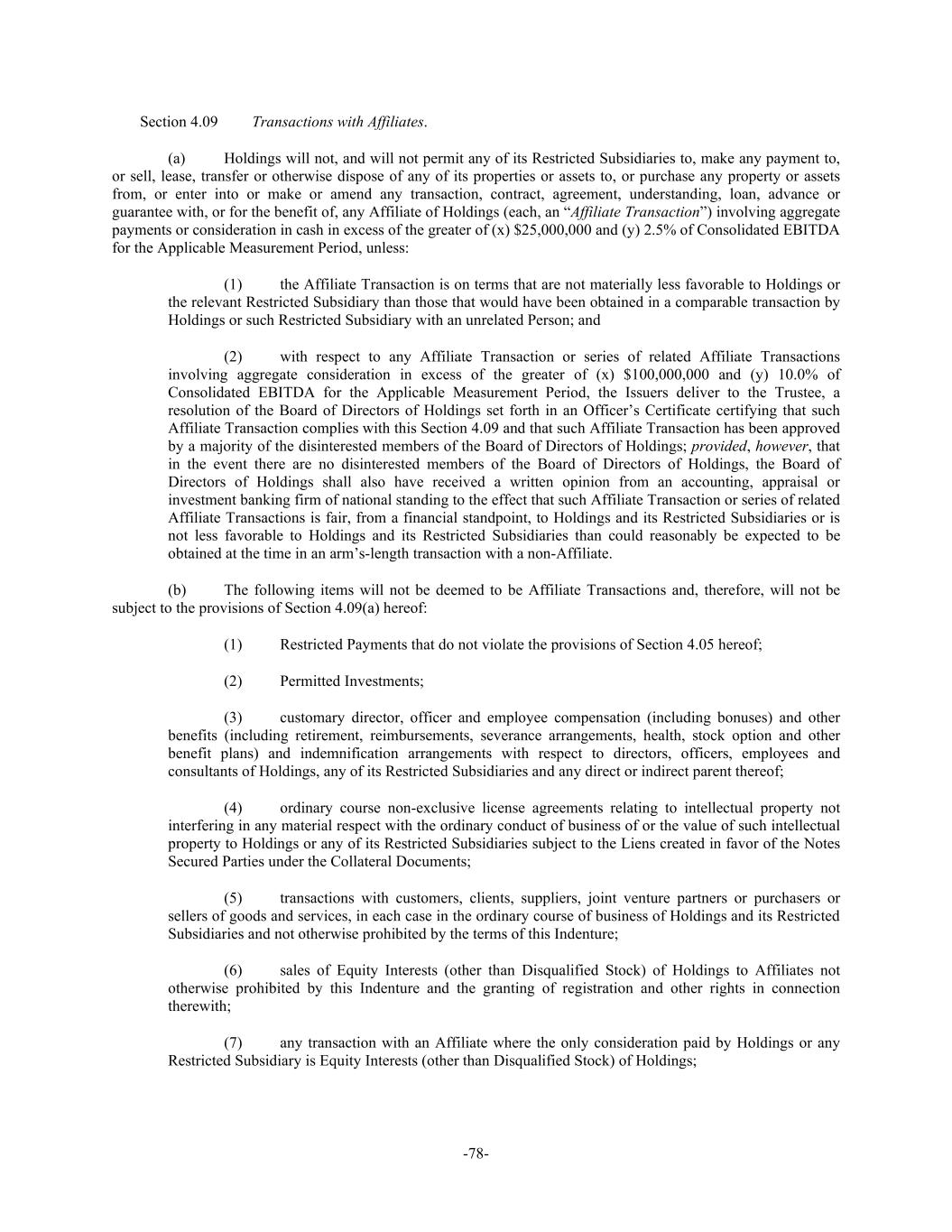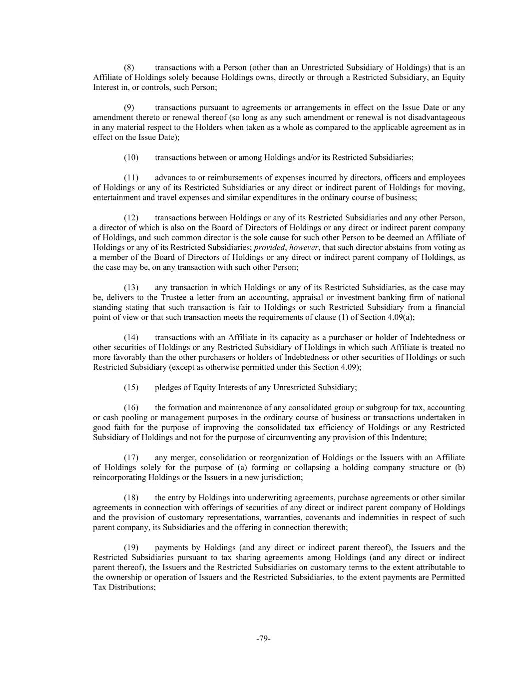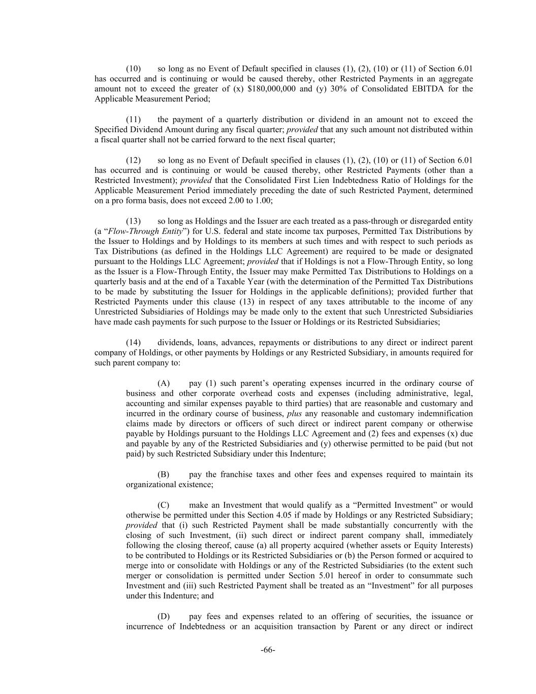 144 Restricted Subsidiaries and their respective officers and employees in the ordinary course of business (including loans and advances pursuant to Sections 6.04(b) and 6.04(o)), (f) payments by Holdings (and any direct or indirect parent thereof), the Borrower and the Restricted Subsidiaries pursuant to tax sharing agreements among Holdings (and any such parent thereof), the Borrower and the Restricted Subsidiaries on customary terms to the extent attributable to the ownership or operation of the Borrower and the Restricted Subsidiaries, to the extent payments are Permitted Tax Distributions, (g) the payment of customary fees and reasonable out-of-pocket costs to, and indemnities provided on behalf of, directors, officers and employees of Holdings, the Borrower and the Restricted Subsidiaries in the ordinary course of business to the extent attributable to the ownership or operation of Holdings, the Borrower and the Restricted Subsidiaries, (h) transactions pursuant to any permitted agreements in existence or contemplated on the ClosingFirst Amendment Effective Date and set forth on Schedule 6.09 or any amendment thereto to the extent such an amendment is not adverse to the Lenders in any material respect, (i) Restricted Payments permitted under Section 6.08, (j) Investments, loans or advances that are permitted to be made in lieu of Restricted Payments pursuant to Section 6.04, (k) transactions pursuant to any Permitted Securitization Financing or a receivables sale or financing and (l) any transaction in respect of which the Borrower delivers to the Administrative Agent a letter addressed to the sole member of the Borrower from an accounting, appraisal or investment banking firm, in each case of nationally recognized standing that is in the good faith determination of the Borrower qualified to render such letter, which letter states that (i) such transaction is on terms that are substantially no less favorable, when taken as a whole, to the Borrower or the applicable Subsidiary, as applicable, than would be obtained in a comparable arm’s-length transaction with a person that is not an Affiliate or (ii) such transaction is fair, when taken as a whole, to the Borrower or the applicable Subsidiary, as applicable, from a financial point of view. Section 6.10. Restrictive Agreements. Neither Holdings nor the Borrower will, nor will they permit any Restricted Subsidiary to, directly or indirectly, enter into, incur or permit to exist any agreement or other arrangement that prohibits, restricts or imposes any condition upon (a) the ability of Holdings, the Borrower or any other Subsidiary Loan Party to create, incur or permit to exist any Lien upon any of its property or assets to secure the Secured Obligations or (b) the ability of any Restricted Subsidiary that is not a Loan Party to pay dividends or other distributions with respect to any of its Equity Interests or to make or repay loans or advances to any Restricted Subsidiary or to Guarantee Indebtedness of any Restricted Subsidiary; provided that the foregoing clauses (a) and (b) shall not apply to any such restrictions that (i)(x) exist on the ClosingFirst Amendment Effective Date and (to the extent not otherwise permitted by this Section 6.10) are listed on Schedule 6.10 and (y) any renewal, extension, amendment, modification or replacement of a restriction permitted by clause (i)(x) or any agreement evidencing such restriction so long as such renewal, extension, amendment, modification or replacement does not materially expand the scope of such restrictions (as determined in good faith by the Borrower); (ii)(x) are binding on a Subsidiary at the time such Subsidiary first becomes a Subsidiary, so long as such restrictions were not entered into solely in contemplation of such Person becoming a Subsidiary and (y) any renewal, extension, amendment, modification or replacement of a restriction permitted by clause (ii)(x) or any agreement evidencing such restriction so long as such renewal or extension does not materially expand the scope of such restrictions (as determined in good faith by the Borrower); (iii) represent Indebtedness of a Restricted Subsidiary that is not a Loan Party that is permitted by Section 6.01; (iv) are customary restrictions that arise in connection with any Disposition permitted by Section 6.05 applicable pending such Disposition solely to the assets subject to such Disposition;