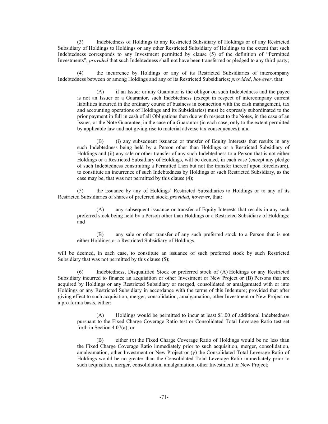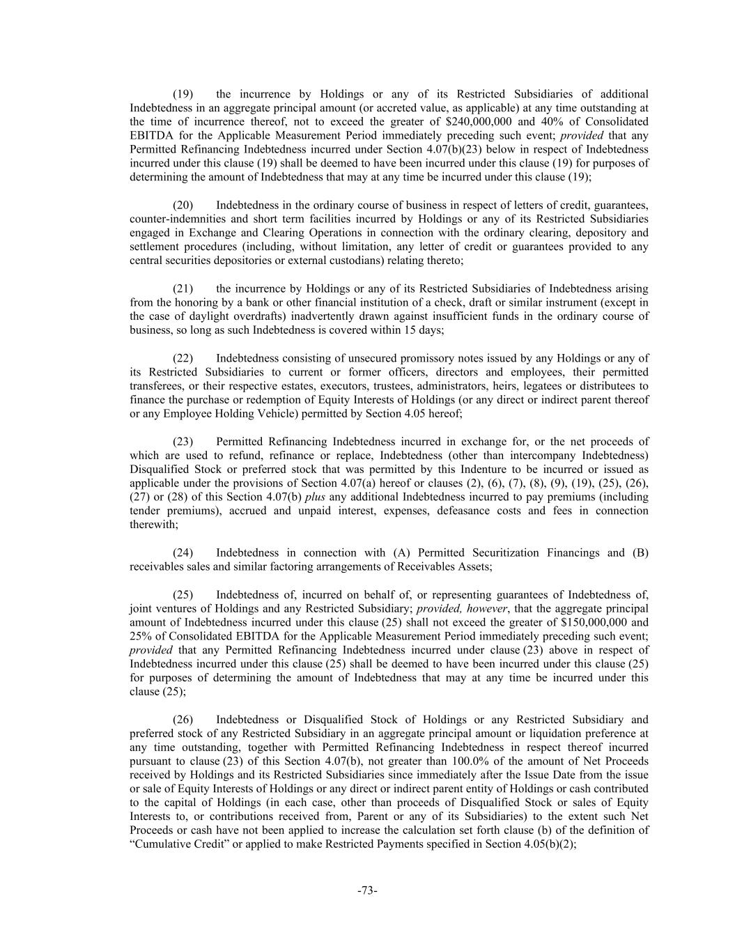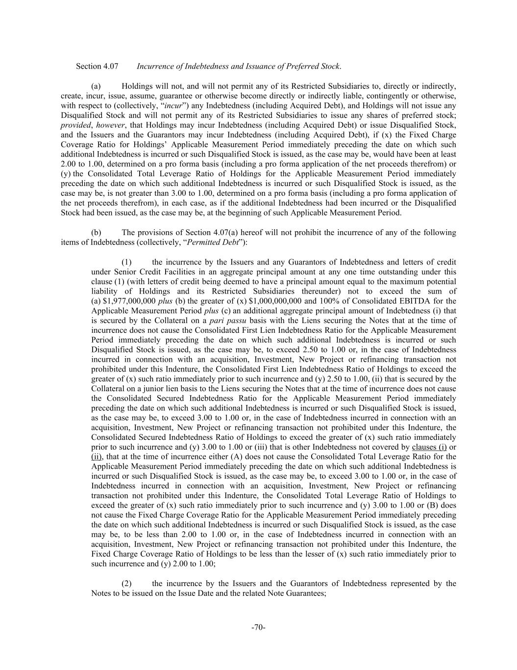 127 than provisions related to customary asset sale and change of control offers) that would result in prepayments of such Indebtedness prior to the Initial Term B-1 Loans; provided, however, that if such Indebtedness is secured on a pari passu basis with the Initial Term B-1 Loans, such Indebtedness may have mandatory prepayment provisions that provide for pro rata or less than pro rata (but not greater than pro rata) prepayments with the Initial Term B-1 Loans; provided that at the time of incurrence thereof, the aggregate outstanding principal amount of Indebtedness (other than Indebtedness constituting any revolving facility) incurred by Restricted Subsidiaries that are not Loan Parties or Regulated Subsidiaries under this Section 6.01(a)(xxii), together with the Indebtedness incurred by Restricted Subsidiaries that are not Loan Parties or Regulated Subsidiaries under clauses (x), (y) and (z) of Section 6.01(a)(viii) and clauses (x), (y) and (z) of Section 6.01(a)(viii), collectively, shall not exceed the greater of $150,000,000 and 10% of Consolidated EBITDA calculated on a Pro Forma Basis for the most recently ended Test Period for which financial statements are available, and (B) any Permitted Refinancing thereof; (xxiii) Trading Debt incurred in the ordinary course of business or in a manner consistent with past practices; (xxiv) (A) Indebtedness of Joint Ventures and/or Indebtedness incurred on behalf thereof or representing Guarantees of Indebtedness of Joint Ventures; provided that at the time of the incurrence thereof and after giving Pro Forma Effect thereto and the use of proceeds thereof, the aggregate principal amount of Indebtedness outstanding in reliance on this clause (xxiv), together with the aggregate principal amount of Indebtedness outstanding in reliance on clause (xxv) below, shall not exceed the greater of $250,000,000 and 25% of Consolidated EBITDA calculated on a Pro Forma Basis for the most recently ended Test Period for which financial statements are available and (B) any Permitted Refinancing thereof; (xxv) (A) Indebtedness of a Restricted Subsidiary that is not a Loan Party; provided that at the time of the incurrence thereof and after giving Pro Forma Effect thereto and the use of proceeds thereof, the aggregate principal amount of Indebtedness outstanding in reliance on this clause (xxv), together with the aggregate principal amount of Indebtedness outstanding in reliance on clause (xxiv) above, shall not exceed the greater of $300,000,000 and 30% of Consolidated EBITDA calculated on a Pro Forma Basis for the most recently ended Test Period for which financial statements are available and (B) any Permitted Refinancing thereof; (xxvi) additional Indebtedness of Holdings, the Borrower or any Restricted Subsidiary; provided that at the time of the incurrence thereof and after giving Pro Forma Effect thereto and the use of the proceeds thereof, the aggregate principal amount of such Indebtedness incurred shall not exceed the Available RP Capacity Amount at such time; (xxvii) Indebtedness in connection with Permitted Securitization Financings; and (xxviii) all premiums (if any), interest (including post-petition interest and capitalized or paid in kind interest), fees, expenses, charges and additional or contingent interest on obligations described in clauses (i) through (xxvii) above. (b) Neither Holdings nor the Borrower will, nor will they permit any Restricted Subsidiary to, issue any preferred Equity Interests or any Disqualified Equity Interests, except (A) in the case of Holdings, preferred Equity Interests that are Qualified Equity Interests and (B) in the case of the Borrower or any Restricted Subsidiary, preferred Equity Interests issued to and held by Holdings, the Borrower or any Restricted Subsidiary.